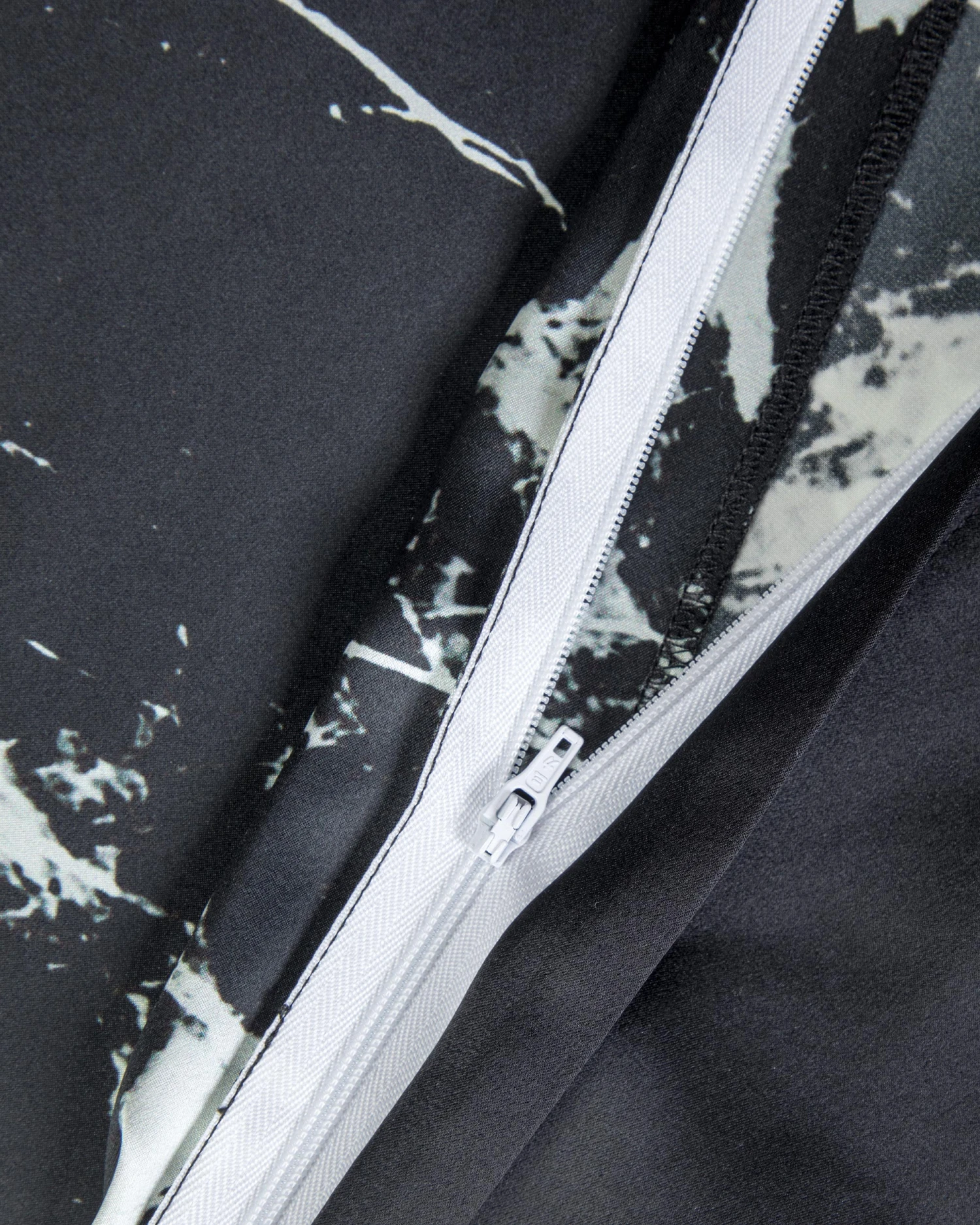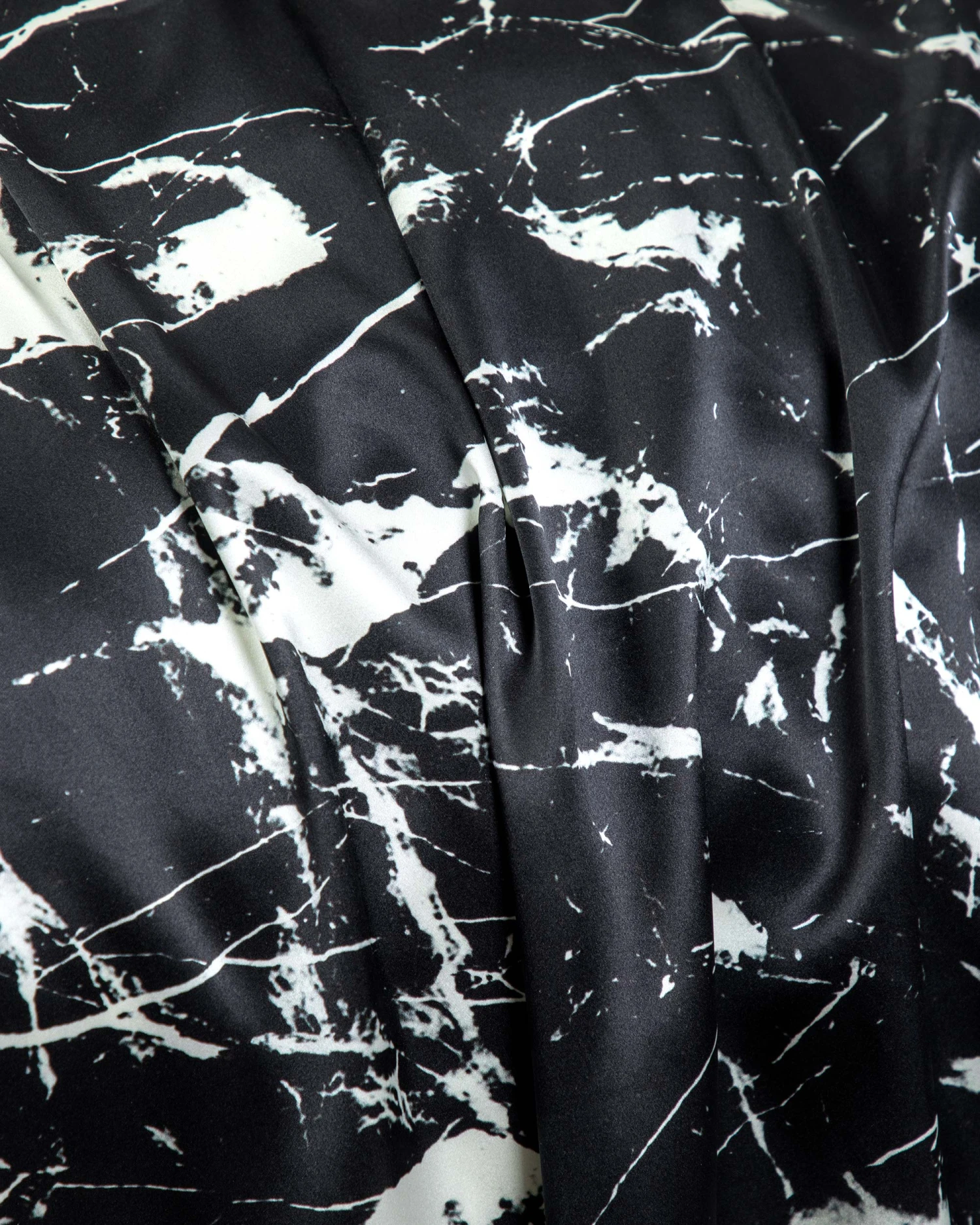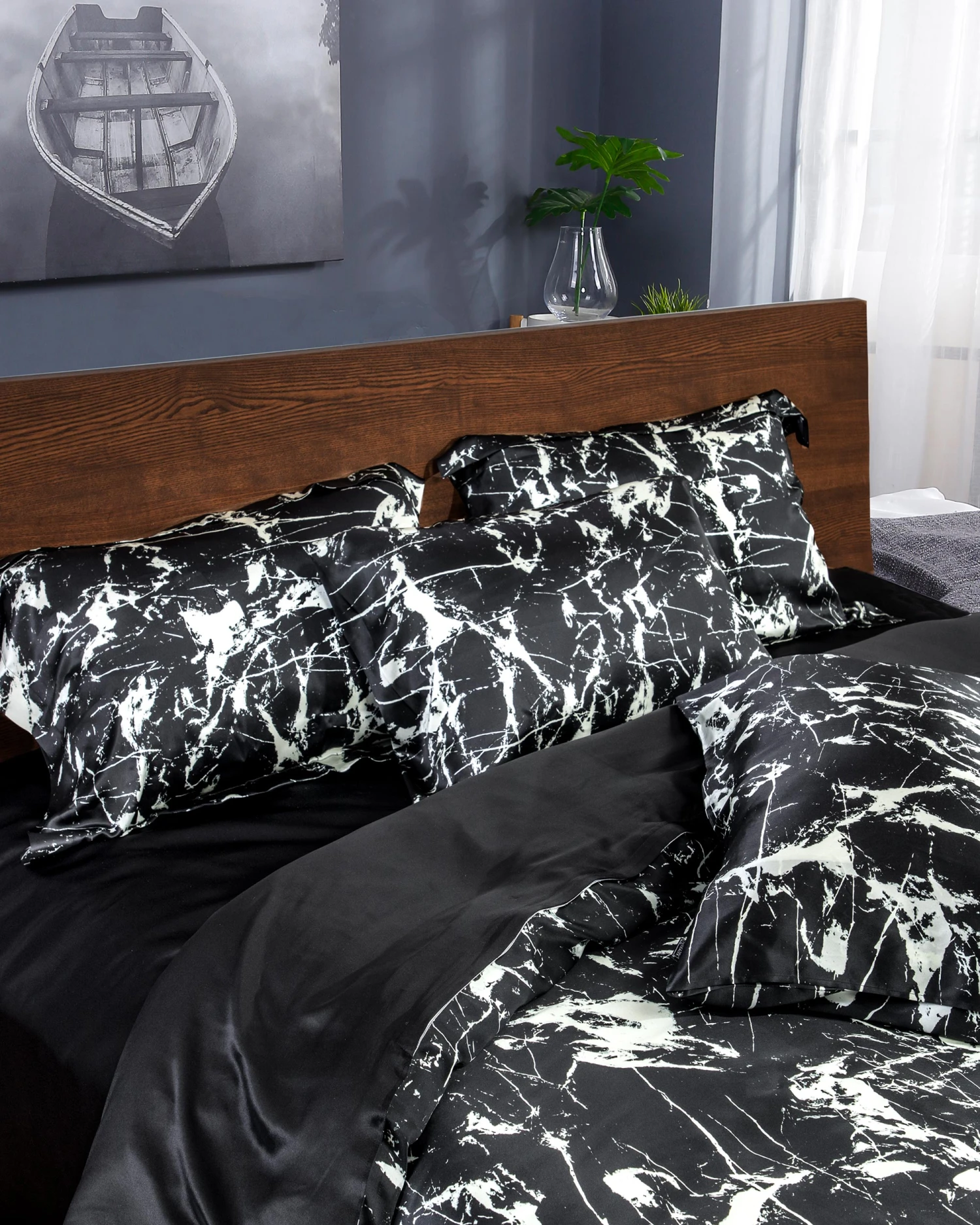 This duvet cover set contains: 1 pc 19 momme black marbling printed silk duvet cover; 2 pcs 19 momme black marbling-printed terse silk pillowcases.