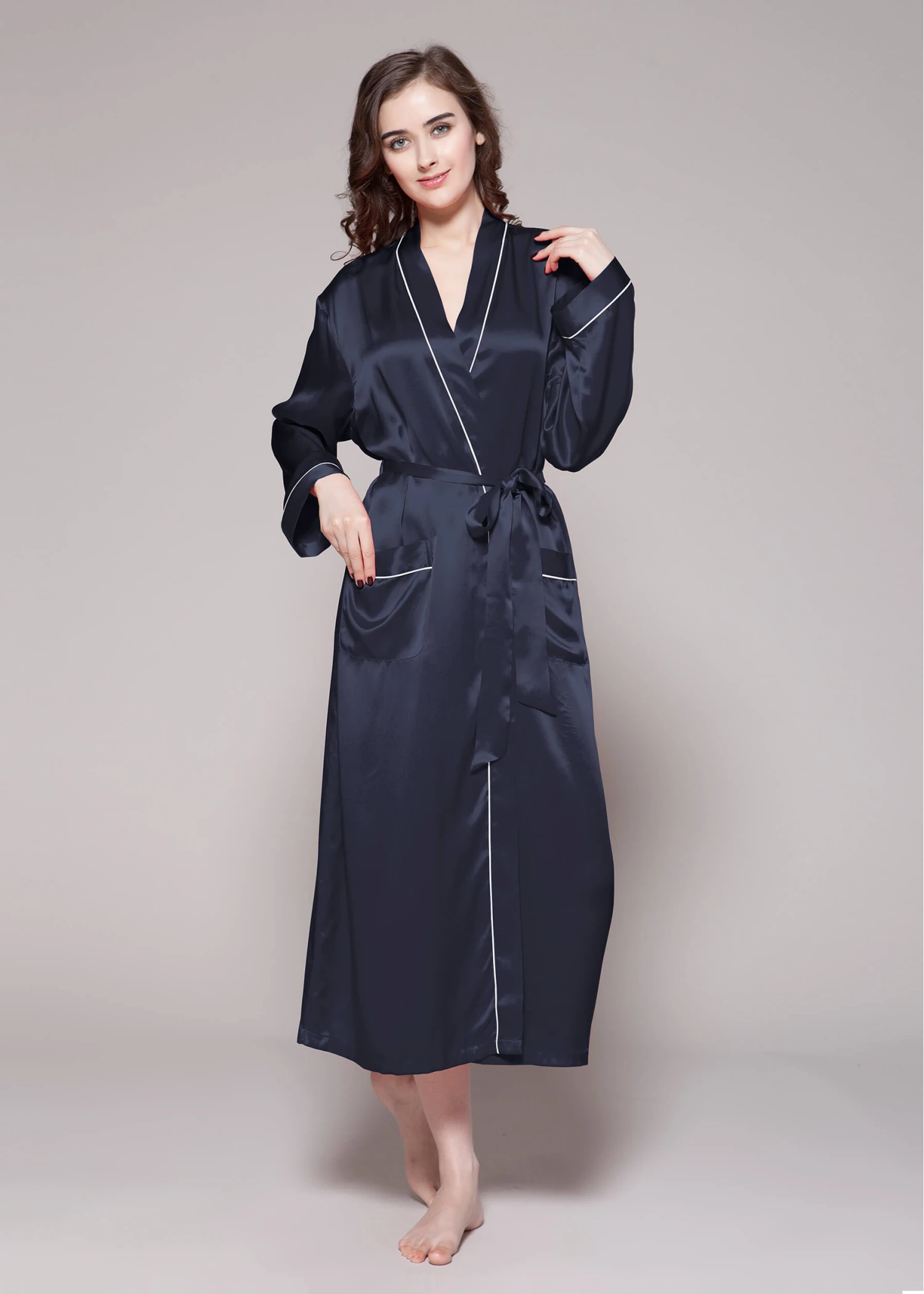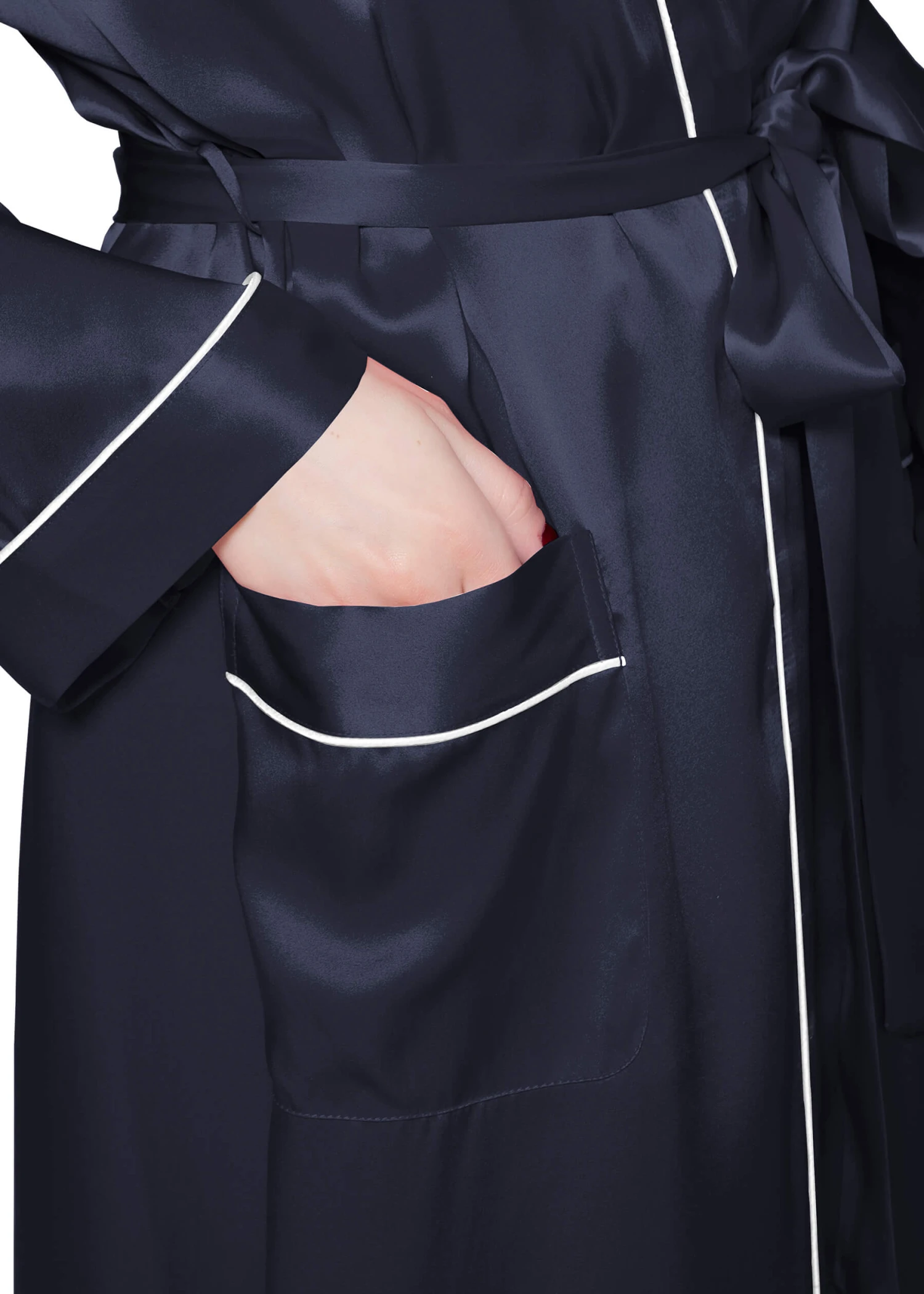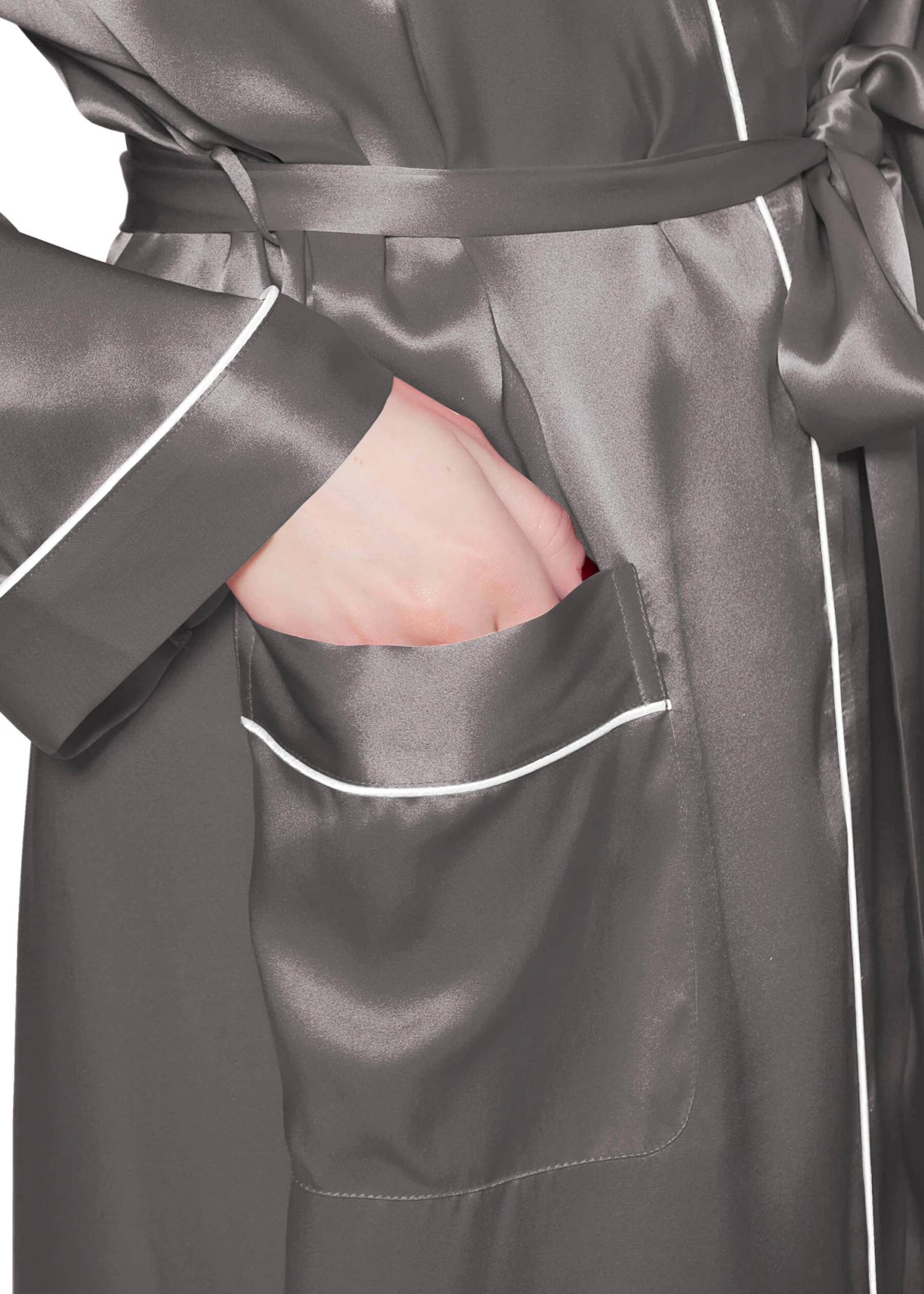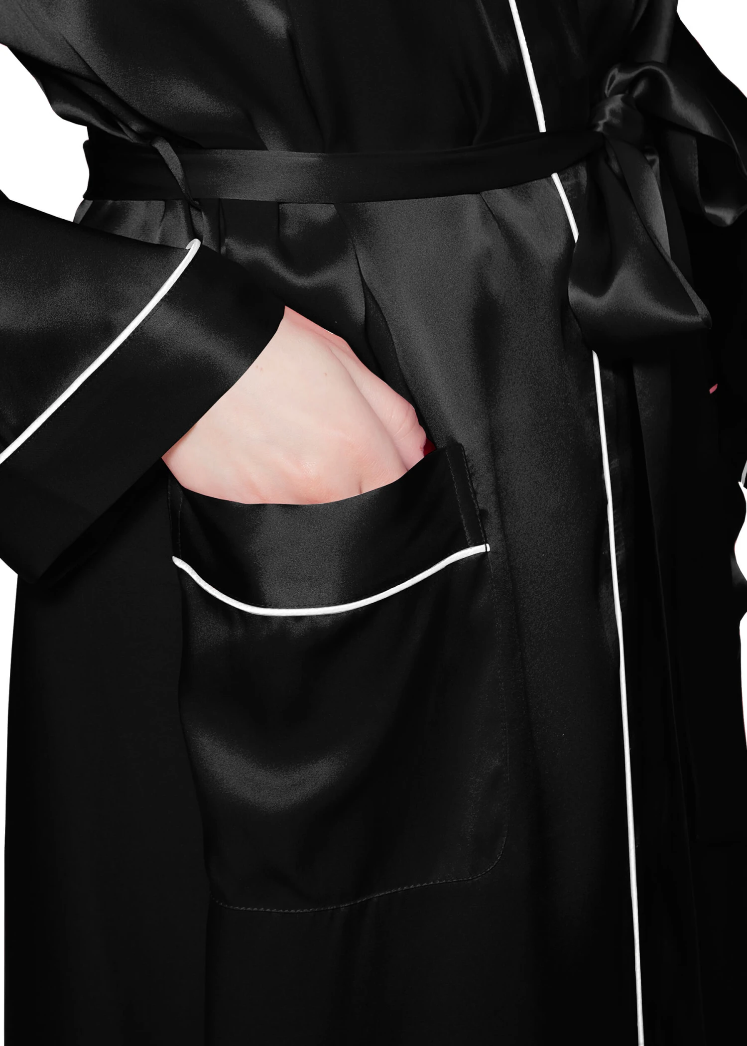 Wrap yourself in luxury in the Contrast Trim Full-Length Silk Robe. This full-length robe is soft and comforting and made from smooth silk. Featuring a contrasting piped trim along the collar, pockets, and cuffs for a sophisticated update of a classic item. Wear this to ensure maximum comfort at all times, today and forevermore.