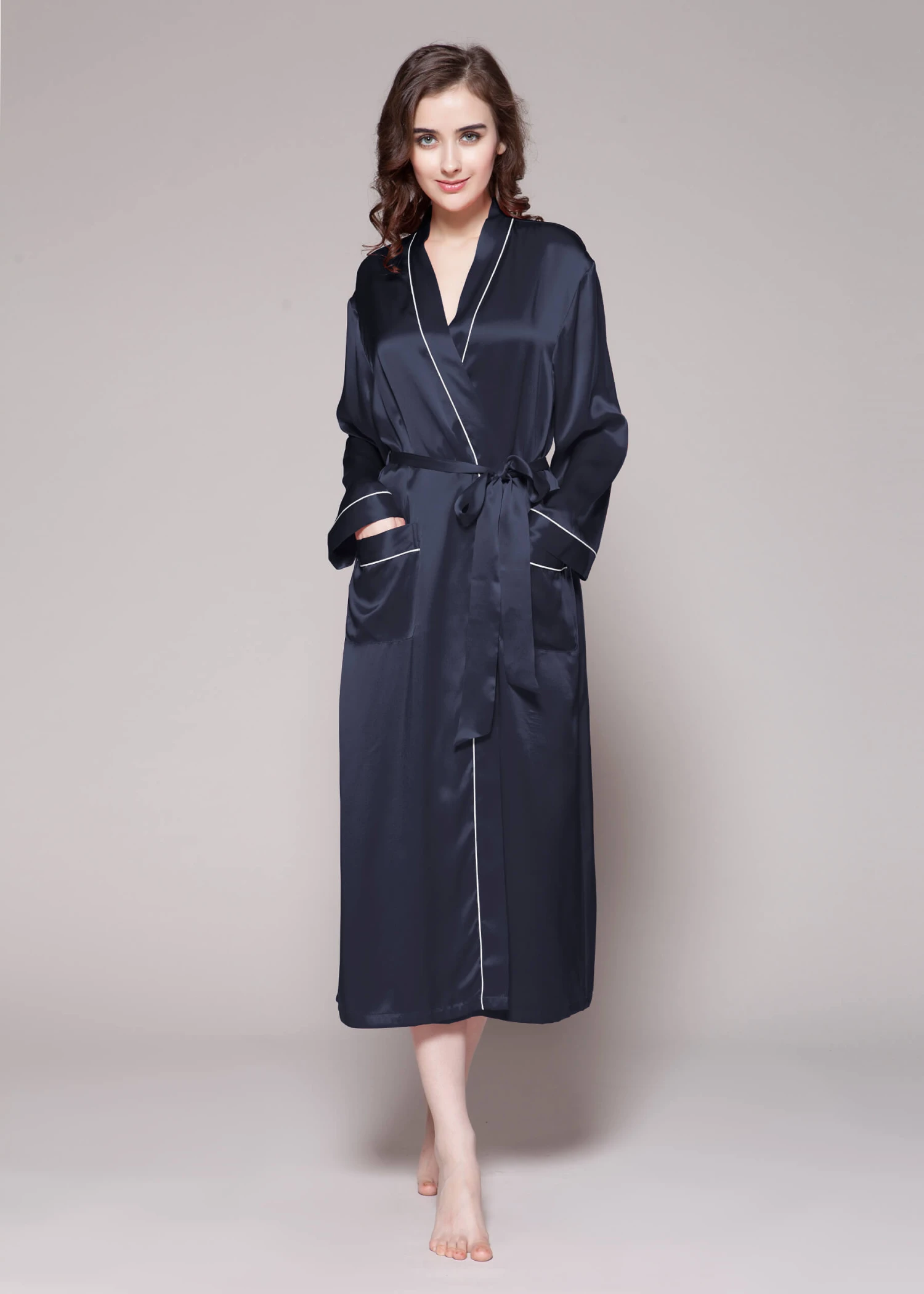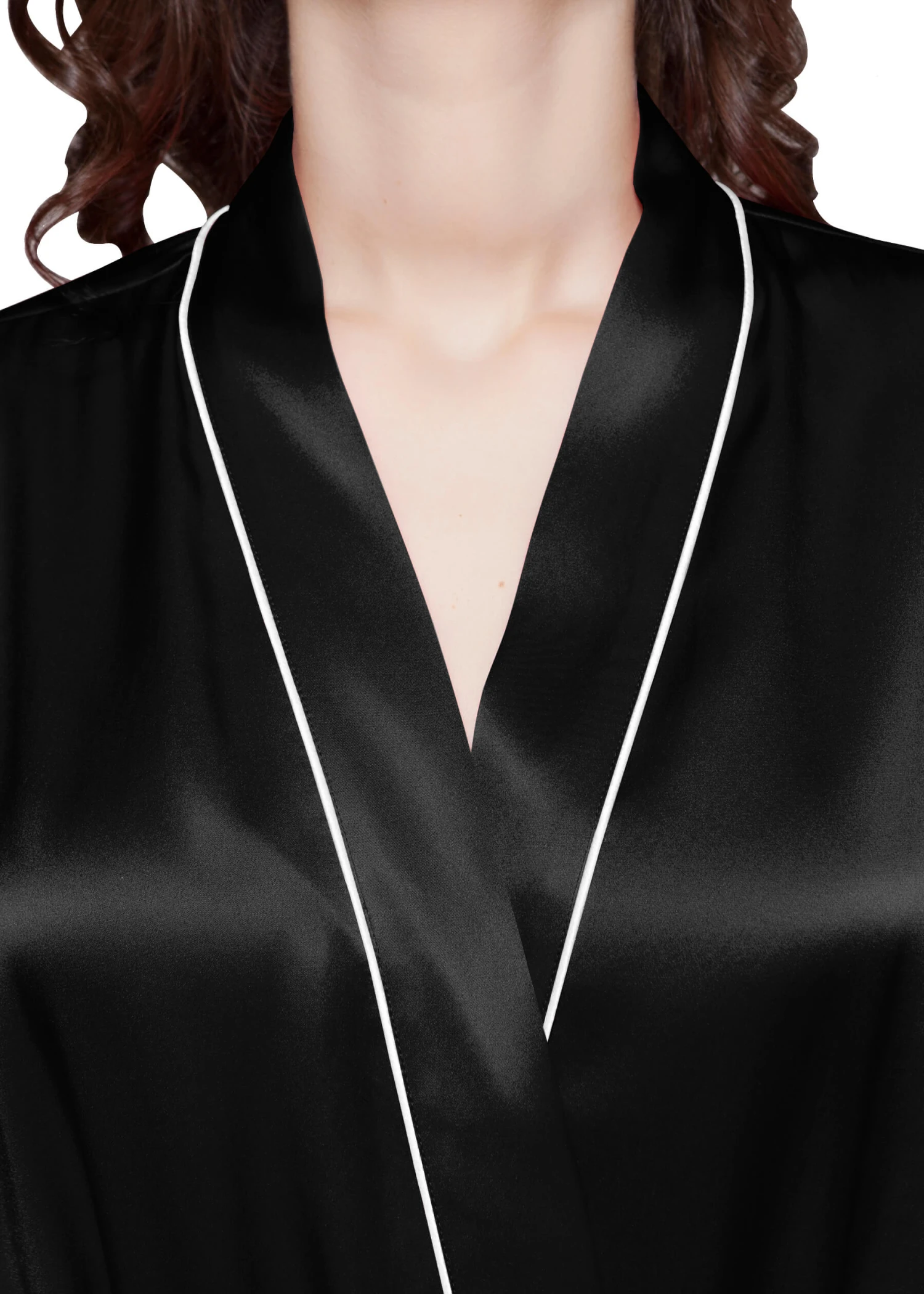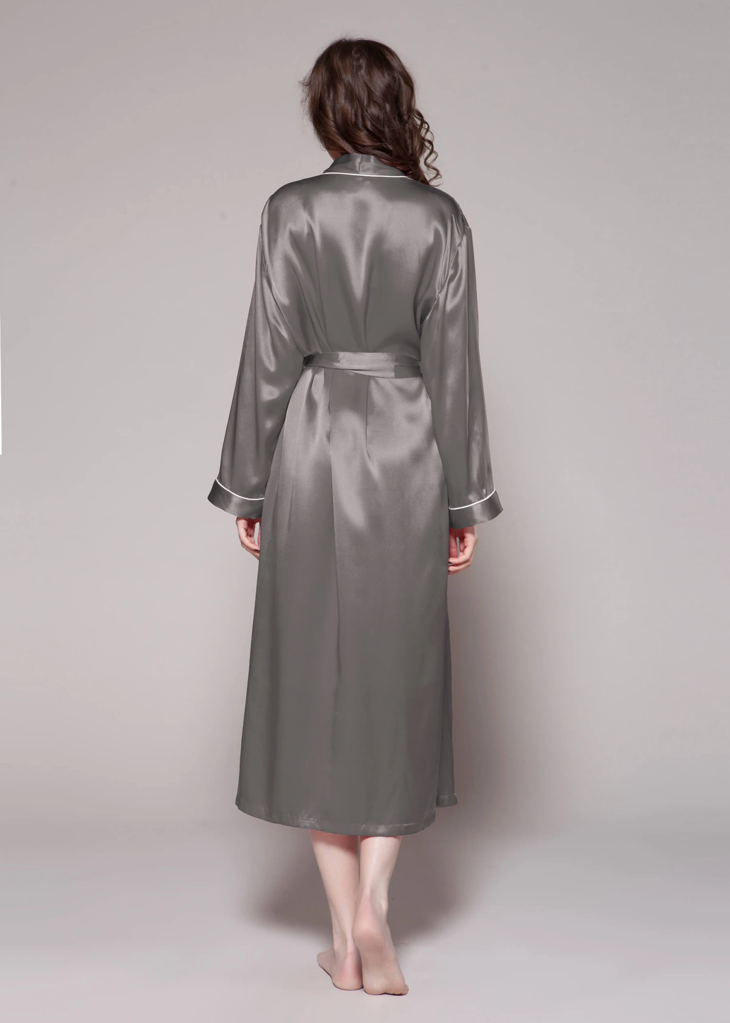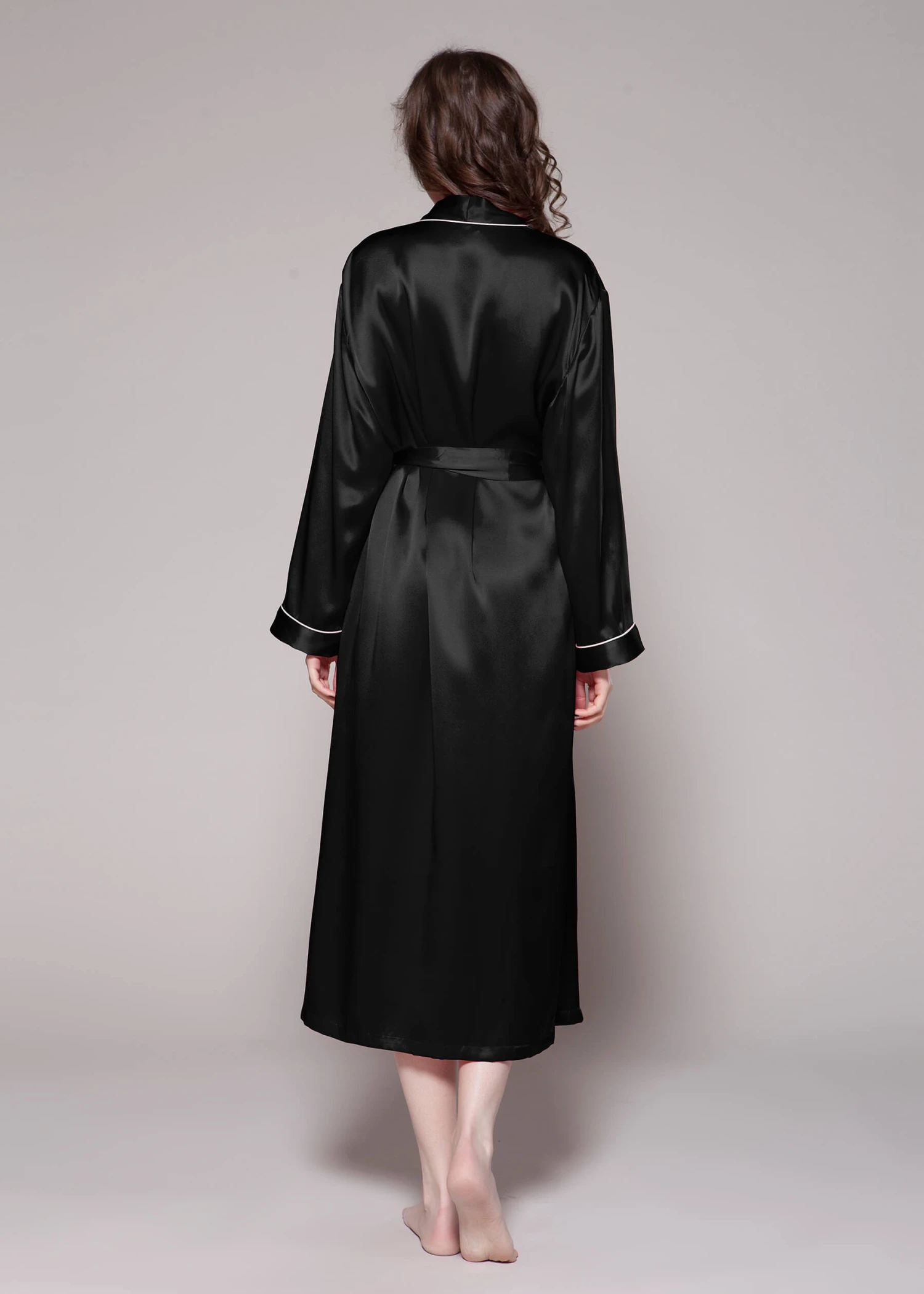 Wrap yourself in luxury in the Contrast Trim Full-Length Silk Robe. This full-length robe is soft and comforting and made from smooth silk. Featuring a contrasting piped trim along the collar, pockets, and cuffs for a sophisticated update of a classic item. Wear this to ensure maximum comfort at all times, today and forevermore.