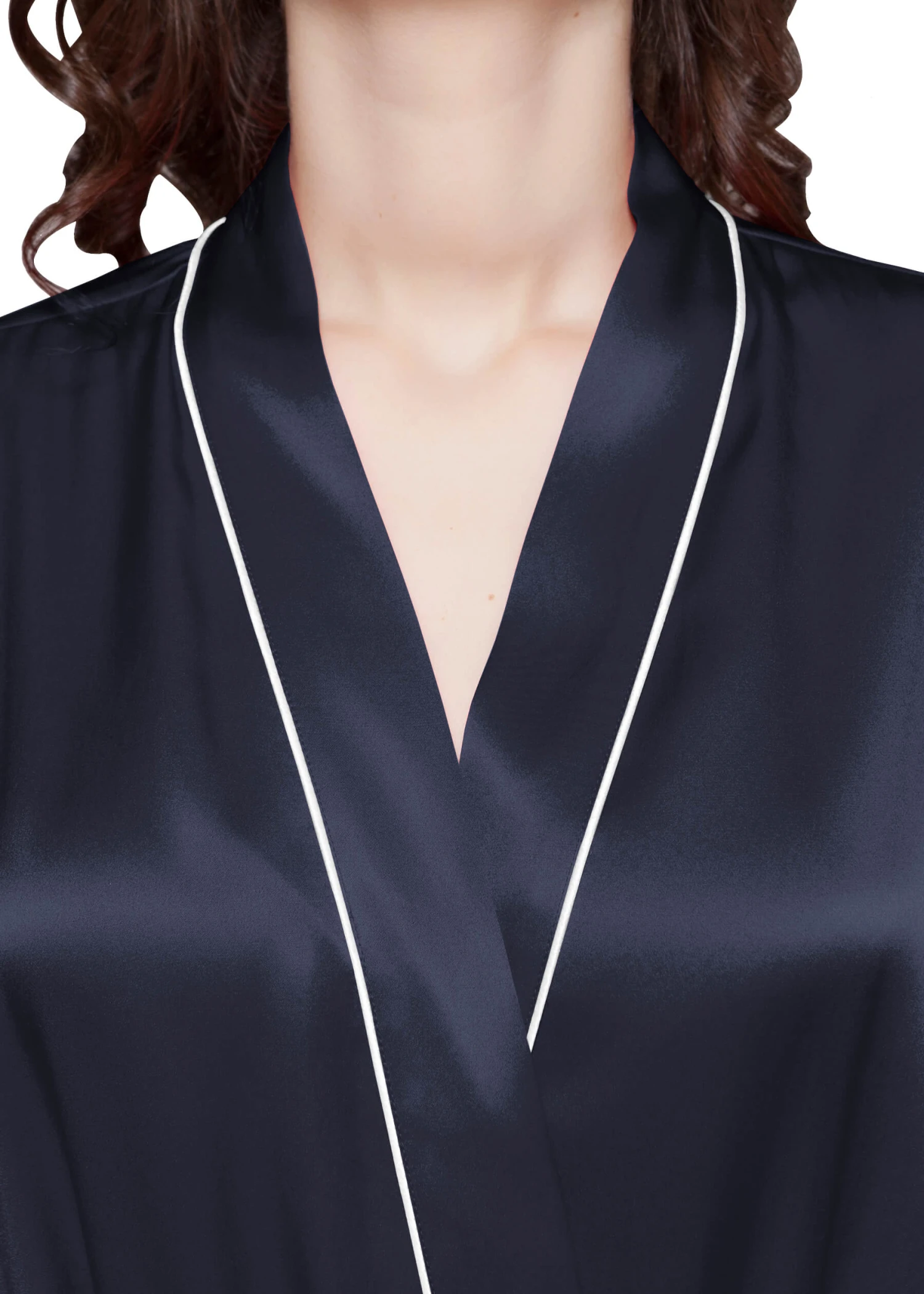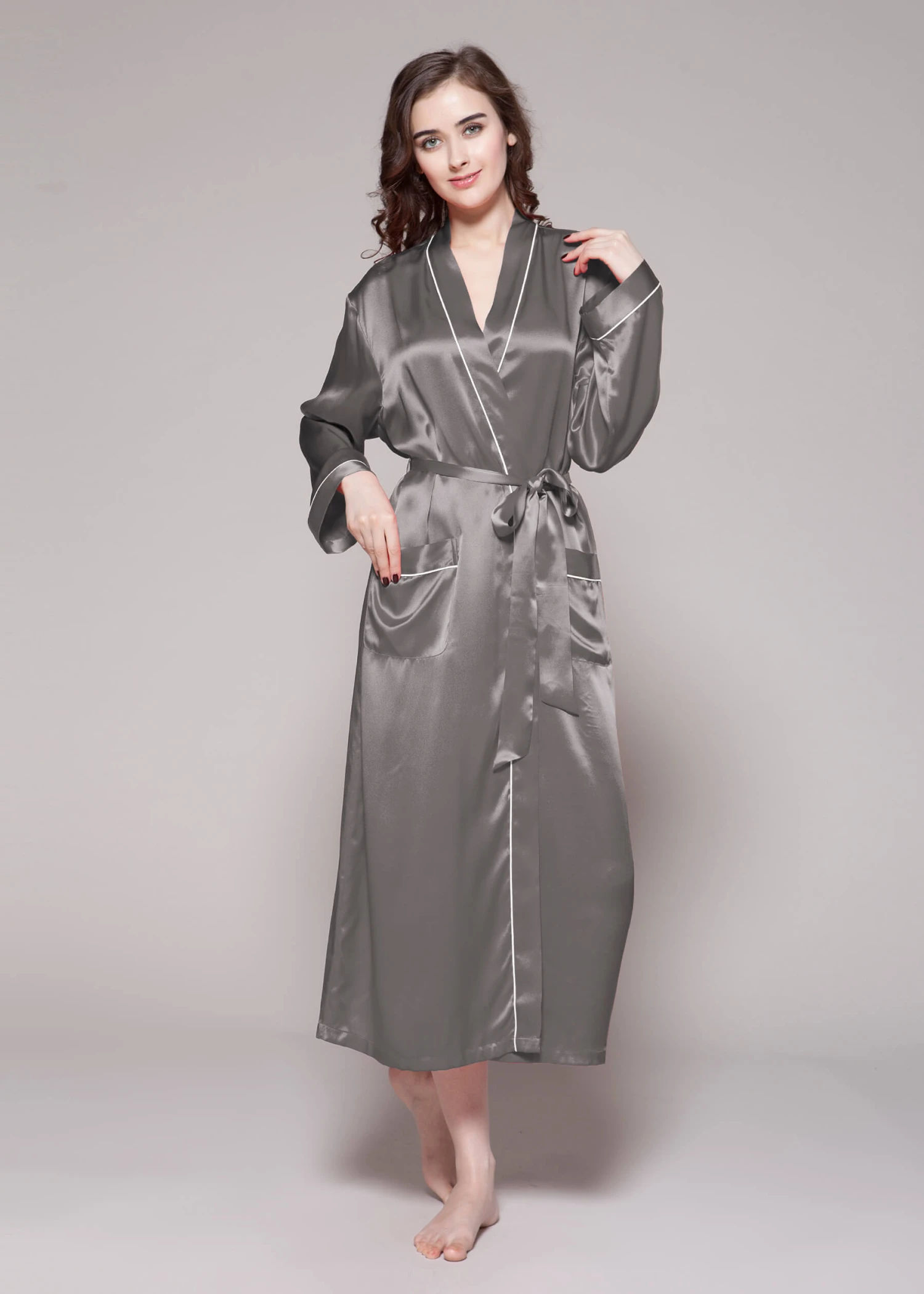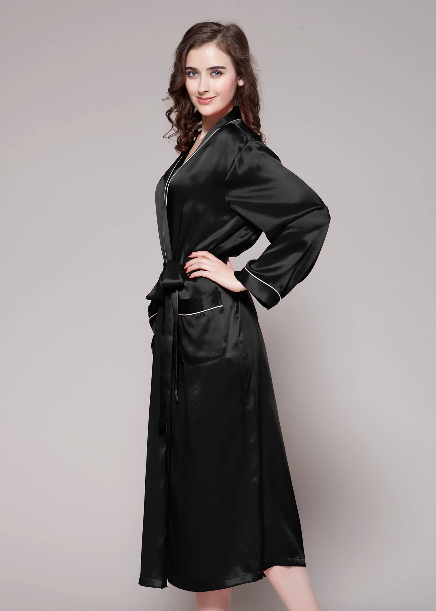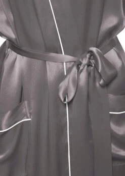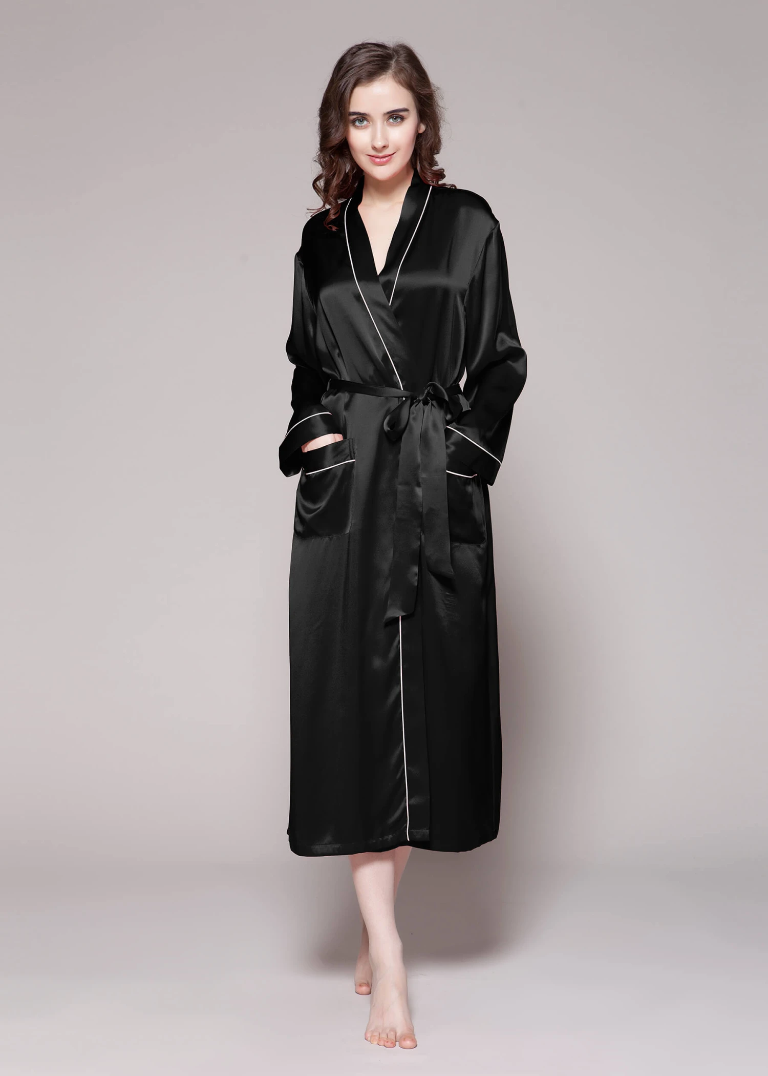 Wrap yourself in luxury in the Contrast Trim Full-Length Silk Robe. This full-length robe is soft and comforting and made from smooth silk. Featuring a contrasting piped trim along the collar, pockets, and cuffs for a sophisticated update of a classic item. Wear this to ensure maximum comfort at all times, today and forevermore.