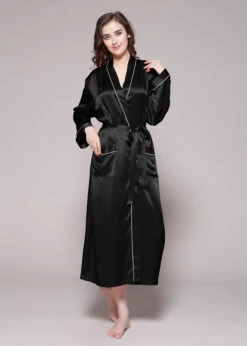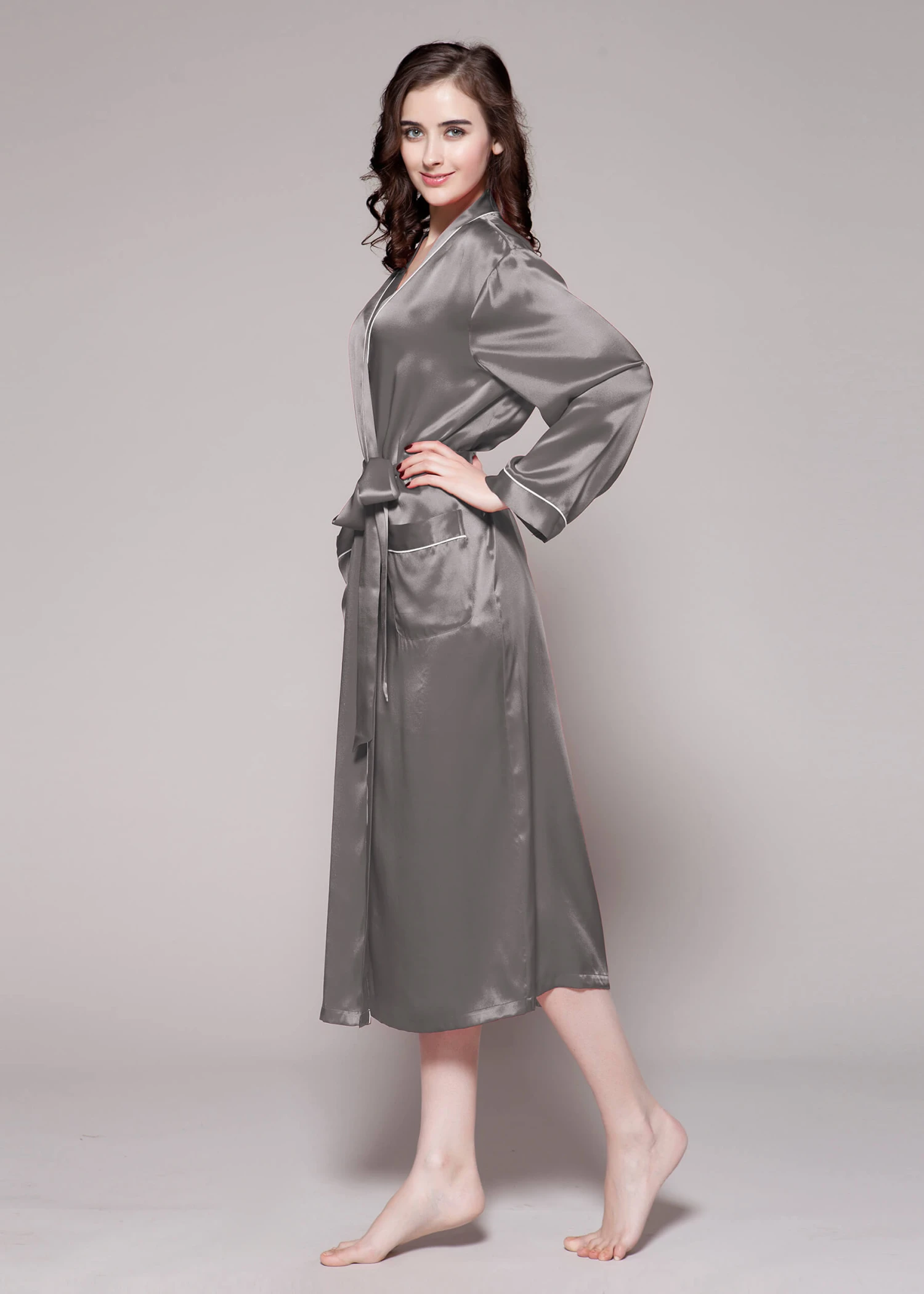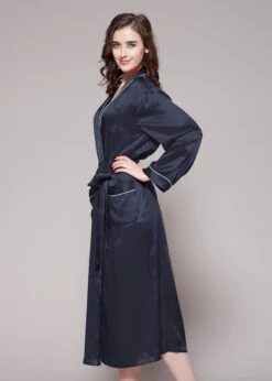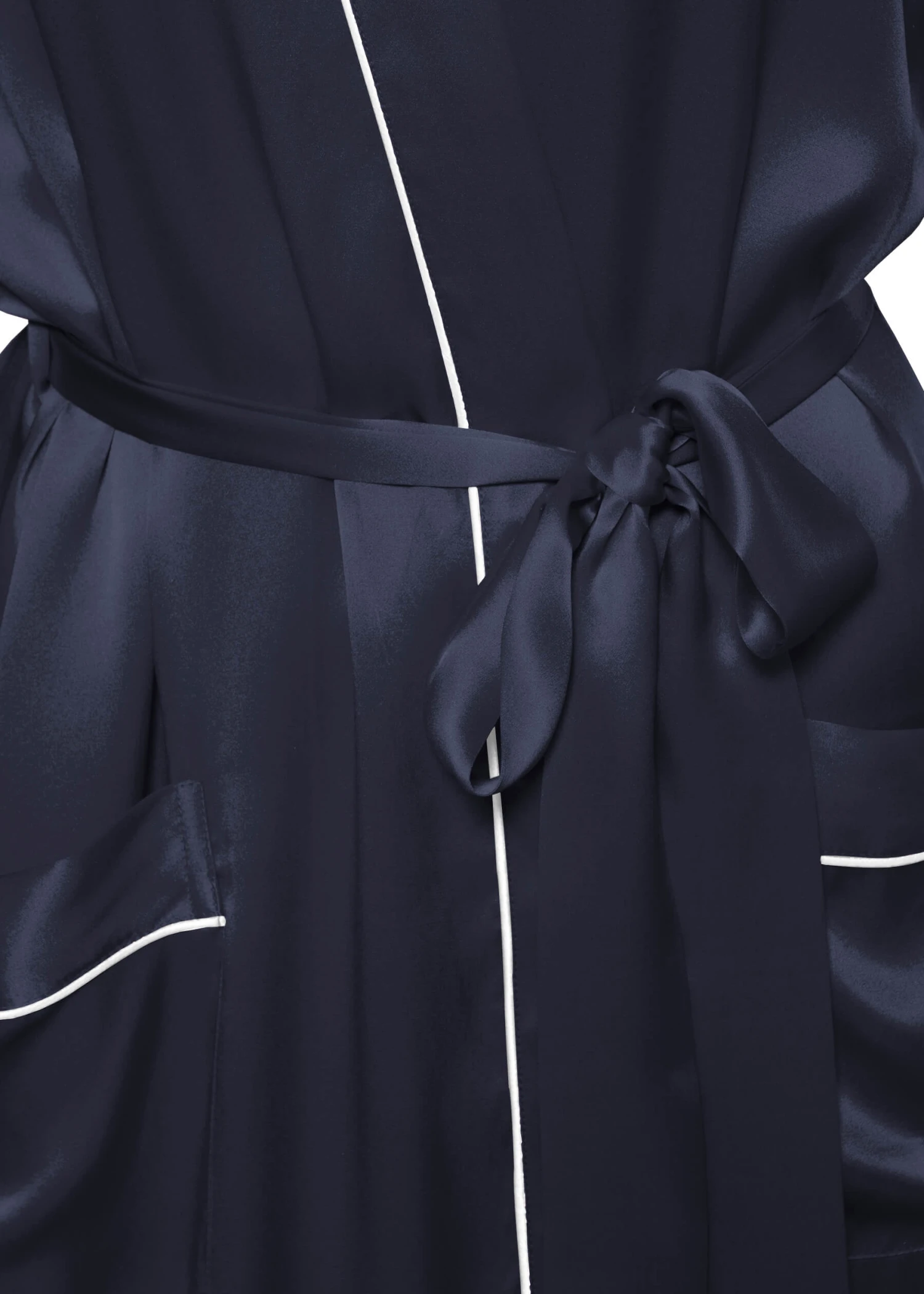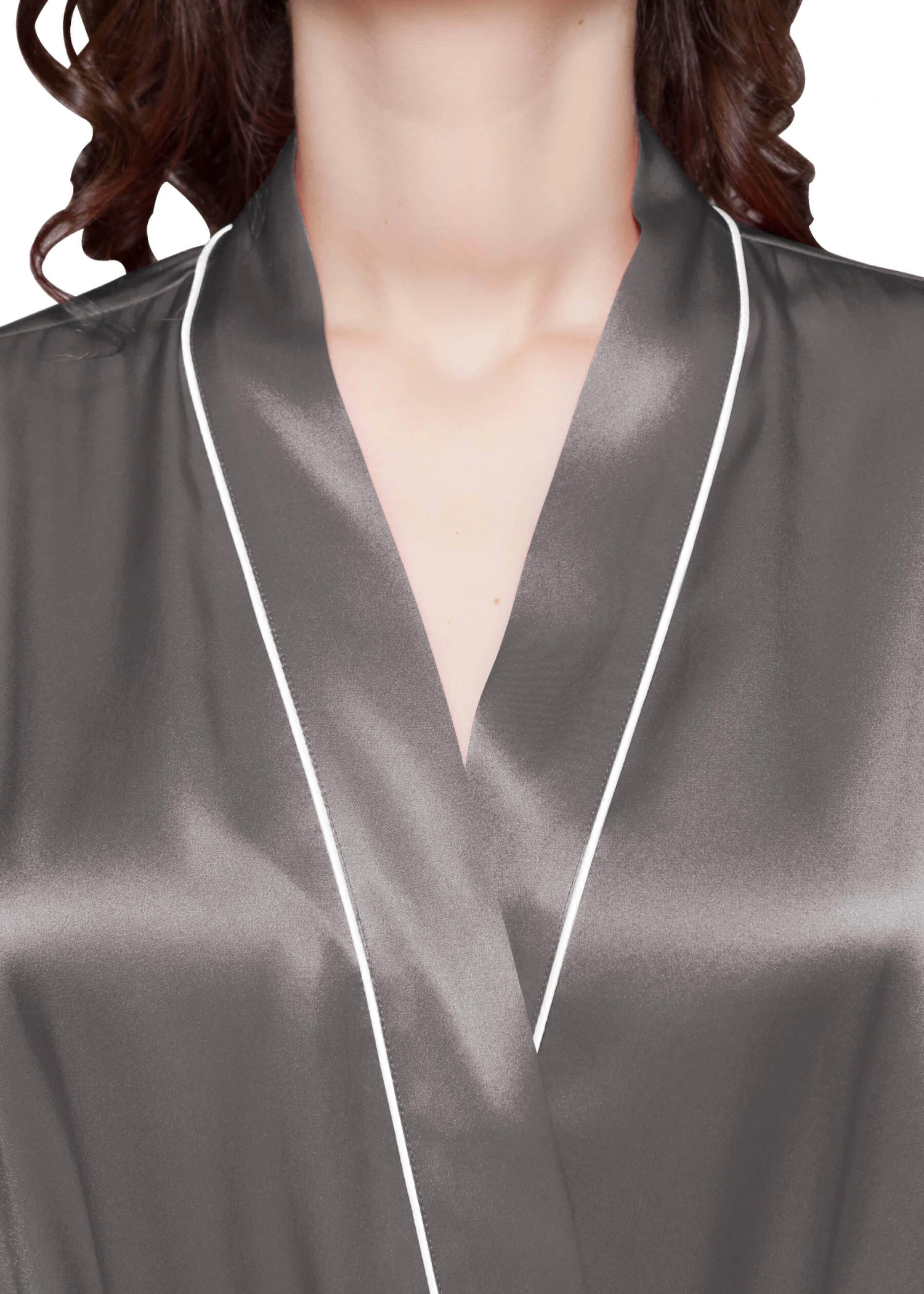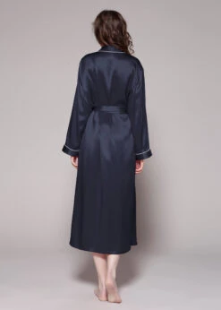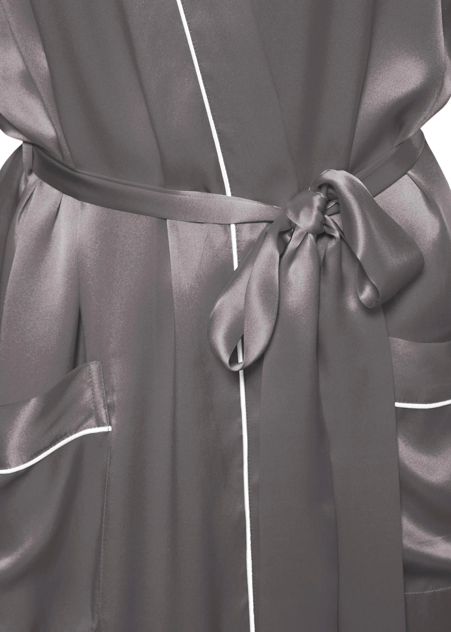 Wrap yourself in luxury in the Contrast Trim Full-Length Silk Robe. This full-length robe is soft and comforting and made from smooth silk. Featuring a contrasting piped trim along the collar, pockets, and cuffs for a sophisticated update of a classic item. Wear this to ensure maximum comfort at all times, today and forevermore.