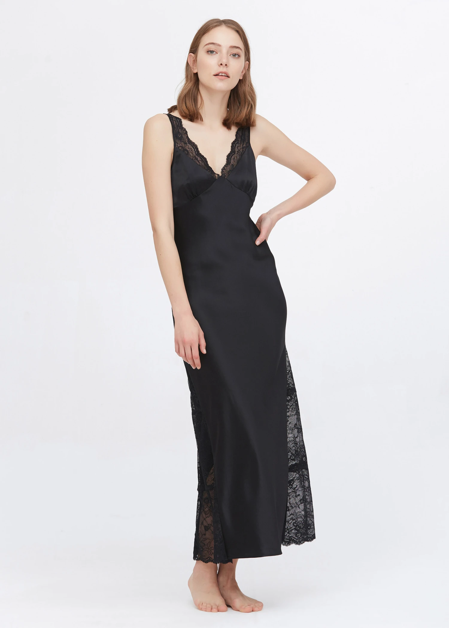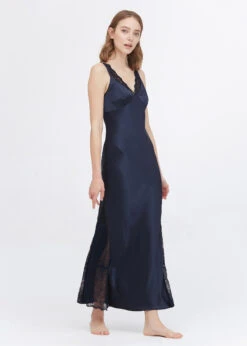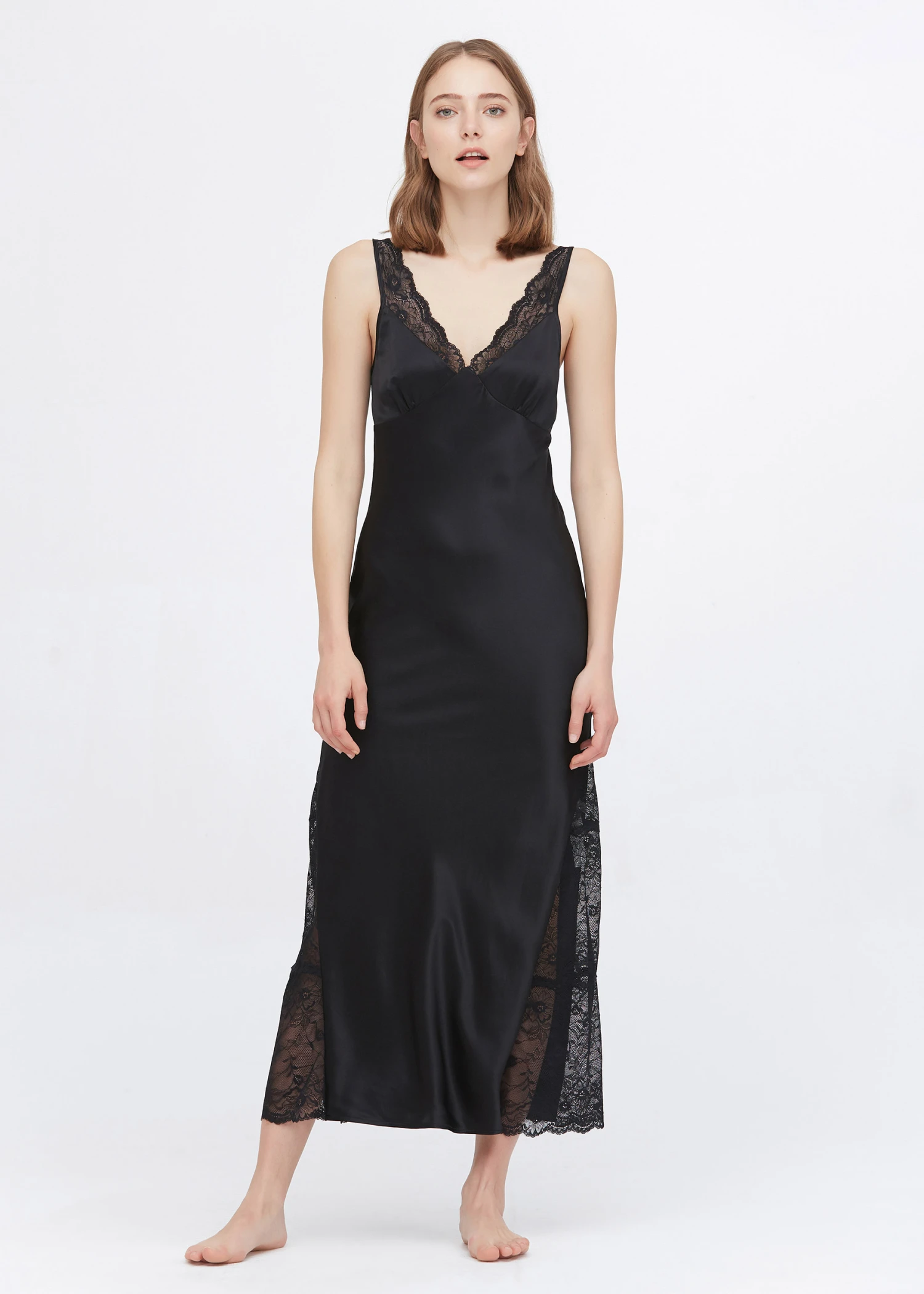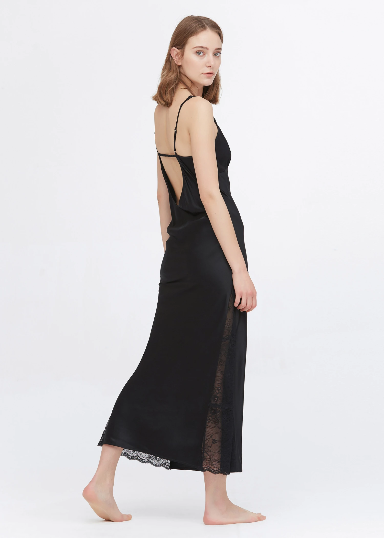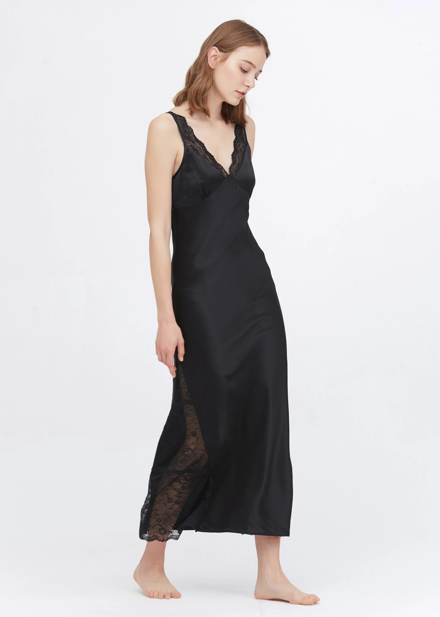 Feminine and classic, the Long Silk Nightdress with Lace Detail is the epitome of Hollywood glamour. With a plunging v-shaped neckline trimmed with delicate lace and side panel lace inserts, this silk nightdress is sure to flatter your body and make you feel good when wearing it. Ideal to wear to dinner or for evenings at home, this sumptuous nightdress can do it all.