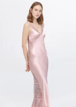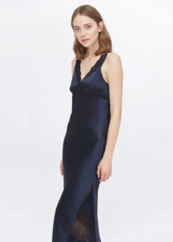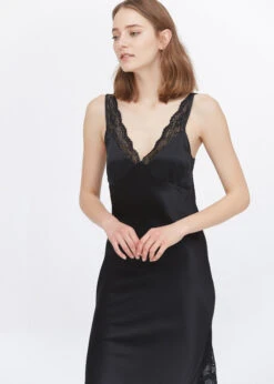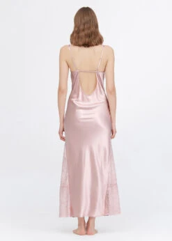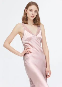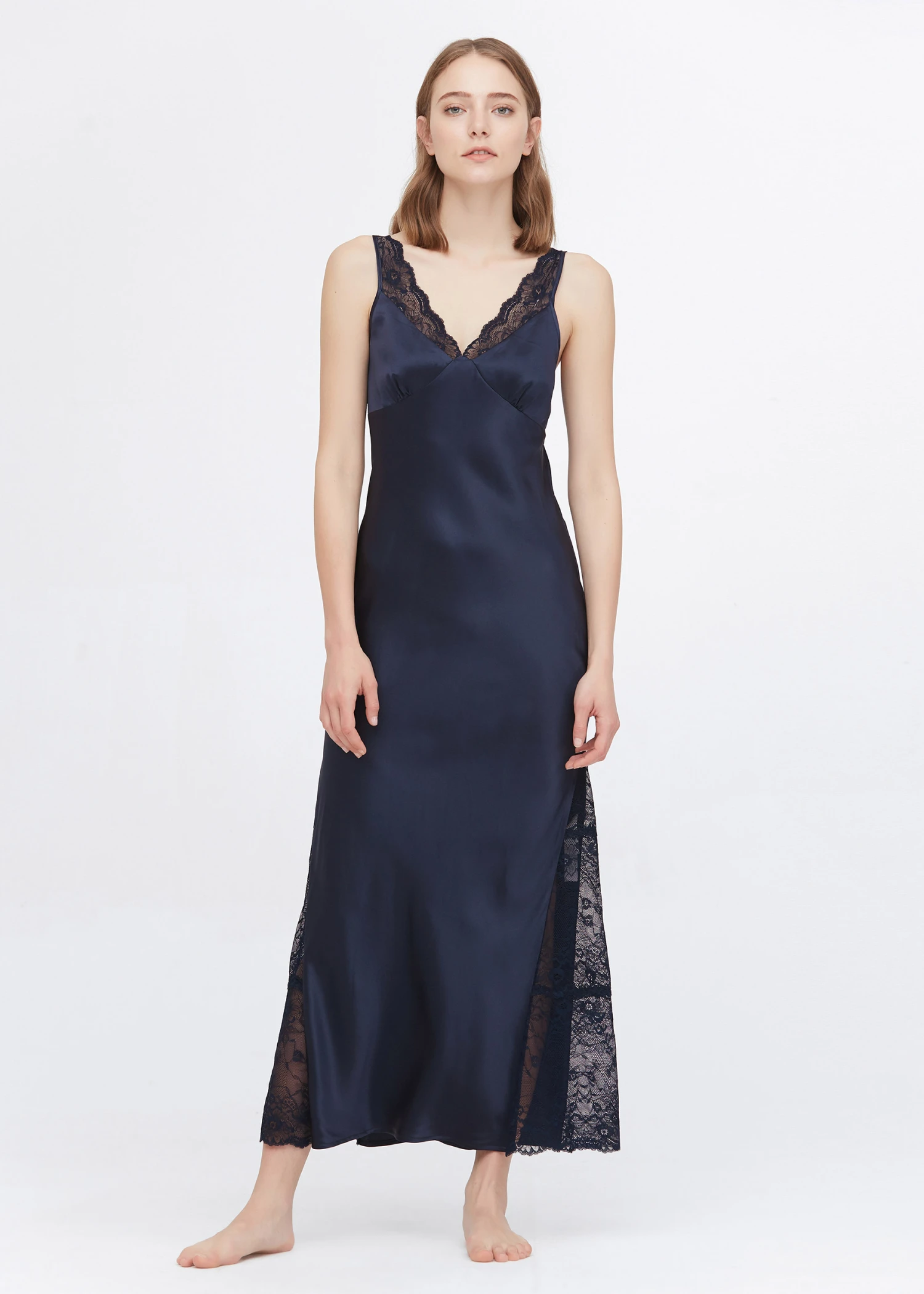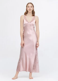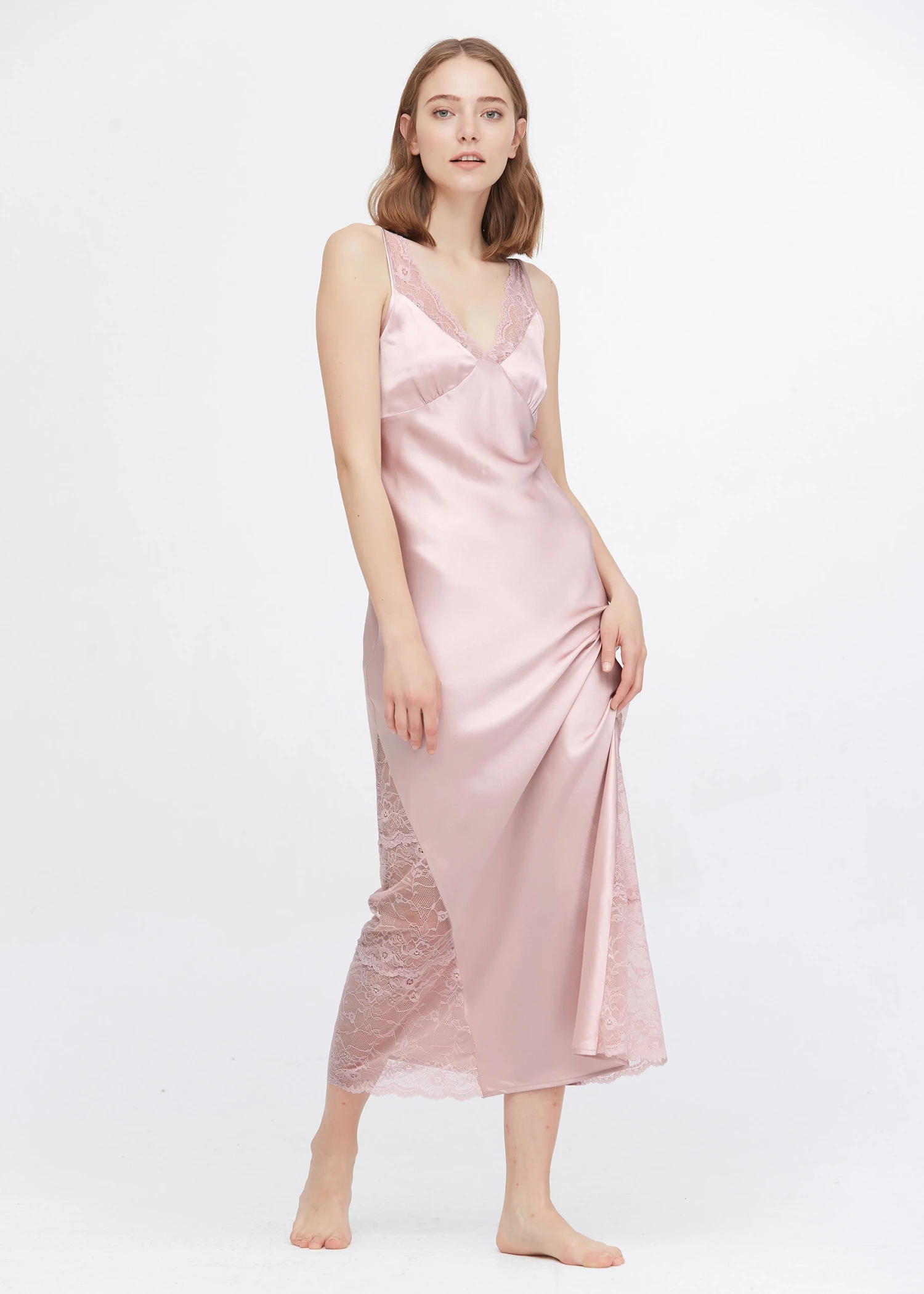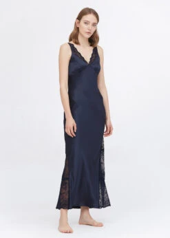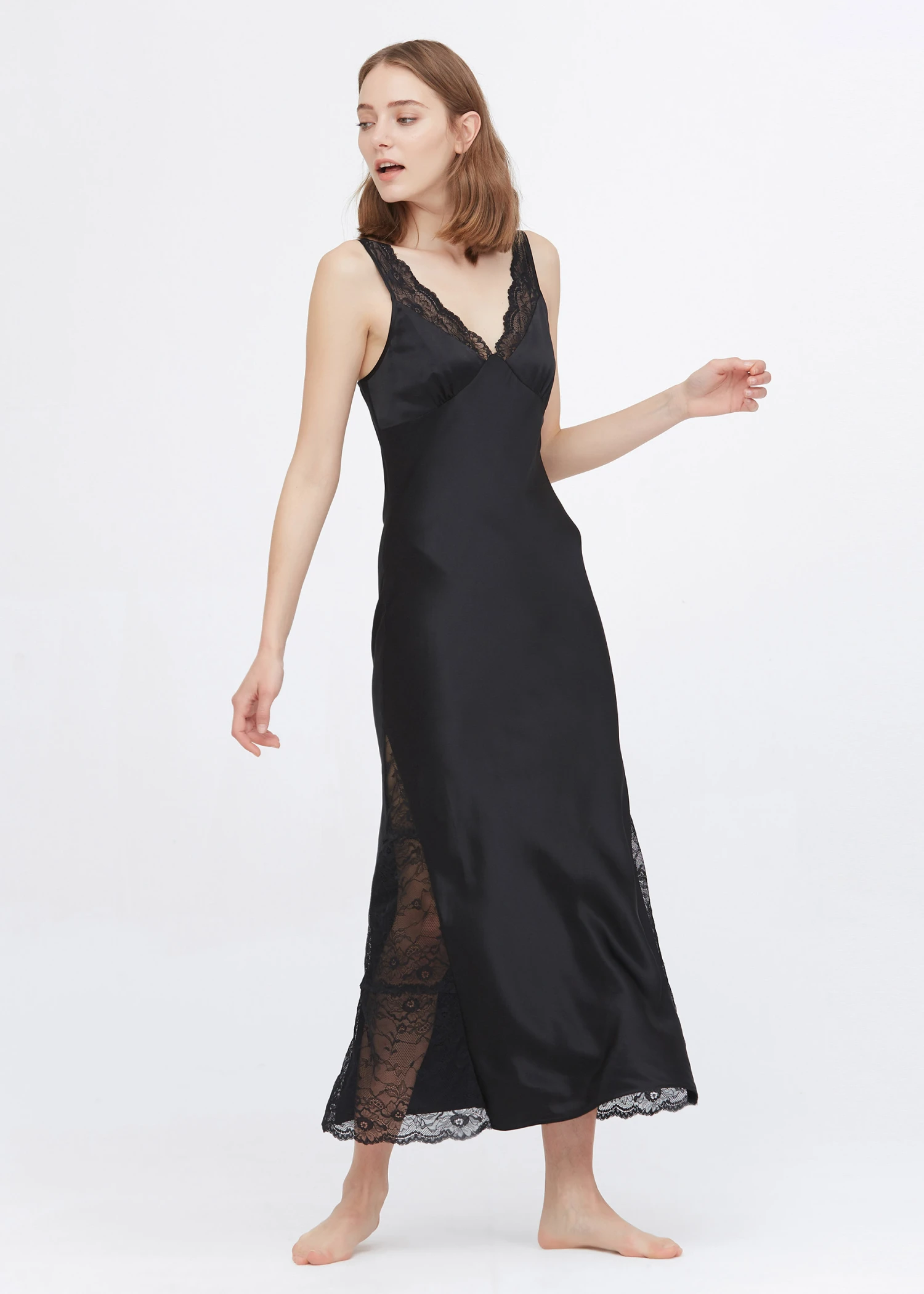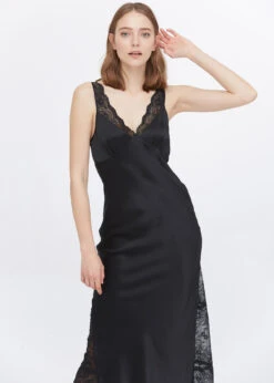 Feminine and classic, the Long Silk Nightdress with Lace Detail is the epitome of Hollywood glamour. With a plunging v-shaped neckline trimmed with delicate lace and side panel lace inserts, this silk nightdress is sure to flatter your body and make you feel good when wearing it. Ideal to wear to dinner or for evenings at home, this sumptuous nightdress can do it all.