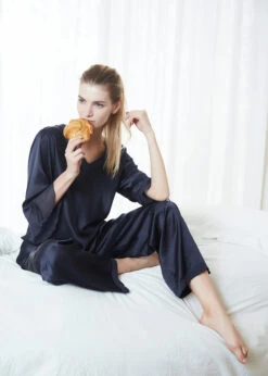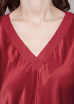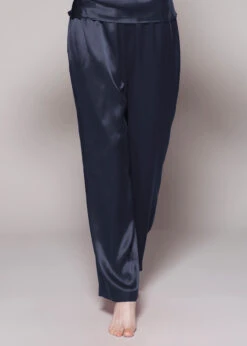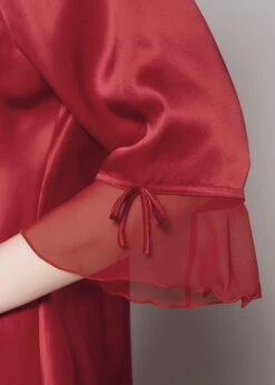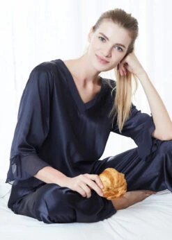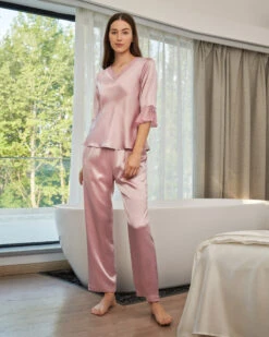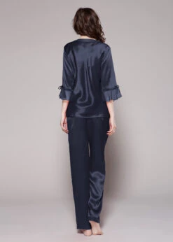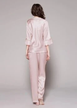 Feel glamorous when slipping into the V-Neck Silk Pajamas with Flounced Trim. A cute v-neck top matched with relaxed fit pants, make these a perfect fit for the ultimate comfort. Feminine style details include a sheer flounce trim on the sleeves, complimented by sweet little bows. You will never want to get out of these luxurious silk pajamas.