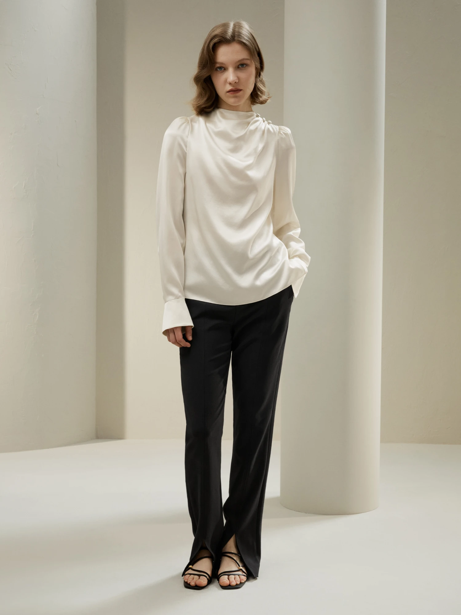 Asymmetry is another type of symmetry. The blouse is made of 100% mulberry silk which ensures the breathability and softness. Sculpted like the goddess of intellect and wisdom Phoebe, buttons at the left shoulder and slight pleats at the neckline slim the upper body and flatter the figure, emphasizing the female confidence. The color lily white remains classic, with puff sleeves and longer cuffs for a fresh, modern feel.