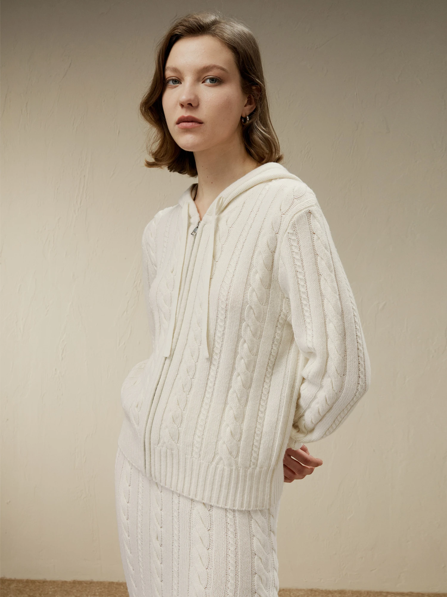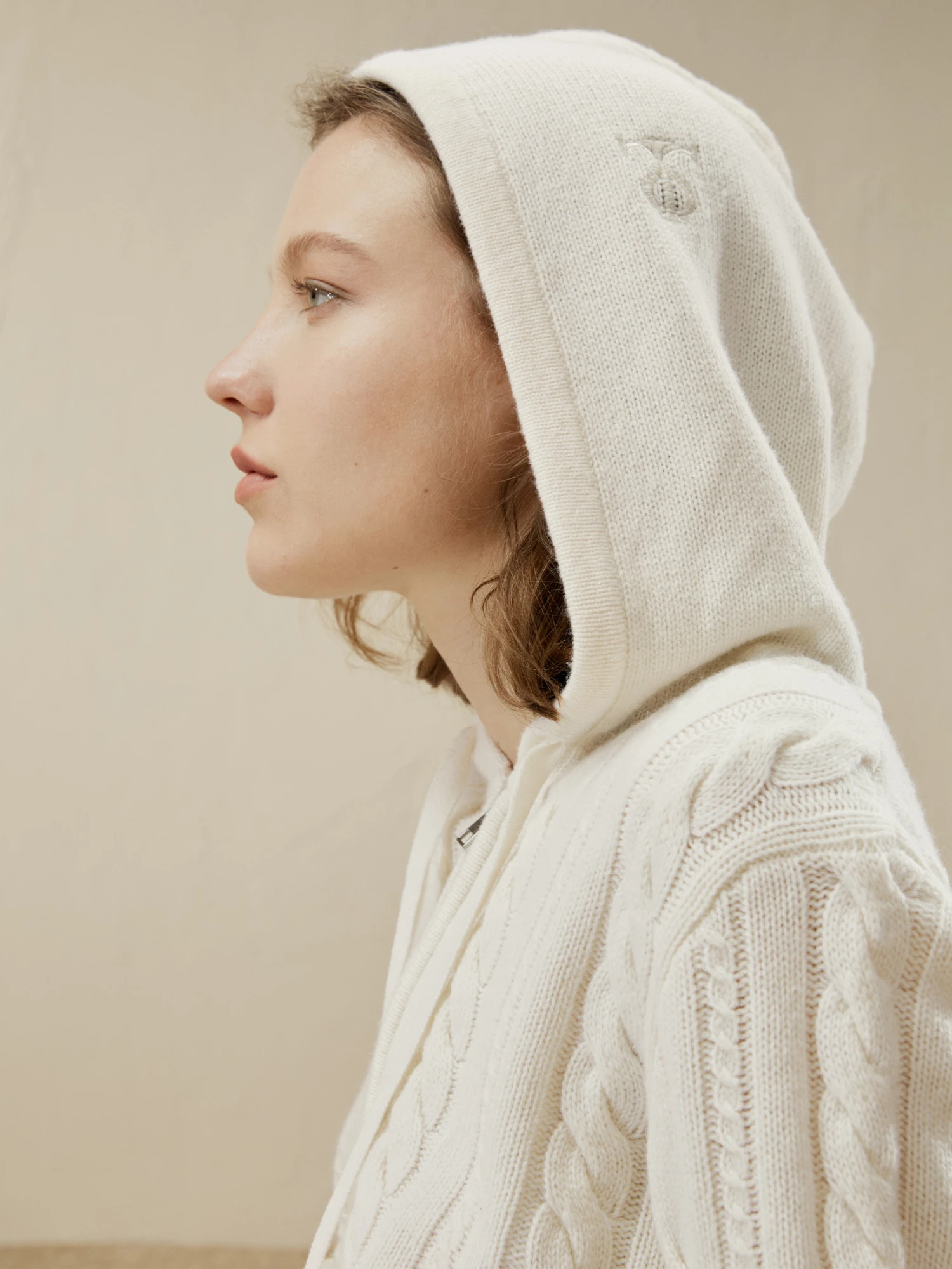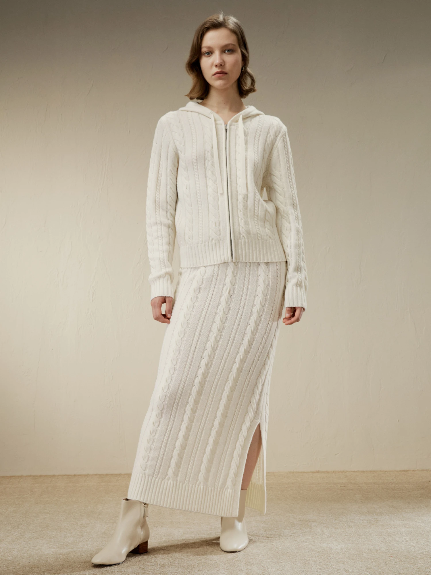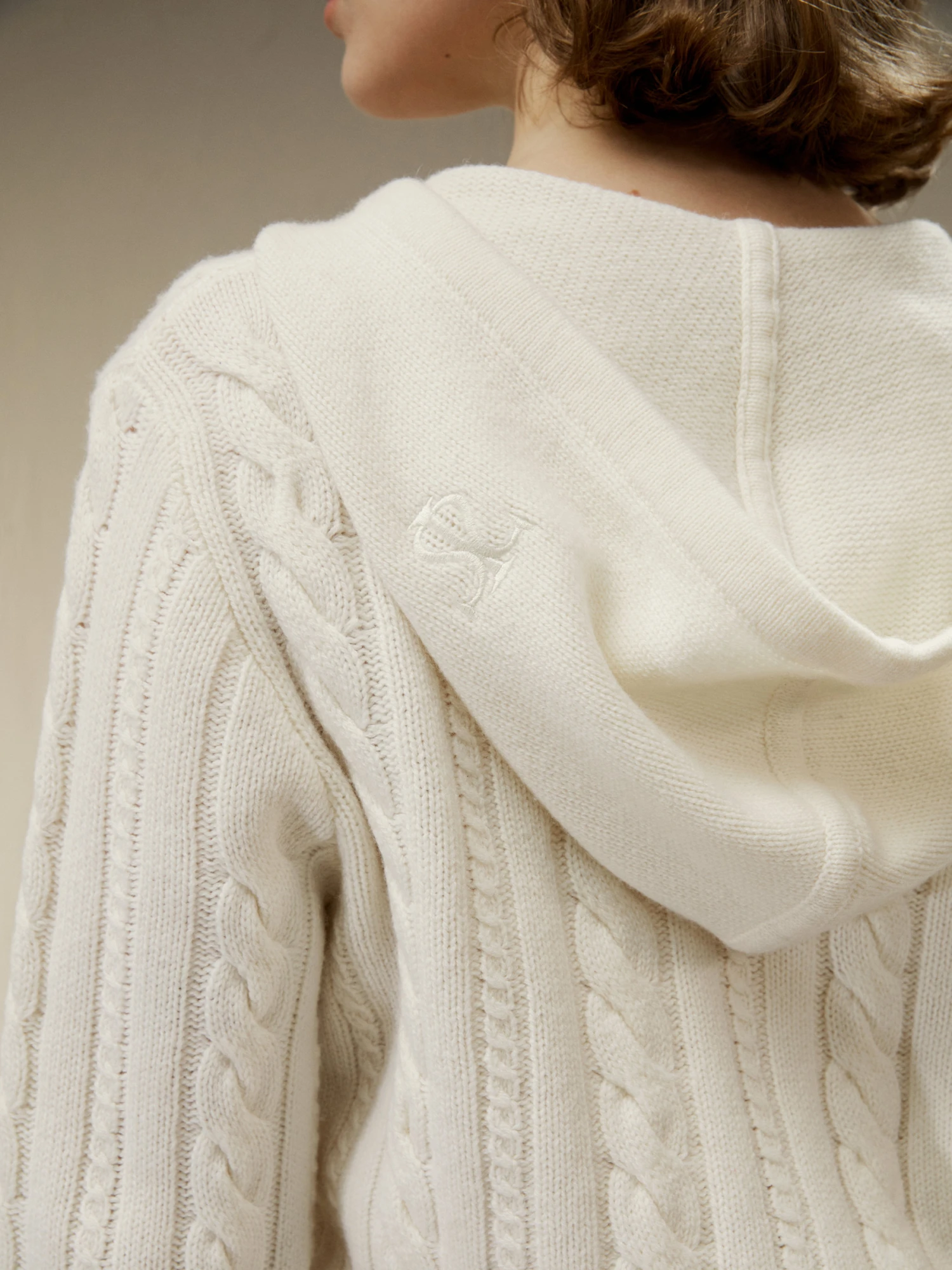 Engulf oneself in the luxury of our pristine cable-knit sweater hoodie -a testament to the harmony of style and comfort crafted from the seamless fusion of wool and cashmere, and weights over 500g. This multi-occasion masterpiece elevates your ensemble instantly when worn solo or layered over your choice of tops, or match it with our coordinating skirt for sartorial elegance.