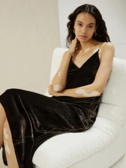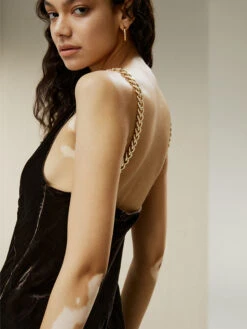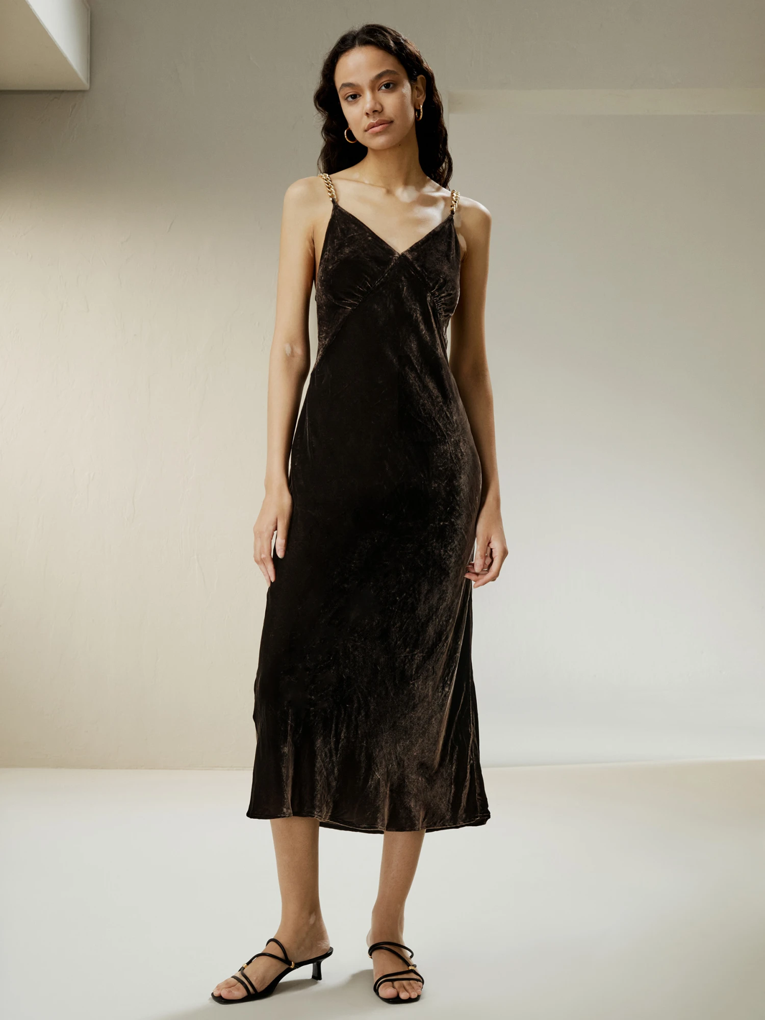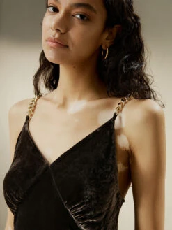 Slip into this vintage-inspired max dress on date nights and parties as it showcases a flawless fusion of viscose and silk. Resplendent golden metal straps invite soft to the touch, plush textures that enchantingly shimmer through the night.