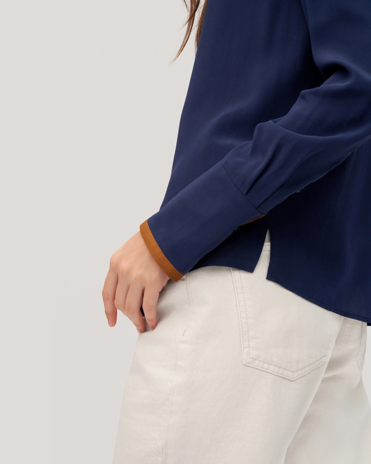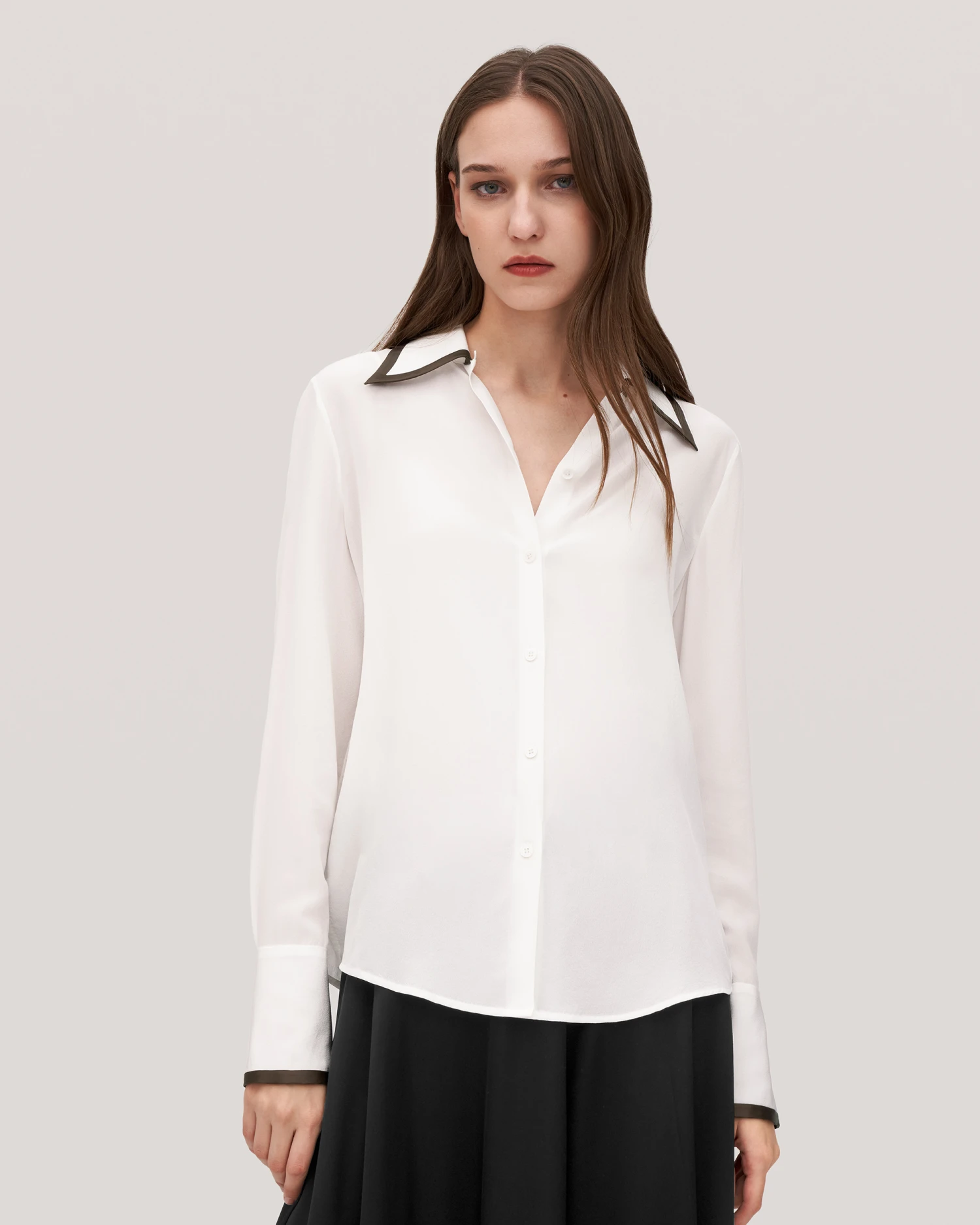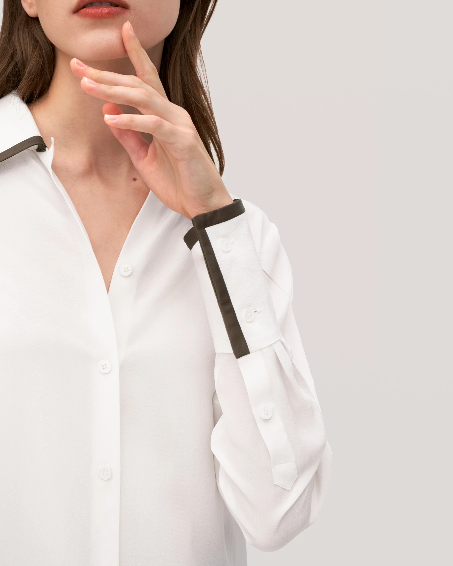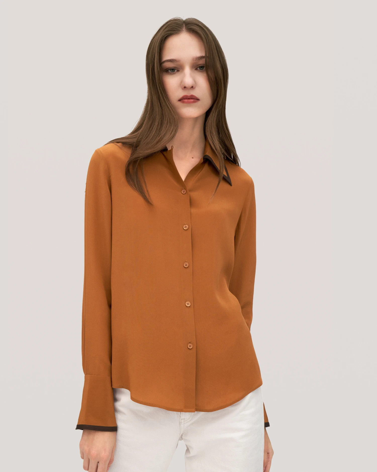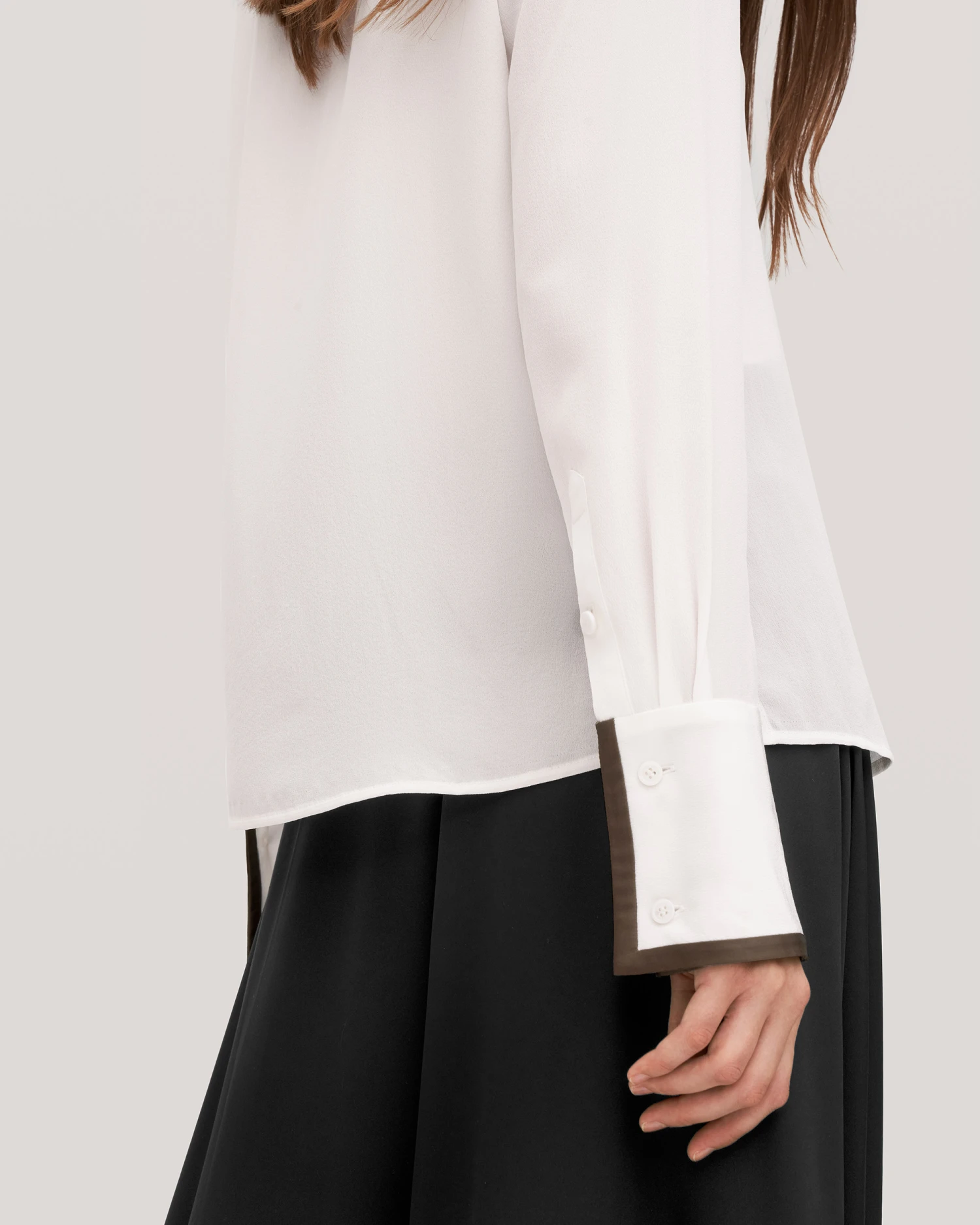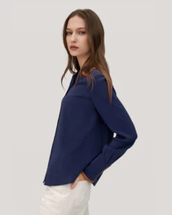 Treat your daily wardrobe to a little something special (you deserve it!) with this art deco-inspired crepe de chine silk shirt, tailored for a figure-flattering fit. Beautifully balanced with a pointed collar, split hem, and French cuff, this effortlessly chic piece transitions perfectly from desk to dinner. Pair with denim for business casual elegance, or with culottes and a statement heel for fashion-forward flair.
