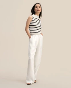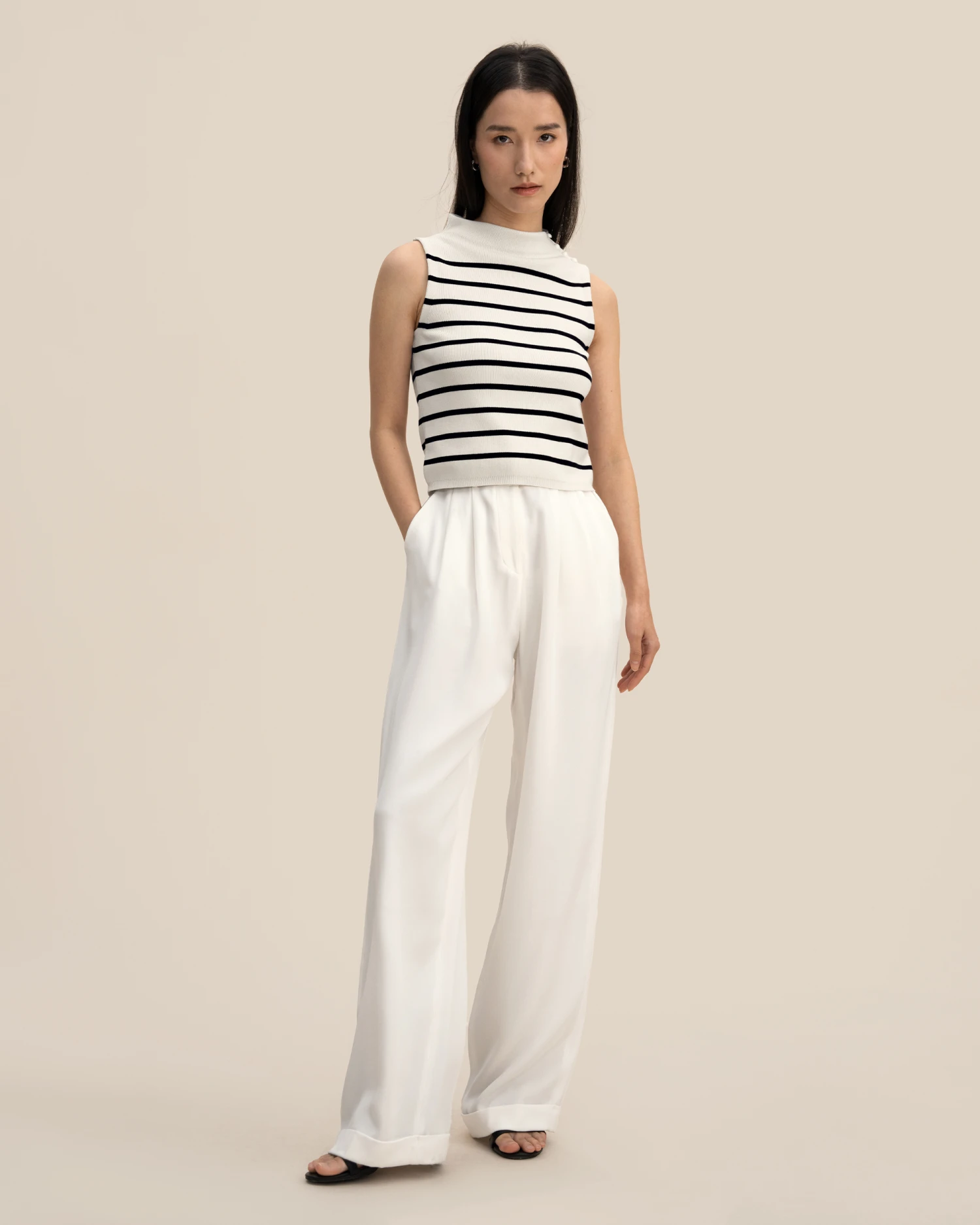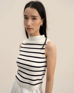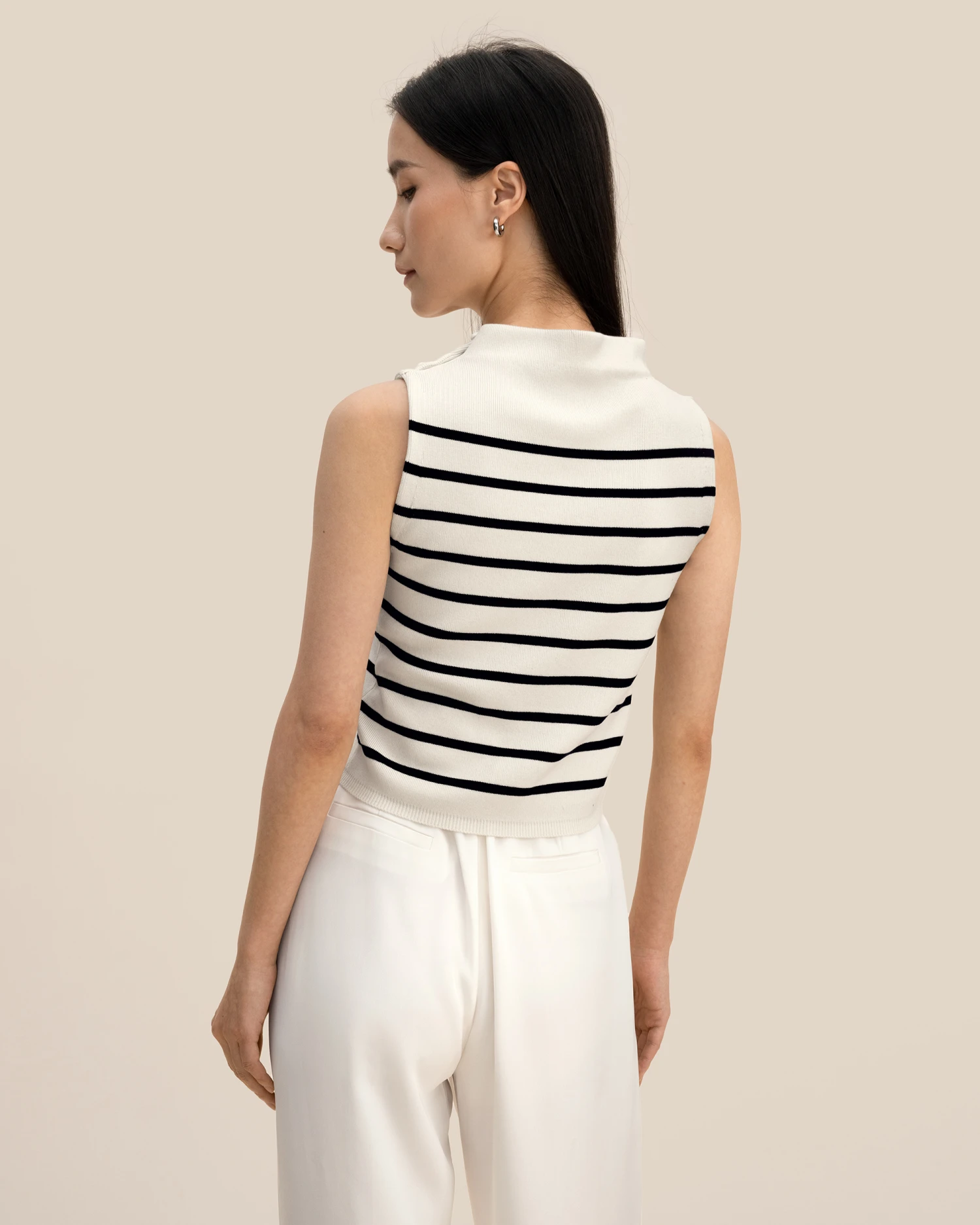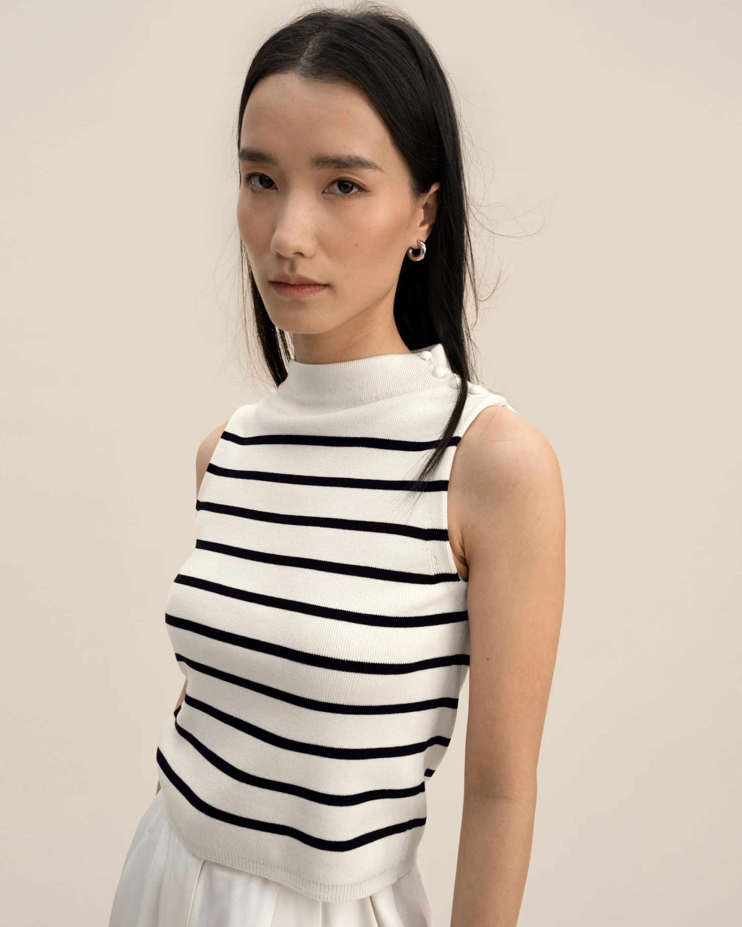 Stay cool and stylish this summer with our casual style, high neck fit sailor style stripes silk knitted shirt that go-with-everything. This stretchable top have a line of buttons on one side of the shoulder for a unique look. Pair this top with shorts or wide-leg pants for a cool and fashionable look. Can be worn for different occasions.