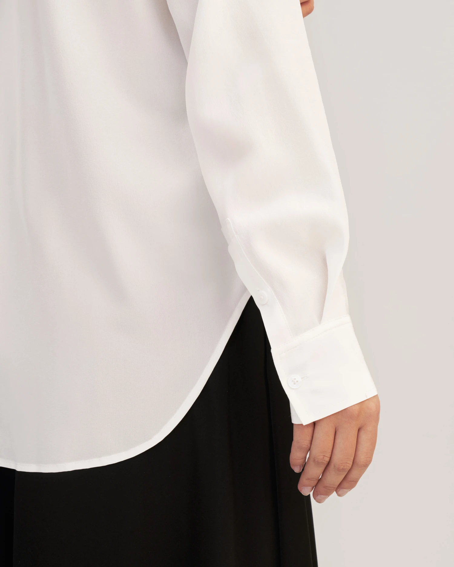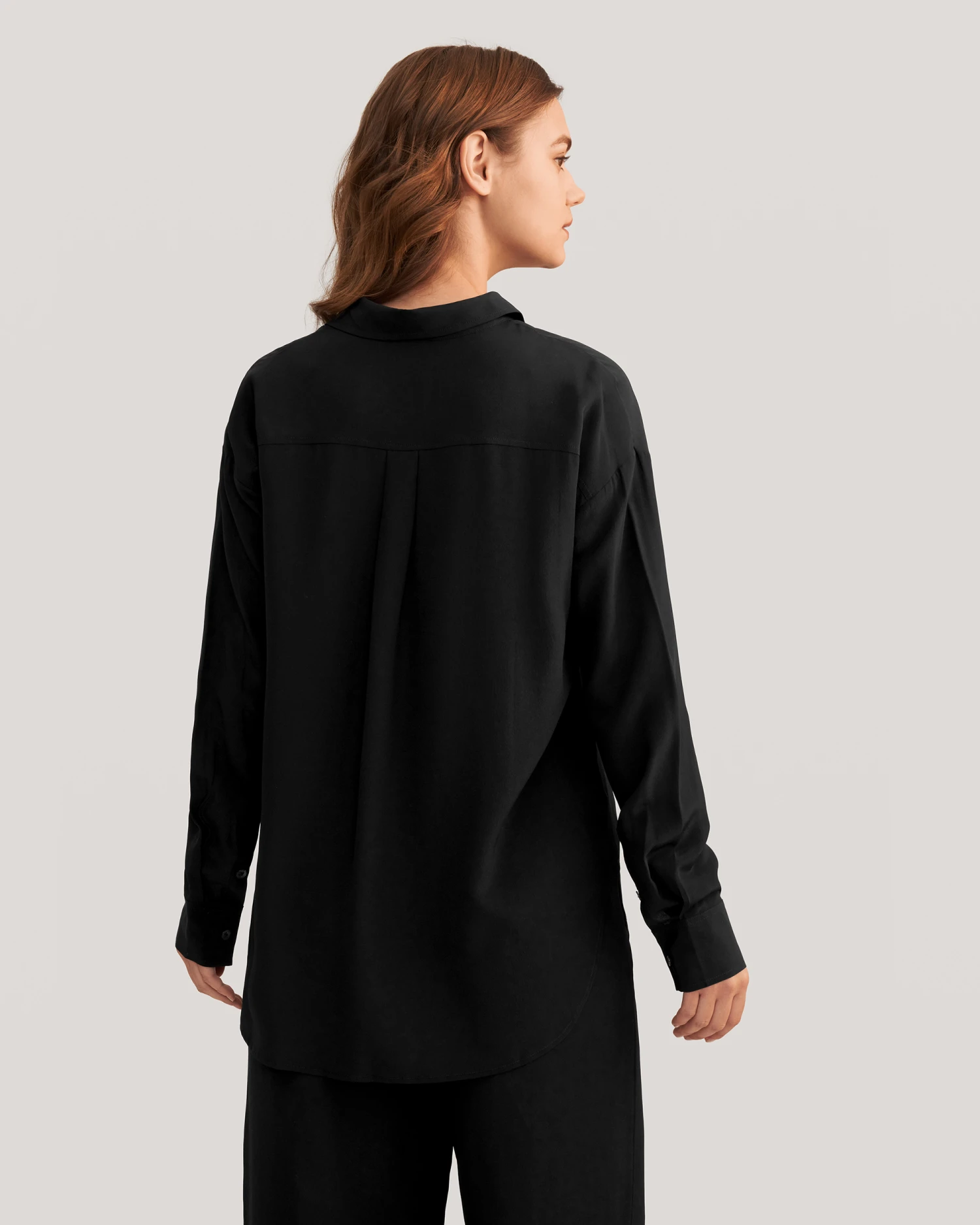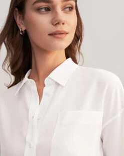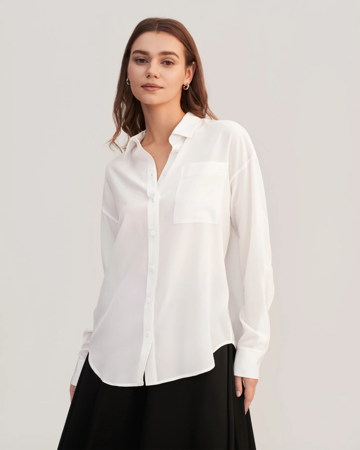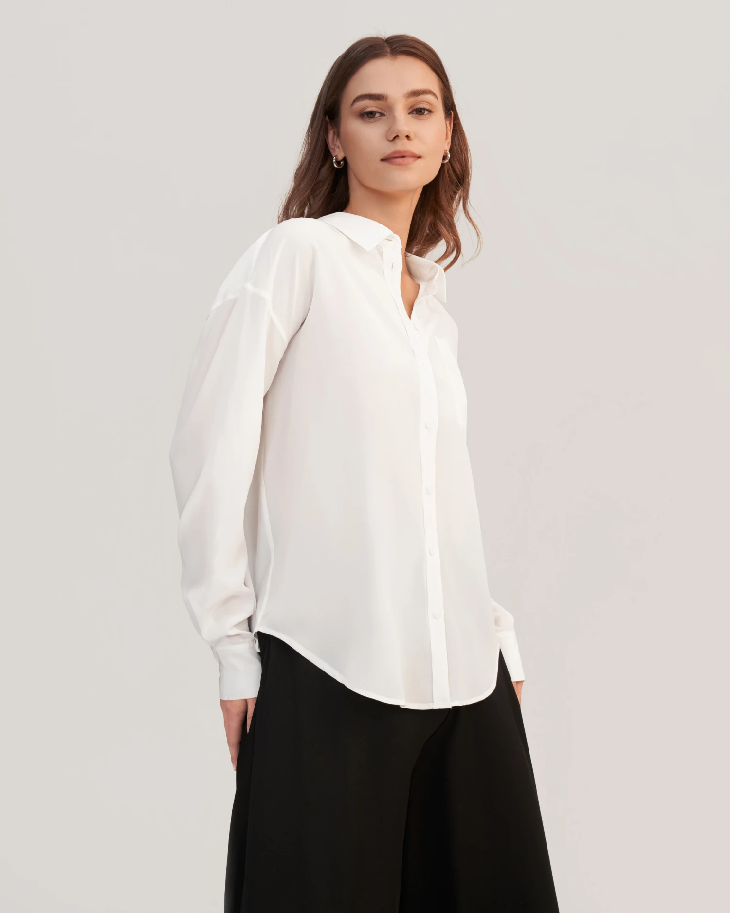 Luxurious yet laid back, the Casual Drop Shoulder shirt is a feminine interpretation of a menswear classic. Featuring a traditional shirt collar, button front, and dropped shoulders with a pocket on the chest, this straight-cut shirt has a loose and comfortable fit to it. With a hem that’s lower at the front than at the back, this shirt looks great worn loosely or tucked into your favorite jeans. A modern classic to wear today, tomorrow, and forever.
