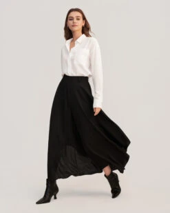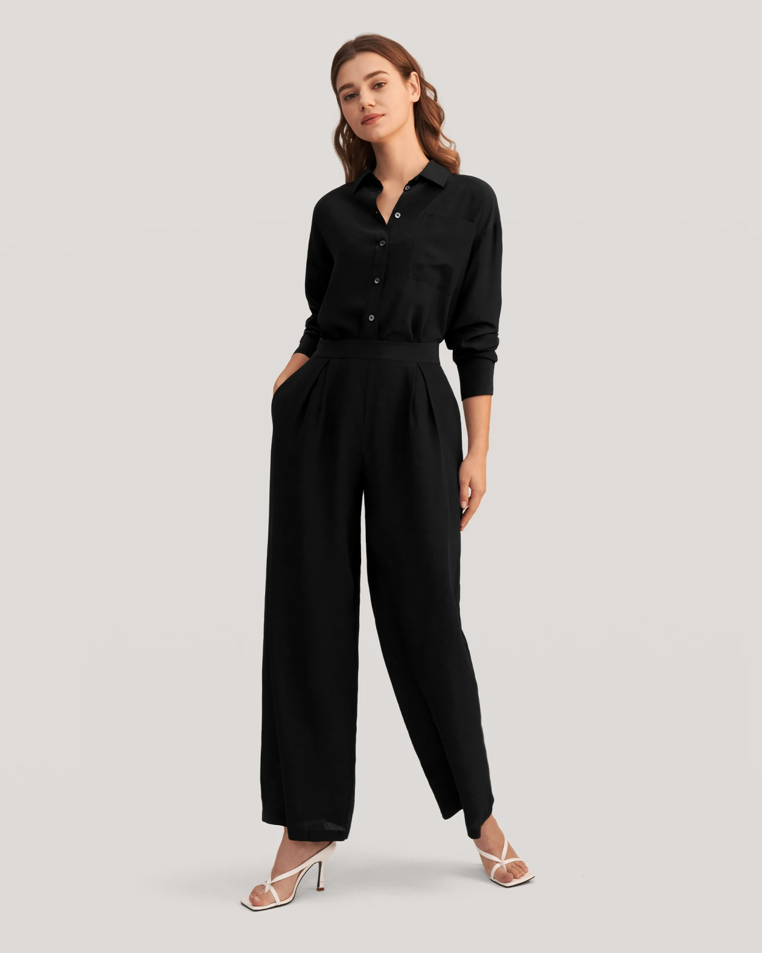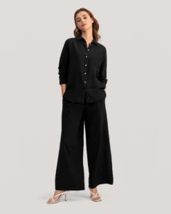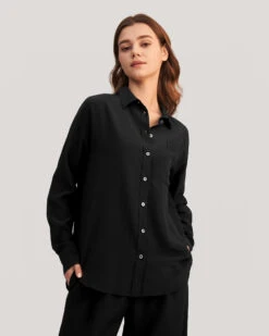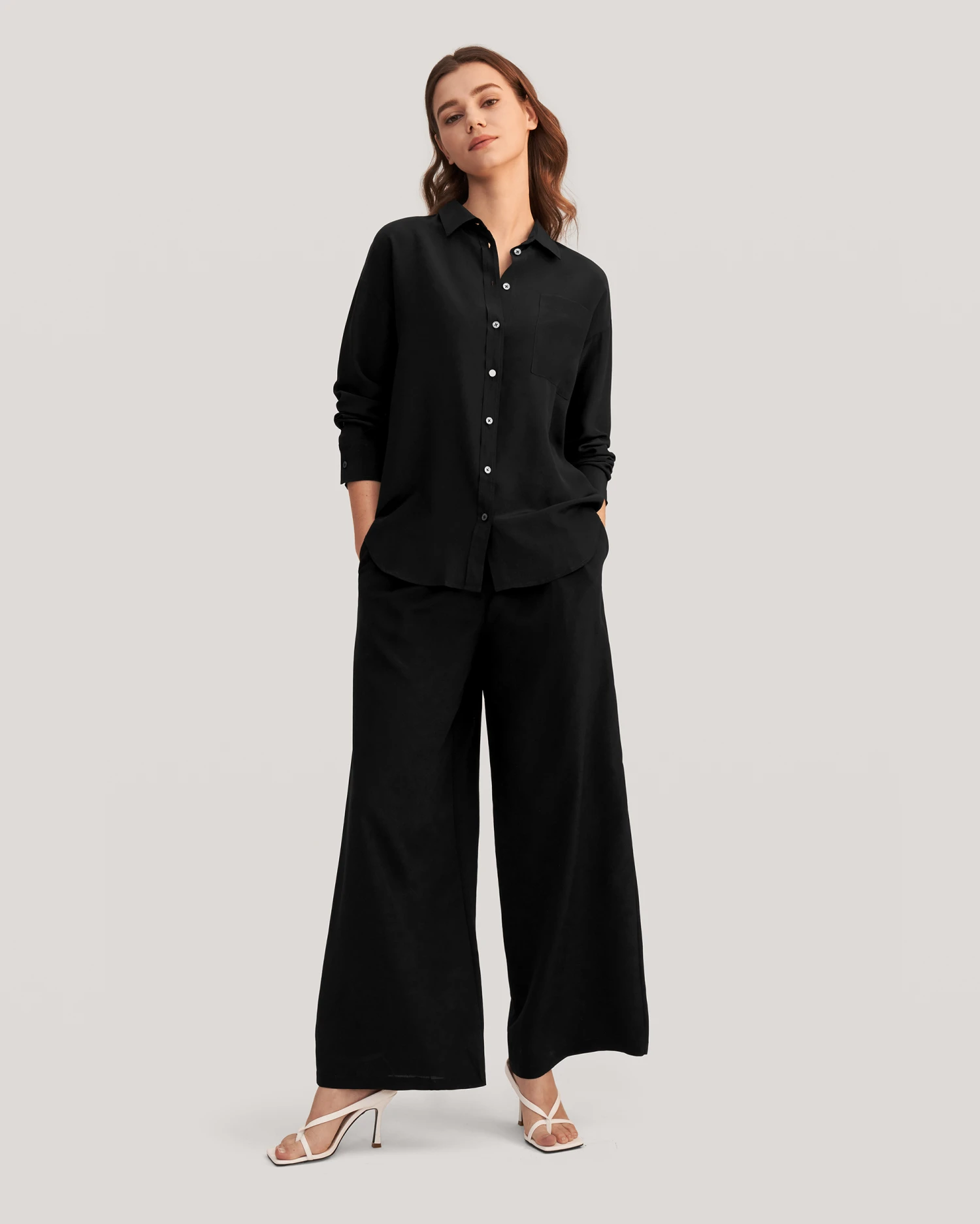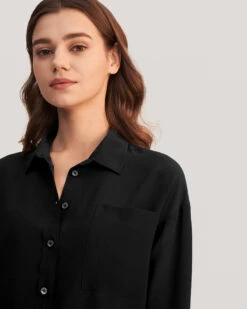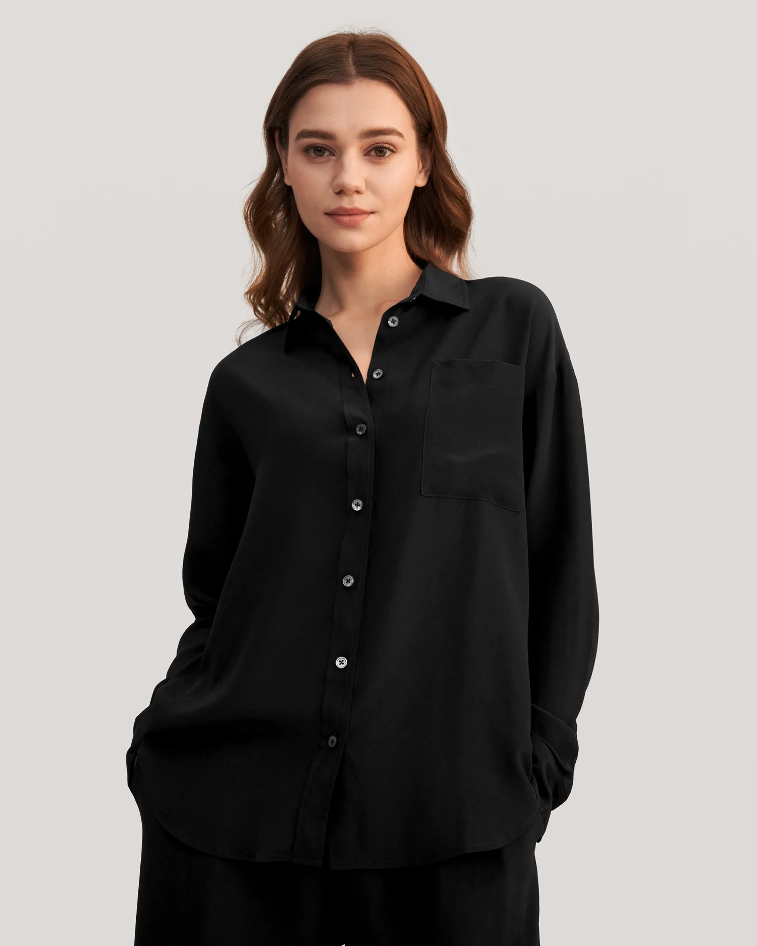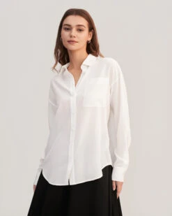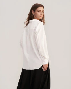 Luxurious yet laid back, the Casual Drop Shoulder shirt is a feminine interpretation of a menswear classic. Featuring a traditional shirt collar, button front, and dropped shoulders with a pocket on the chest, this straight-cut shirt has a loose and comfortable fit to it. With a hem that’s lower at the front than at the back, this shirt looks great worn loosely or tucked into your favorite jeans. A modern classic to wear today, tomorrow, and forever.