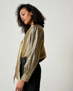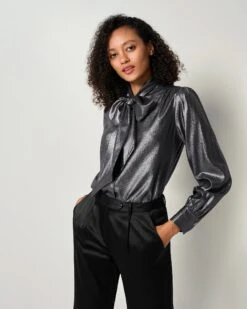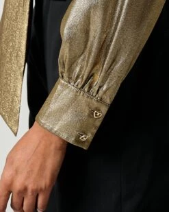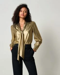 Make a stunning style statement with this vintage glossy silk blouse. This blouse is made of special bronze crepe de chine silk, which is more luxurious and durable. The bow-tie design highlights the gloss of the fabric and adds to its elegance. Pair with a skirt or wide-leg pants to complete the look.