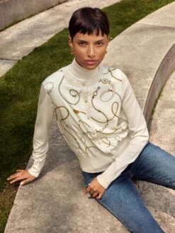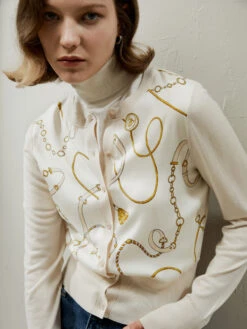 The luxe chain pattern inspired by American equestrian culture of this ultra-fine Merino wool cardigan makes a statement of classic and fashion, elegance and freedom. Add to your wardrobe for a standout style.