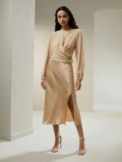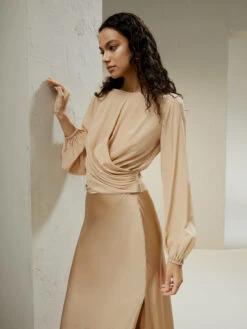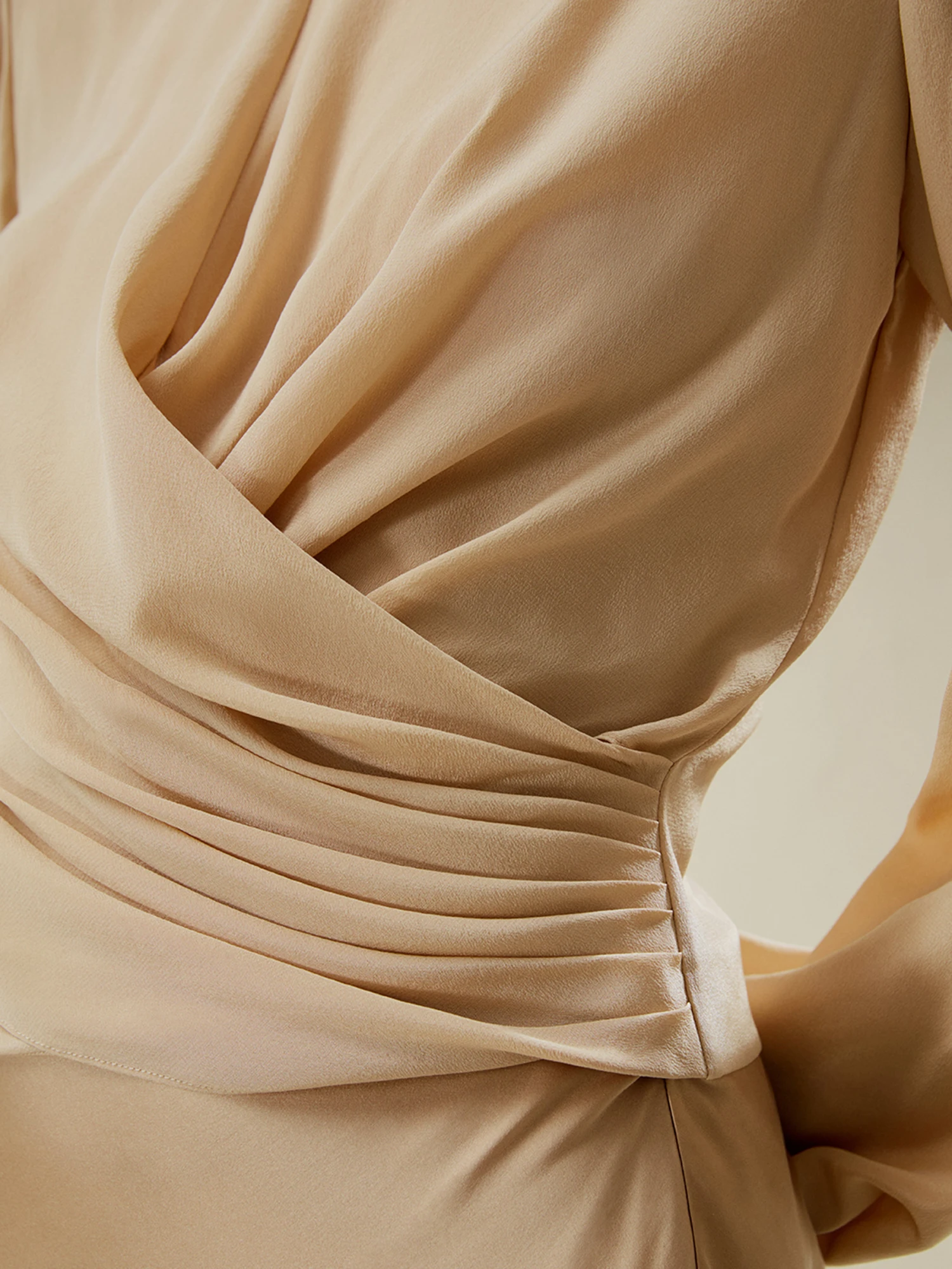 A surprise crafted in silk, this attention-grabbing blouse is made of our signature crepe de chine, lightweight and durable. The dramatic folds and cuts at the waist emphasize the figure and the feminine charisma, as the long, slightly puffed sleeves make the upper body look slimmer. An elegant style for the coming seasons.