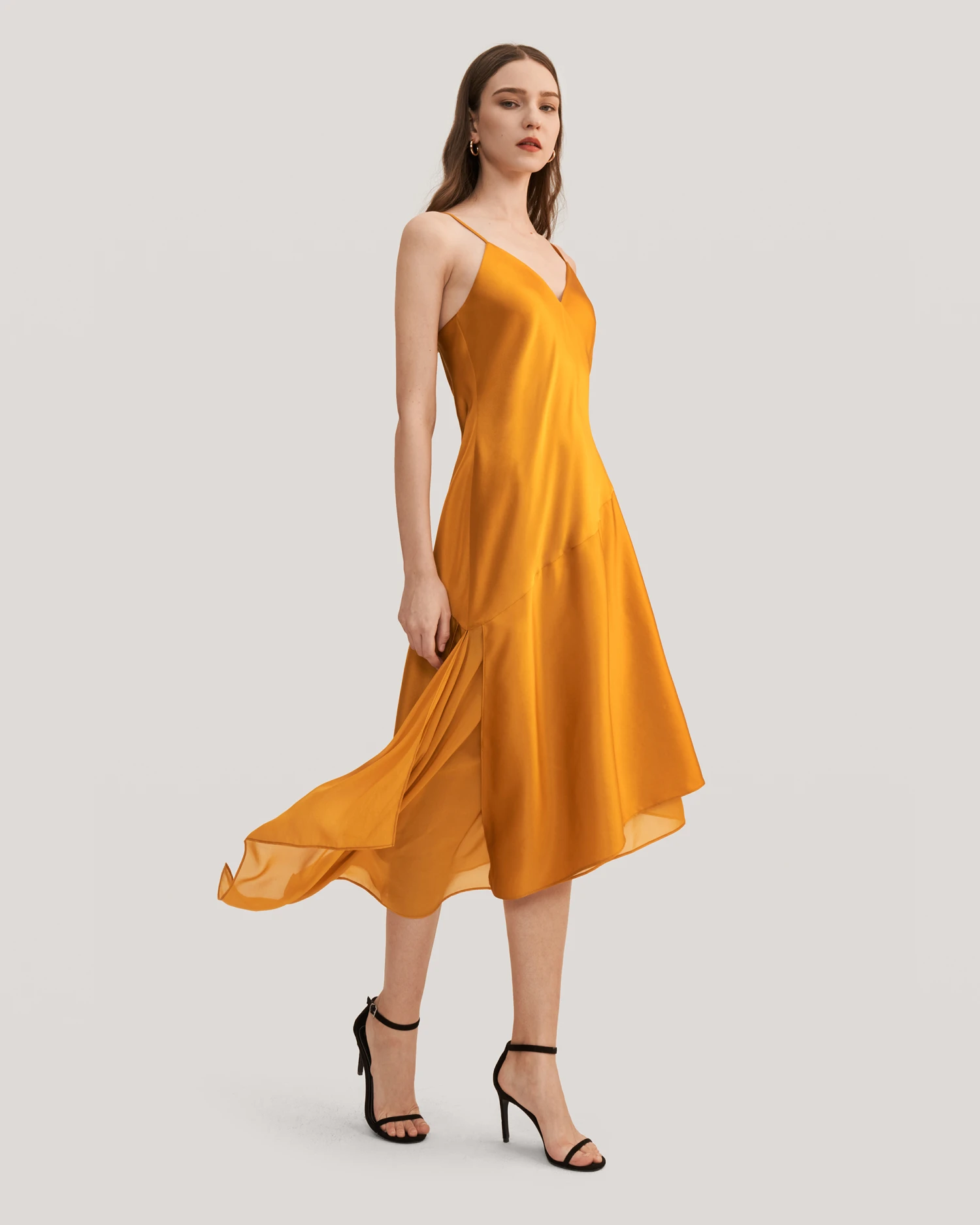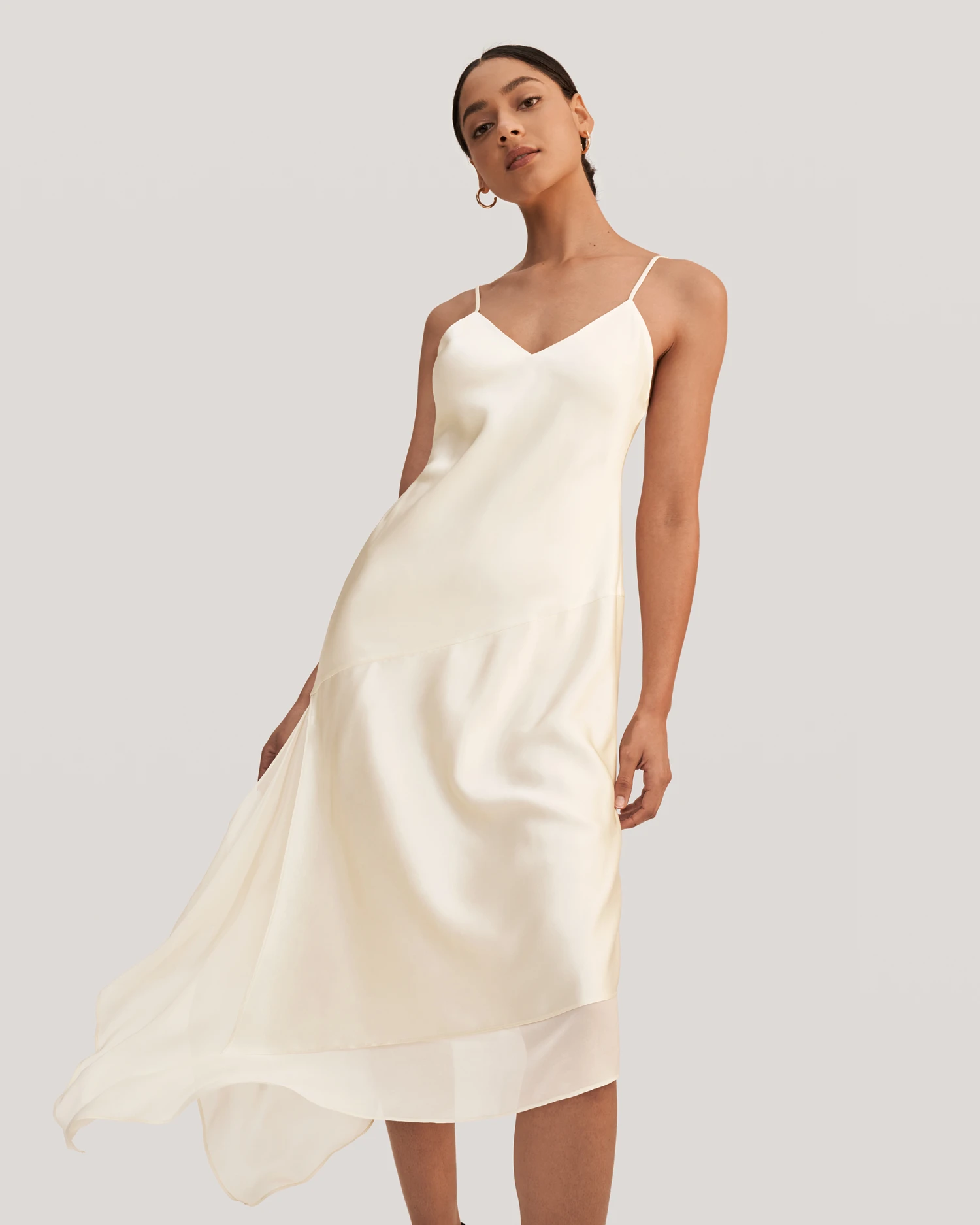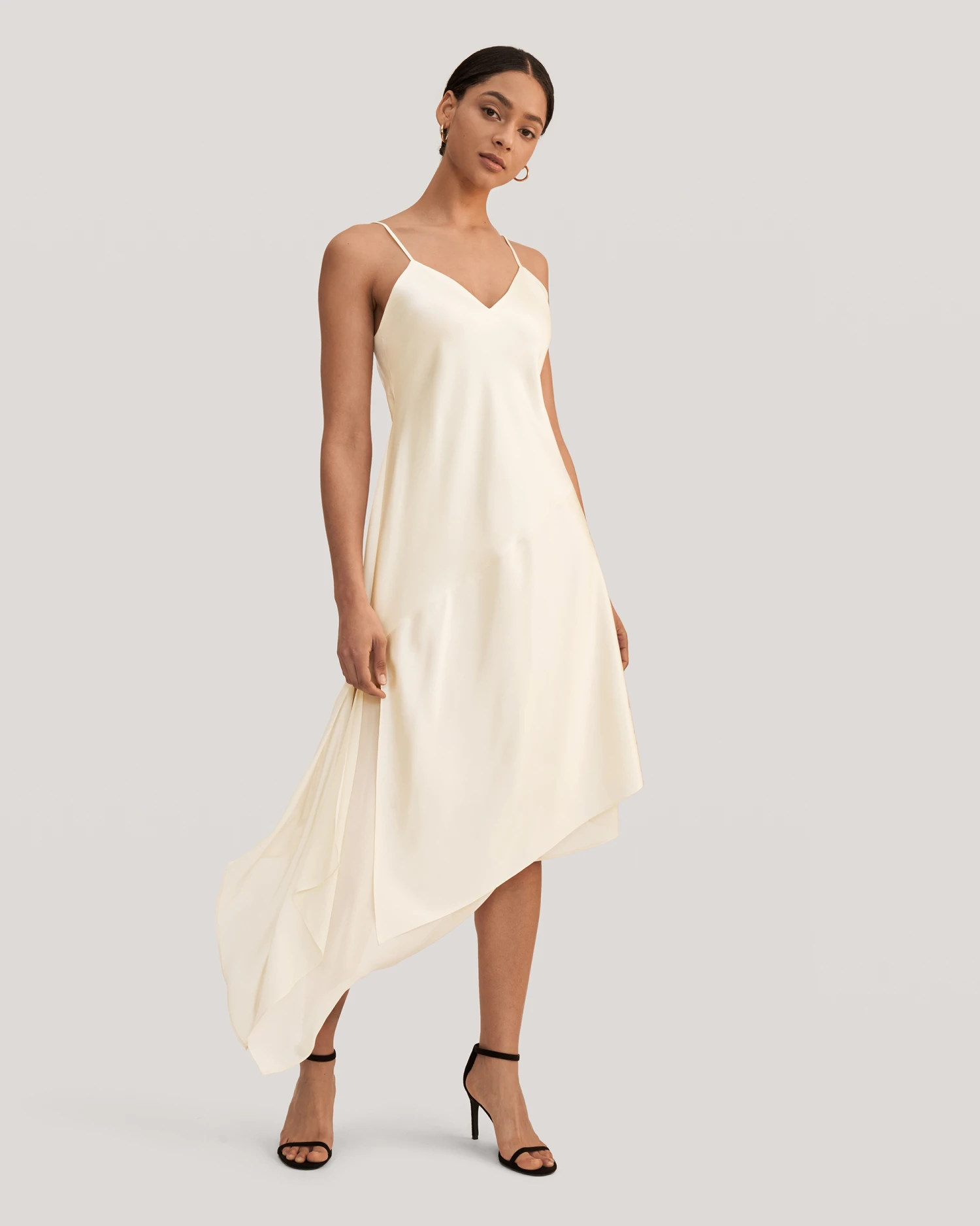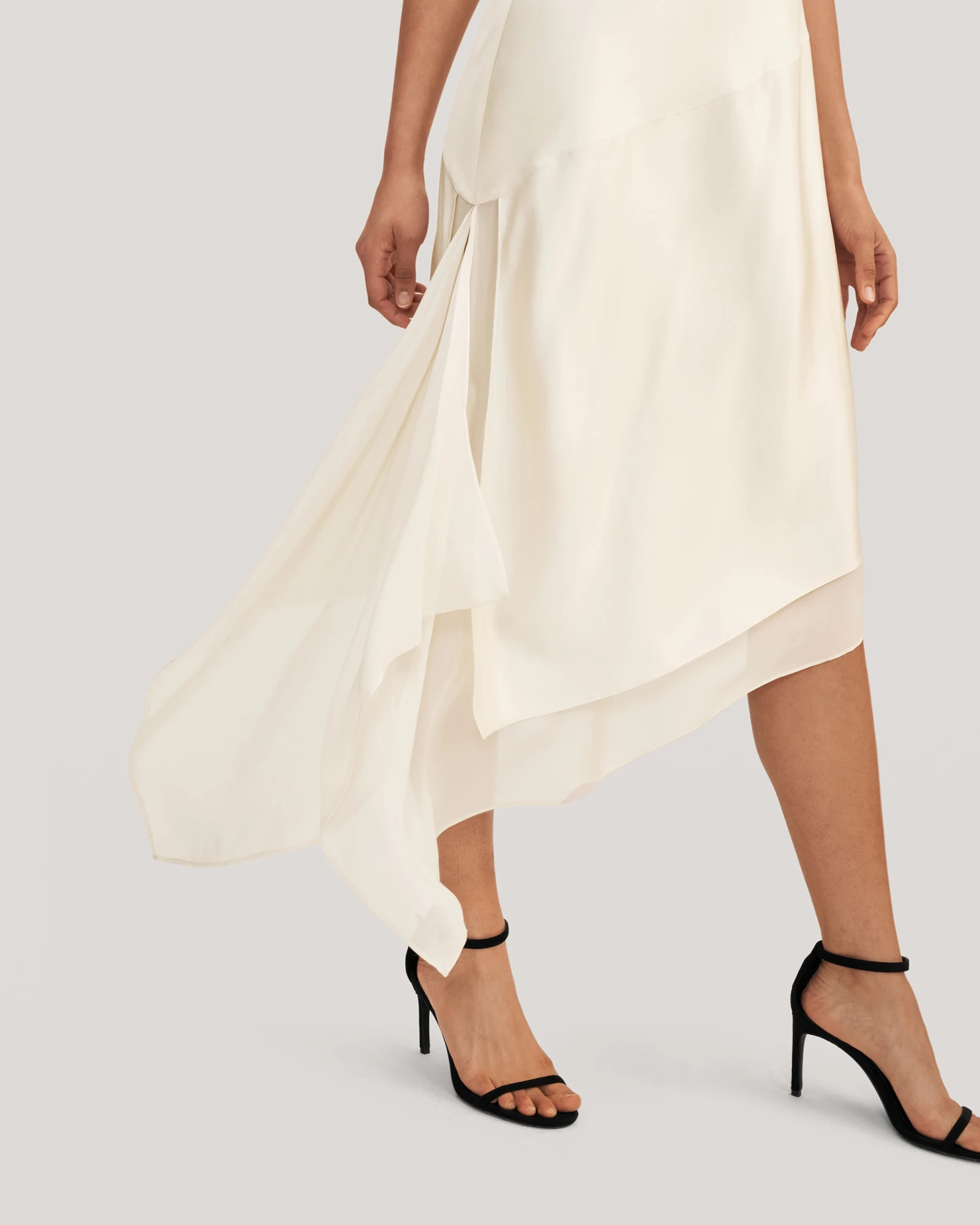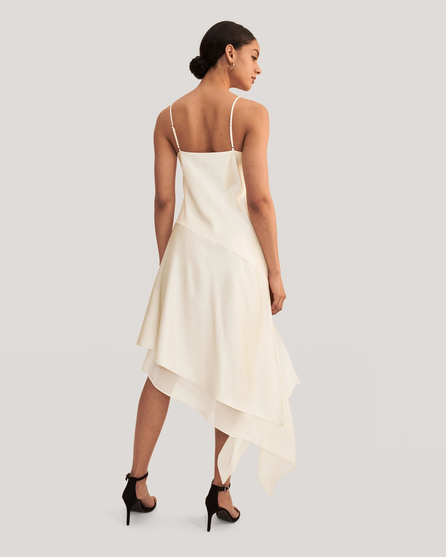 Embody the spirit of summer in our free-flowing Ocimum asymmetric dress. A bias-cut and slit with chiffon underneath adds movement and style, while the combination of silk and chiffon exudes beauty and the perfect amount of sheen.