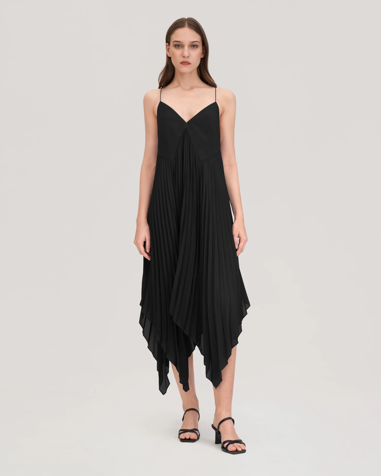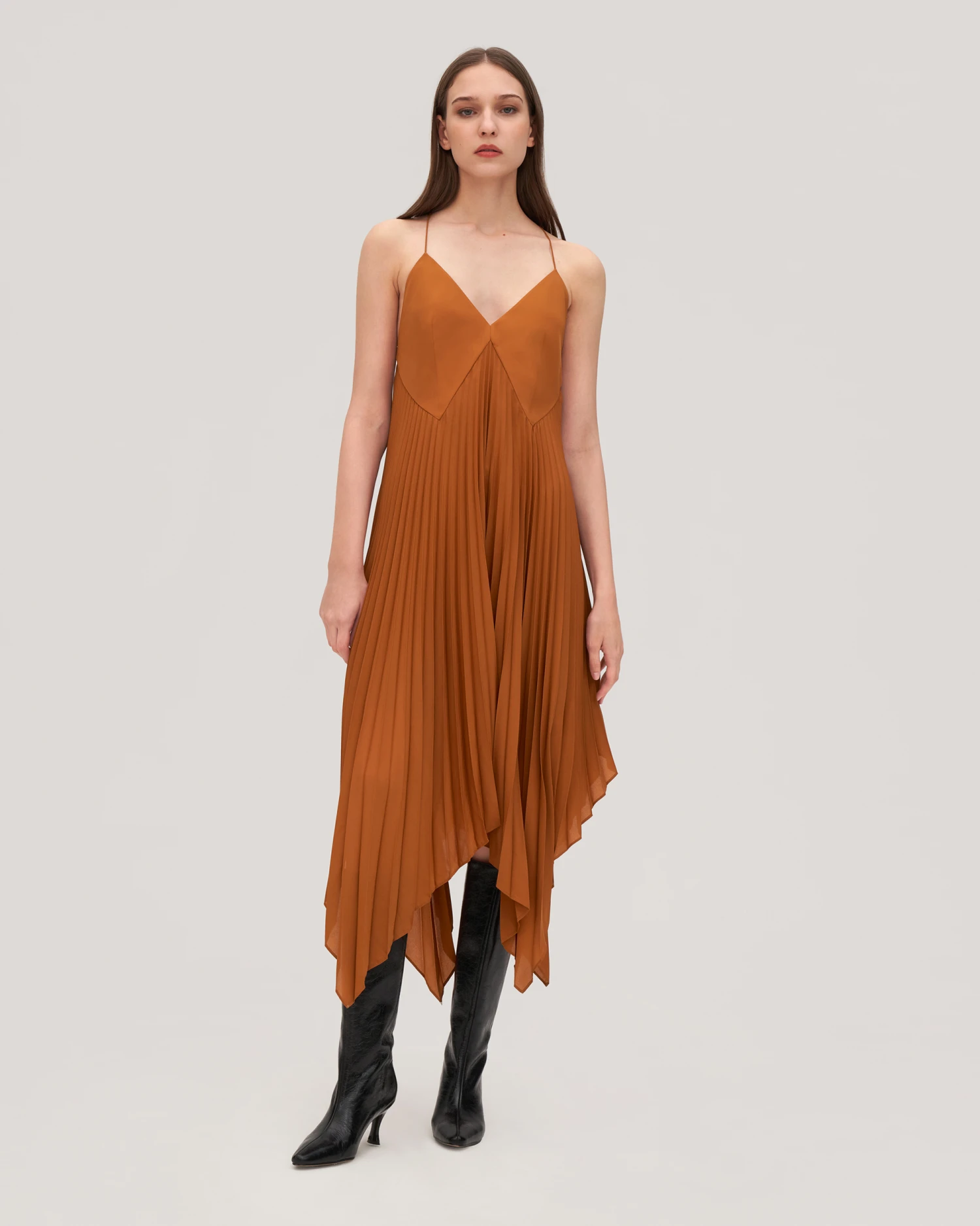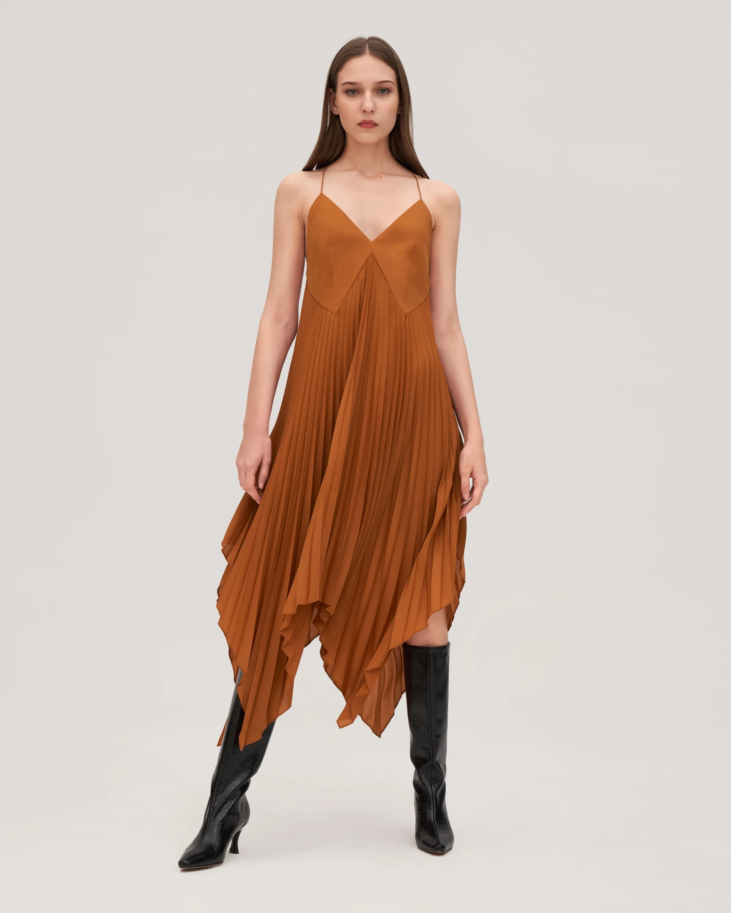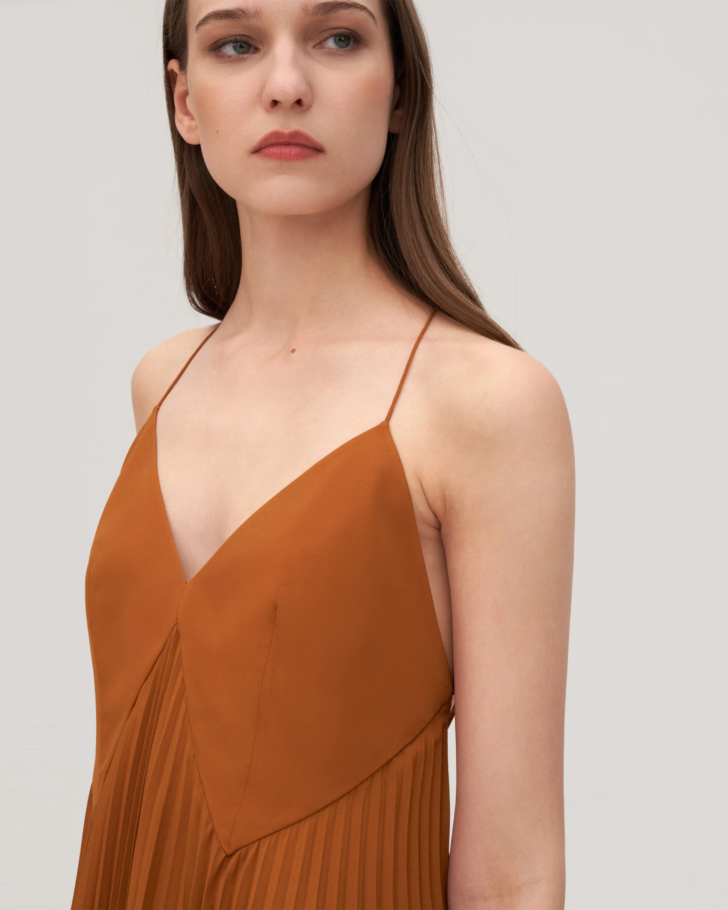 A ready-to-wear spring essential, the flawlessly constructed Daisy dress features free-flowing and feminine pleats, to take you from a spring day to date night with ease (all you need is a light jacket). Delicate spaghetti straps perfectly frame the elegant deep v-neckline and back, with eye-catching irregular hem and sunray pleats that retain shape and detail, even after several washes. Lined in 100% crepe-de-chine silk, this dress feels as good as it looks.