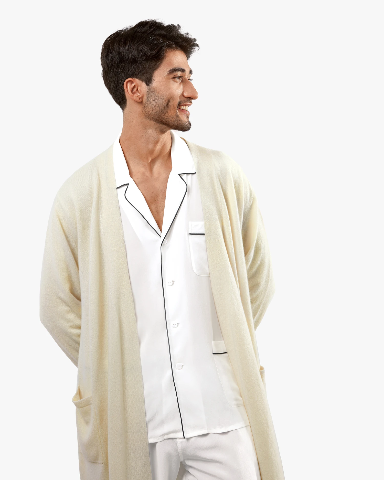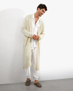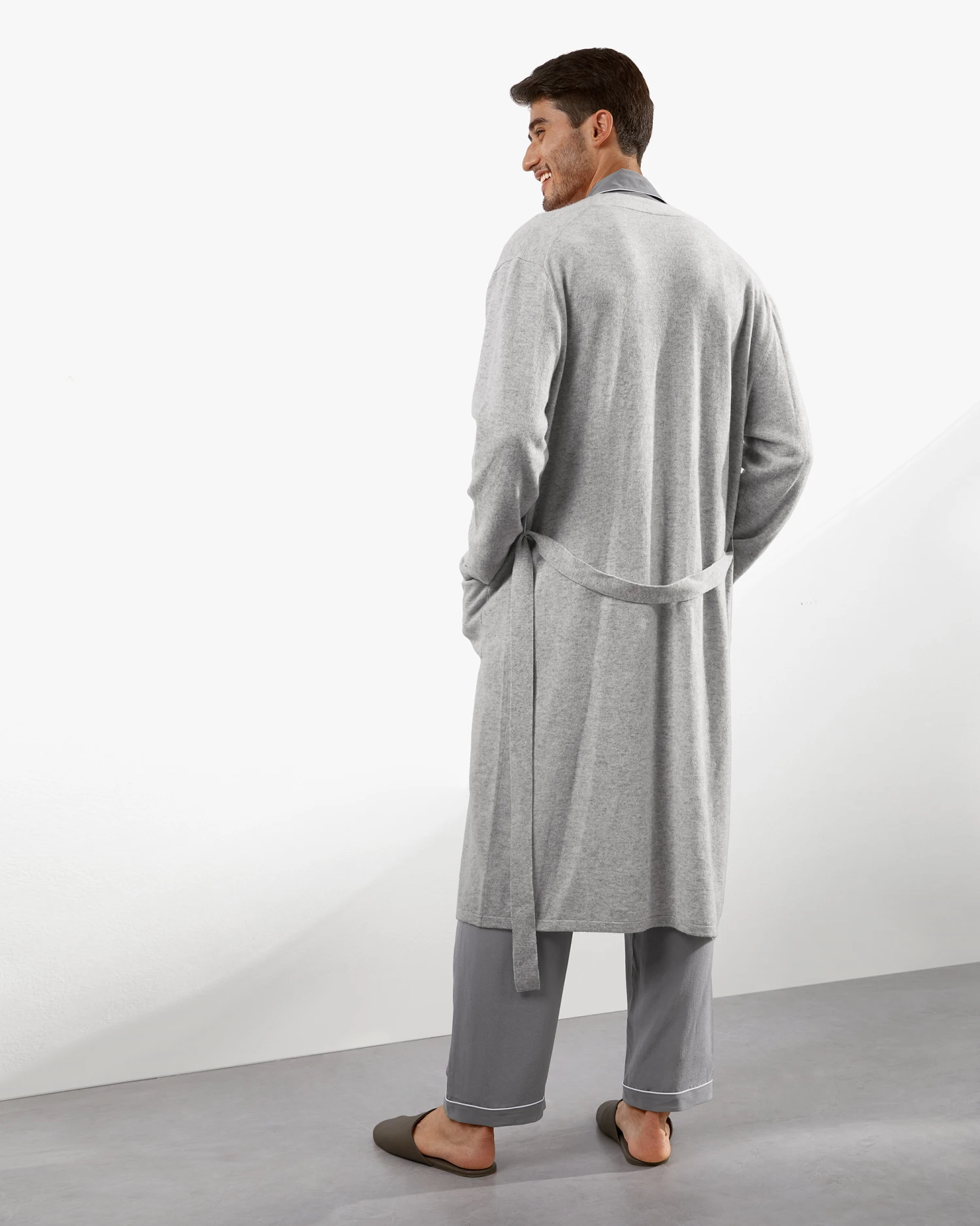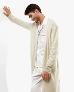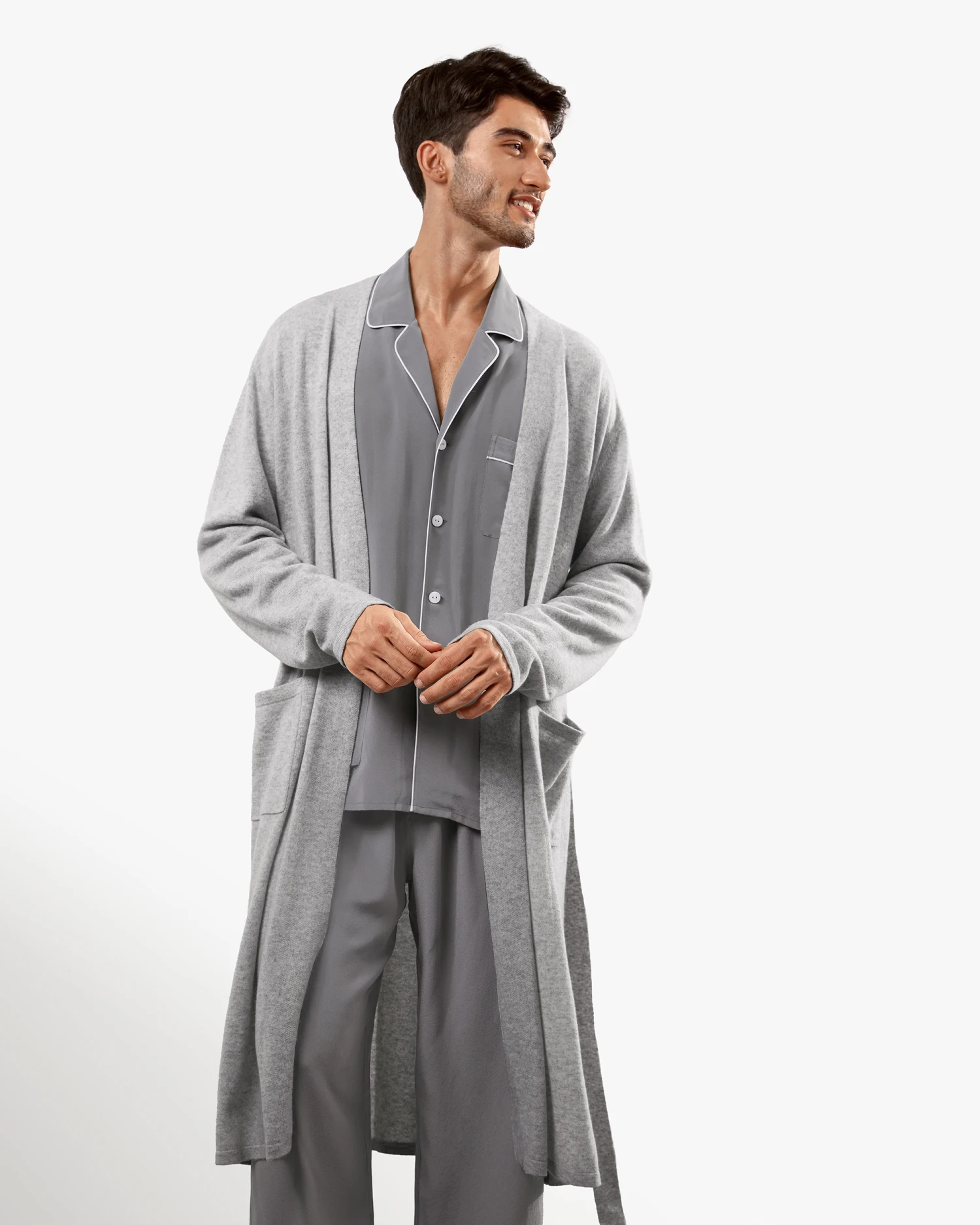 This cashmere robe has been specially woven to give a flat, smooth surface and even luster. It’s soft, warm to the touch, and very comfortable to wear. The minimalist design of this classic robe means that properly styled; it works as nightwear and as a fashionable cardigan.