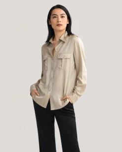 The Sandwashed Pocket Silk Shirt makes a stylish statement in luxuriously soft sandwashed charmeuse silk that’s wrinkle resistant and drapes beautifully. A fashion-forward interpretation of classic safari and military-inspired workwear, this tailored and feminine fit is ultra flattering and versatile. The ultimate ‘everyday’ shirt, it looks great with trousers and skirts, coats and camis, which makes switching looks easier than ever.