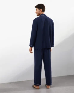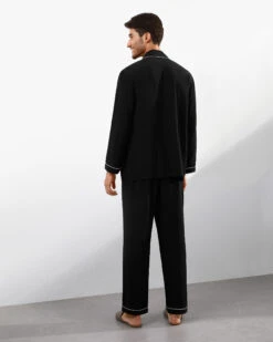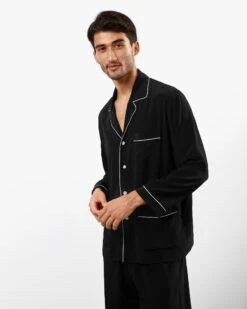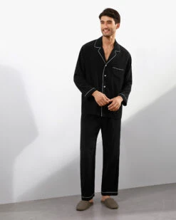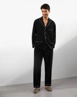 This crepe de chine silk pajama set features drawstring trousers for a comfortable and straightforward fit. A lapel collar adds detail to an otherwise minimalist but classic design. Pockets allow you to store small, essential items effortlessly. As silk is skin-friendly and breathable, this pajama set is suitable for every season.
