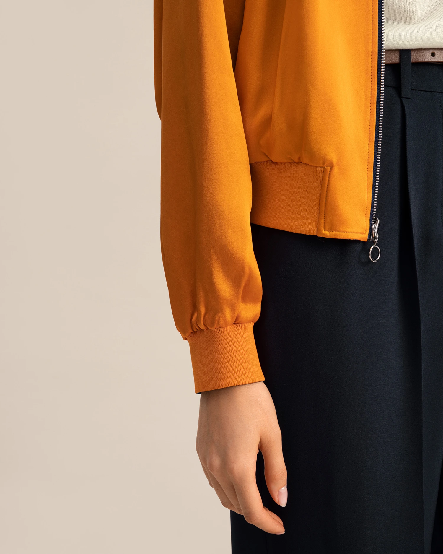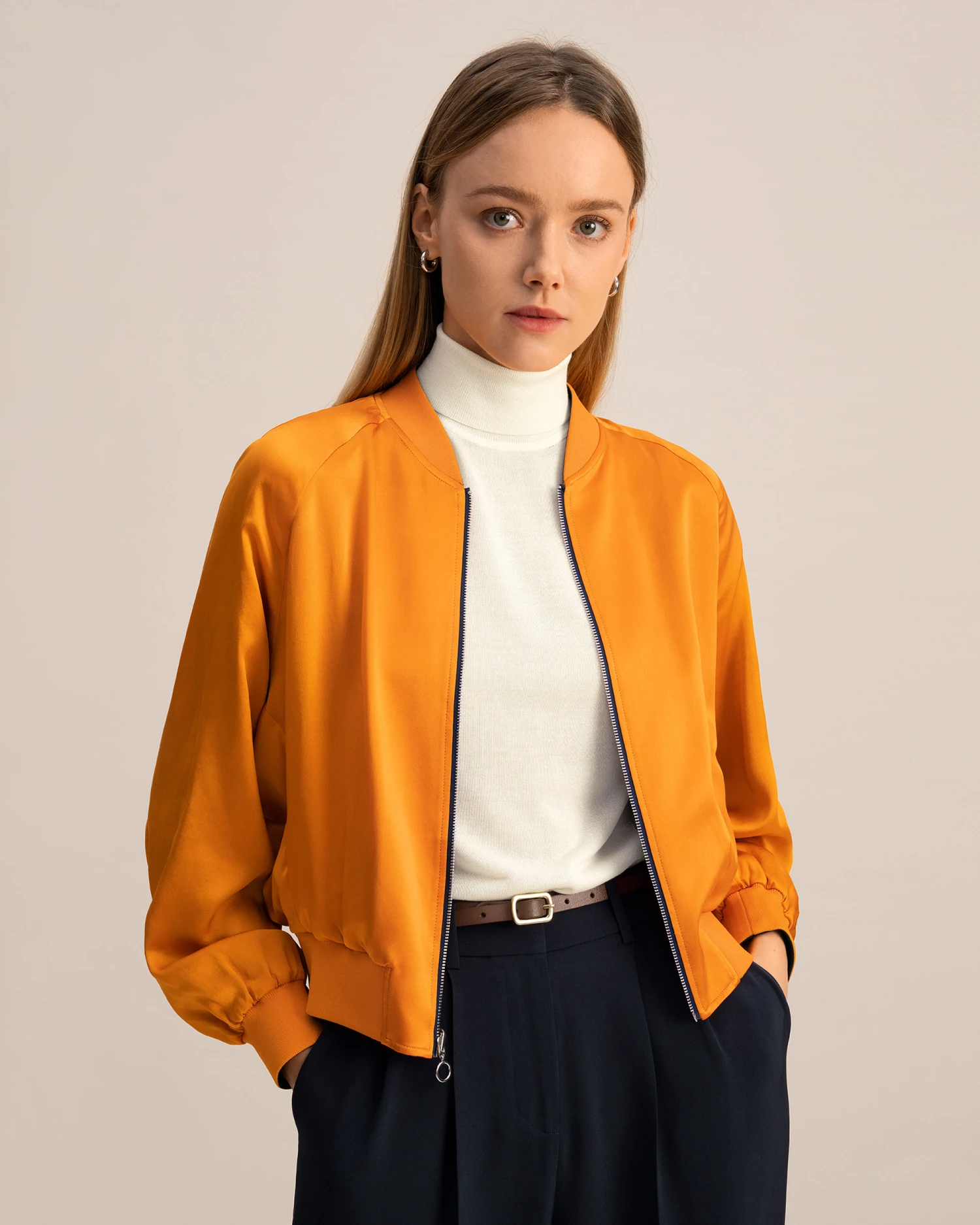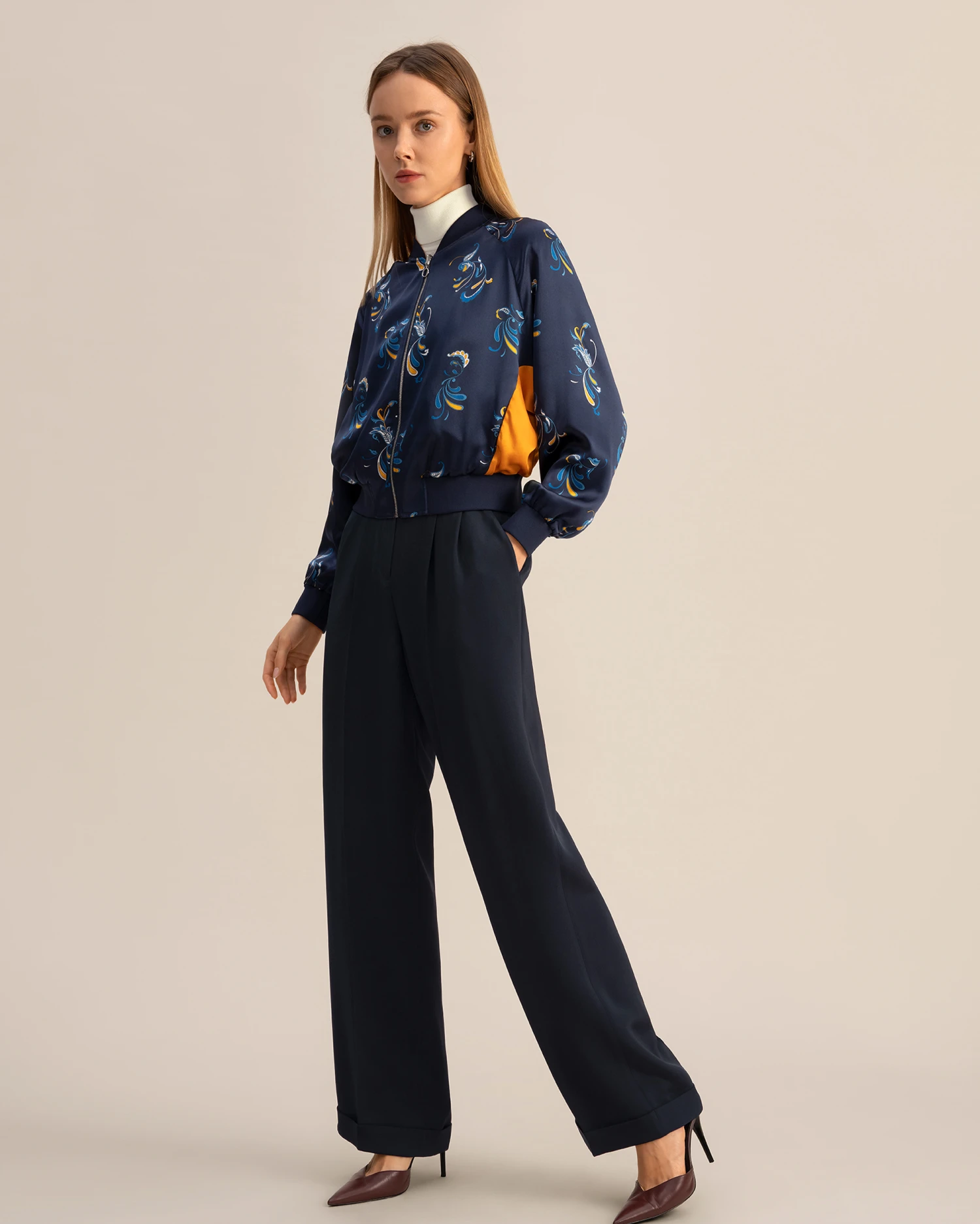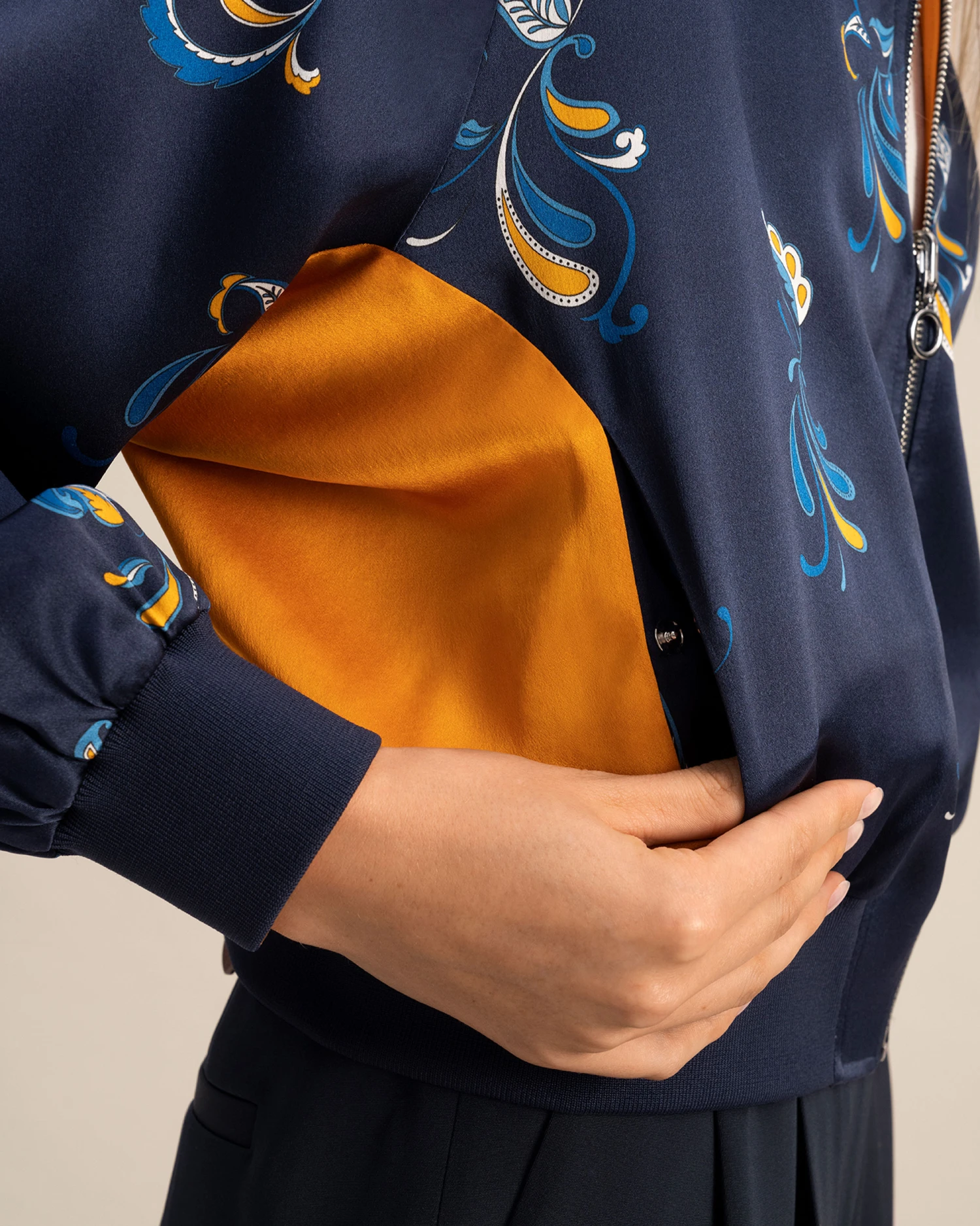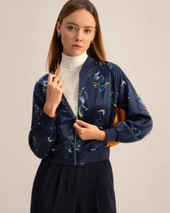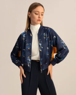 This silk reversible bomber jacket, with bright prints and plain wrinkled satin glossy fabrics, makes casual sports more luxurious. You can choose which side to match according to the clothing style of different occasions, which makes this jacket more practical.