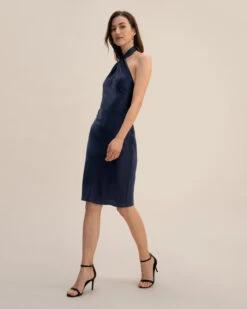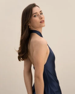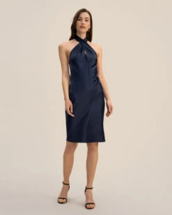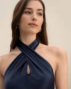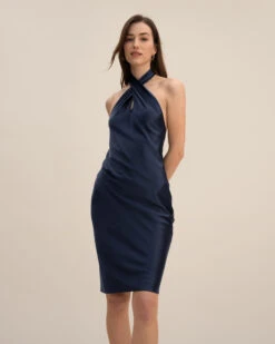 The color navy blue gives this 100% silk charmeuse dress a low-key premium quality shine, while the sash cross neck strap design and the contour of this dress flatters your body shape and brings out the person wearing the dress. This dress is a good choice for special occasions such as vacations and parties.