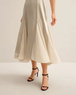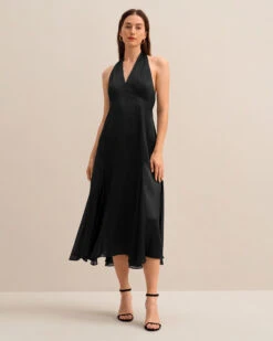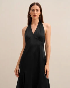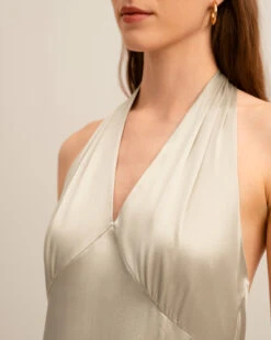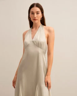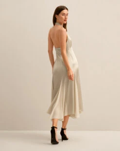 Get ready to make a serious statement in sleek sophistication in the Aster Dress. A halter neck and open back play into this feminine silhouette which is spliced with 10 momme chiffon for a touch of translucence and movement. Featherlight and flexible, you’ll sway from day to night in this dress’s flowing midcalf skirt perfect for daytime drama or evening elegance.