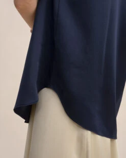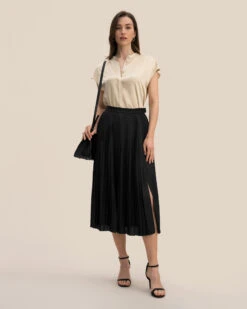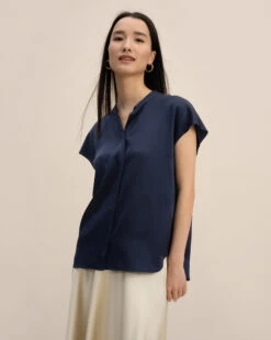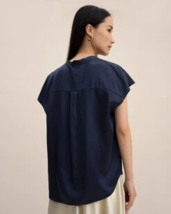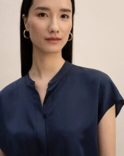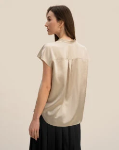 Classic and simple shirt with small stand-up collar, slightly dropped shoulder design, modified shoulder shape, casual and relaxed, basic and versatile, silk satin material, cool and silky in summer, suitable for matching with trousers or skirts.