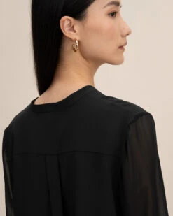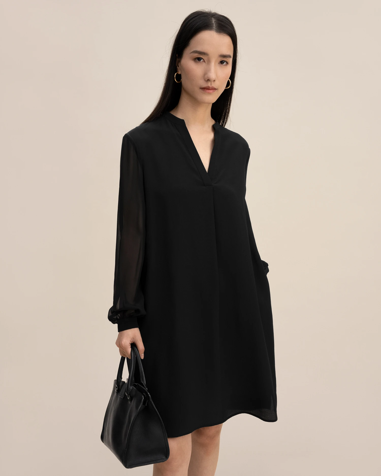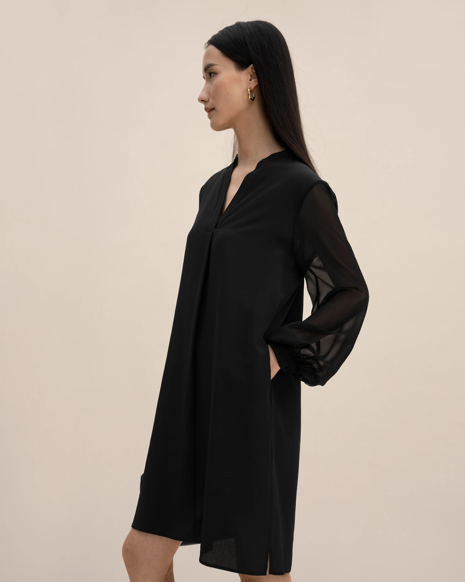 With two kinds of material stitching, this dress has loose pullover sleeves, comfortable and relaxed, georgette sleeves are translucent, the arms are faintly visible, sunscreen and breathable, suitable for relaxed and free leisure and vacation wear, and can also be worn with the leather belt cinches the waist, delicate and elegant.