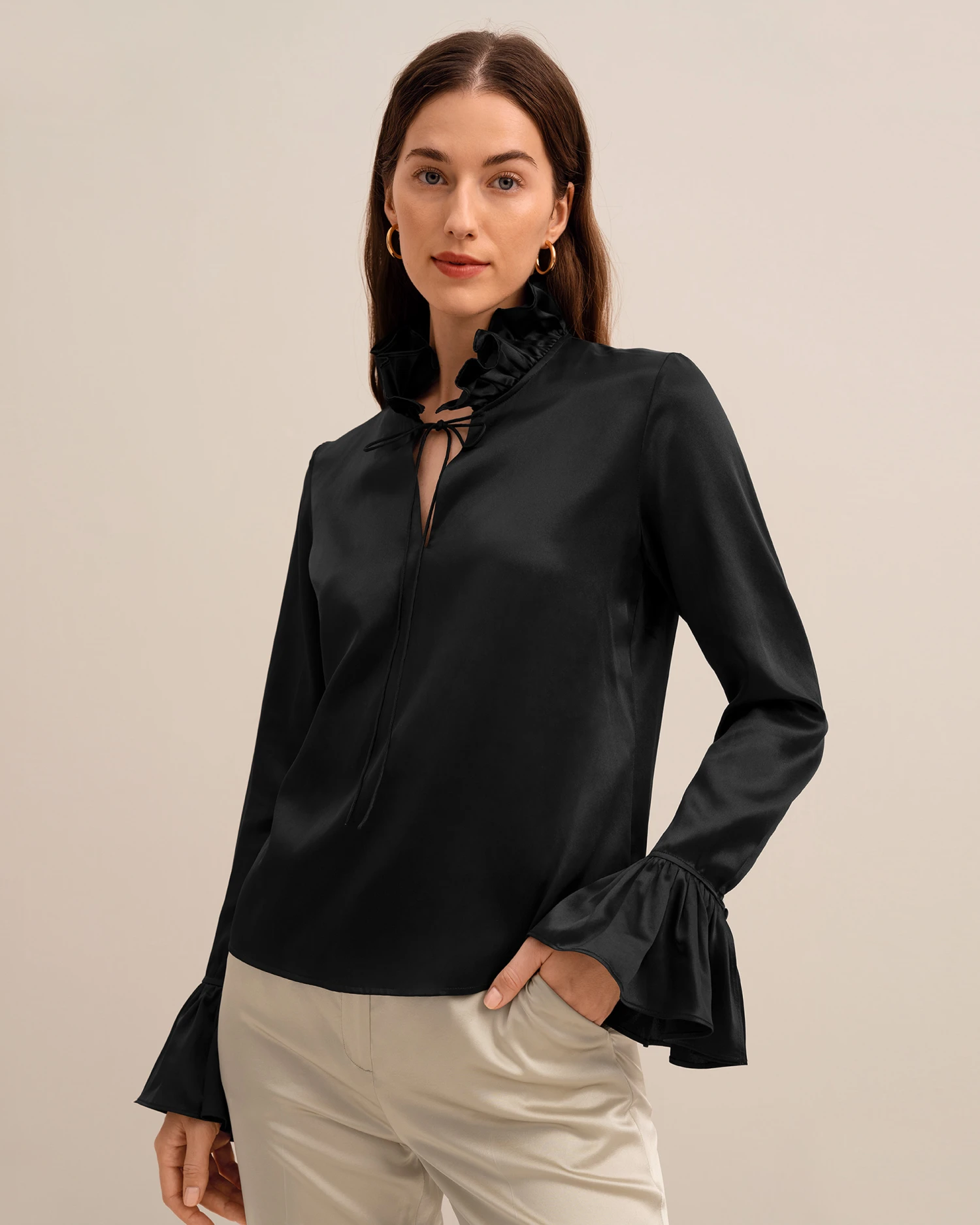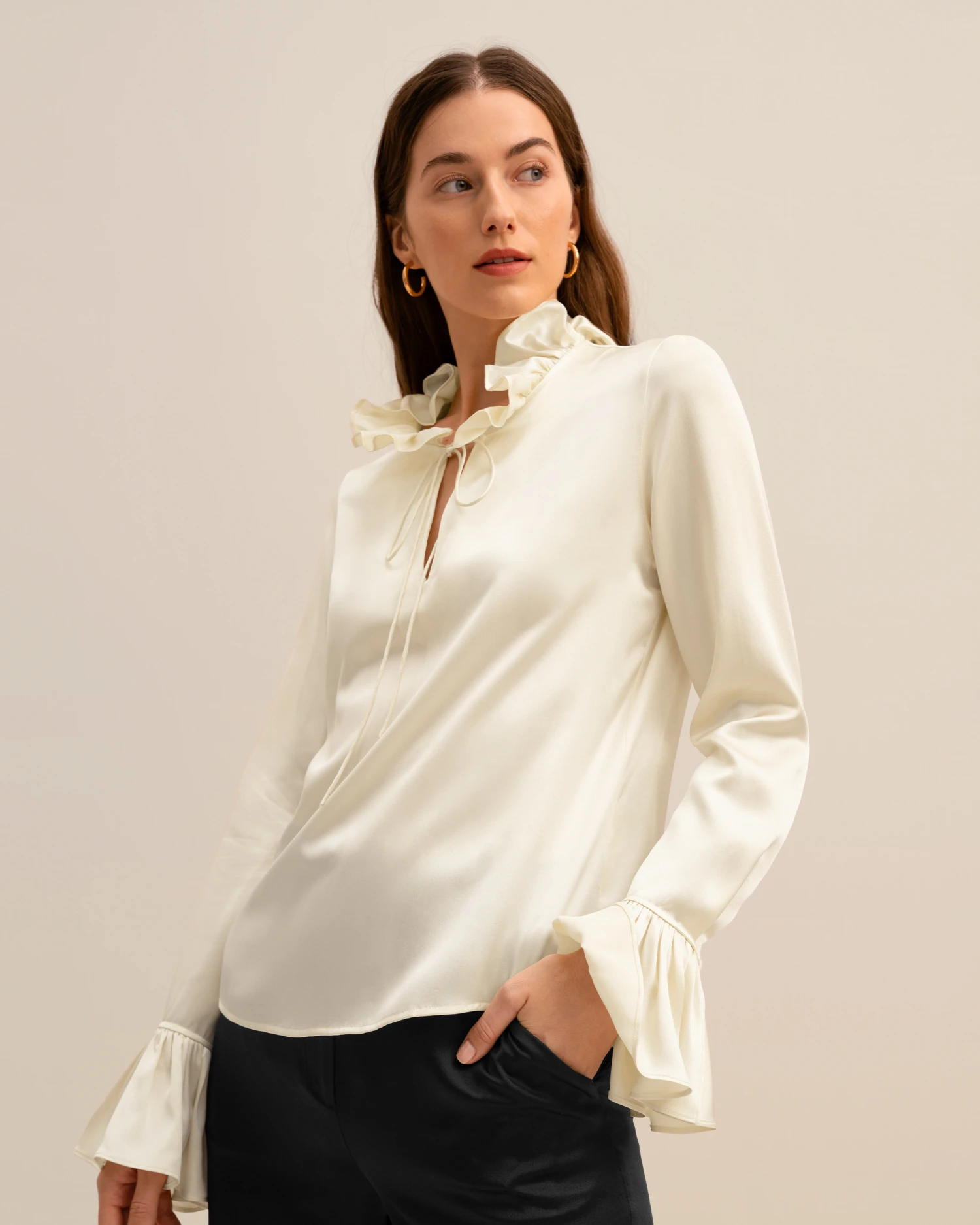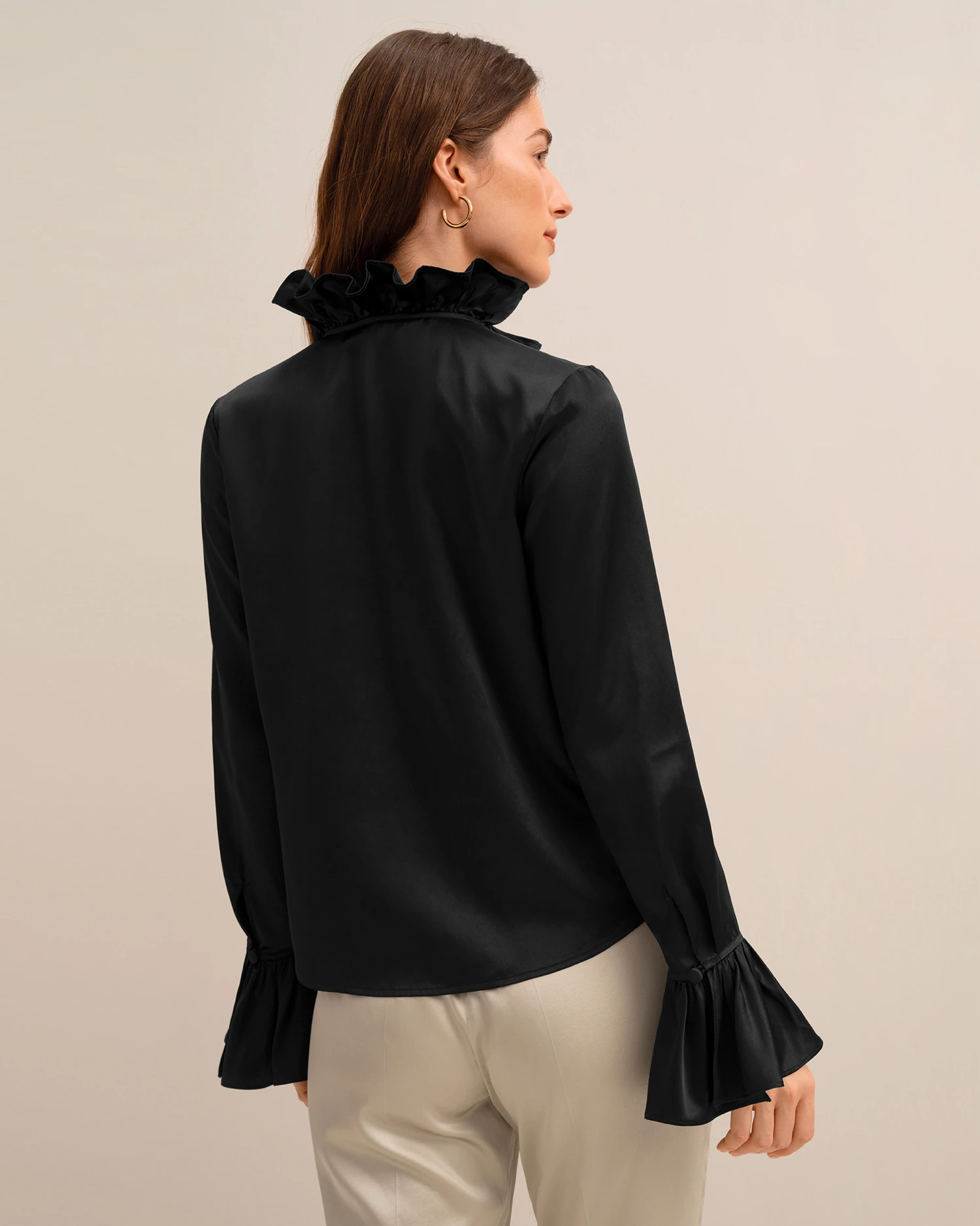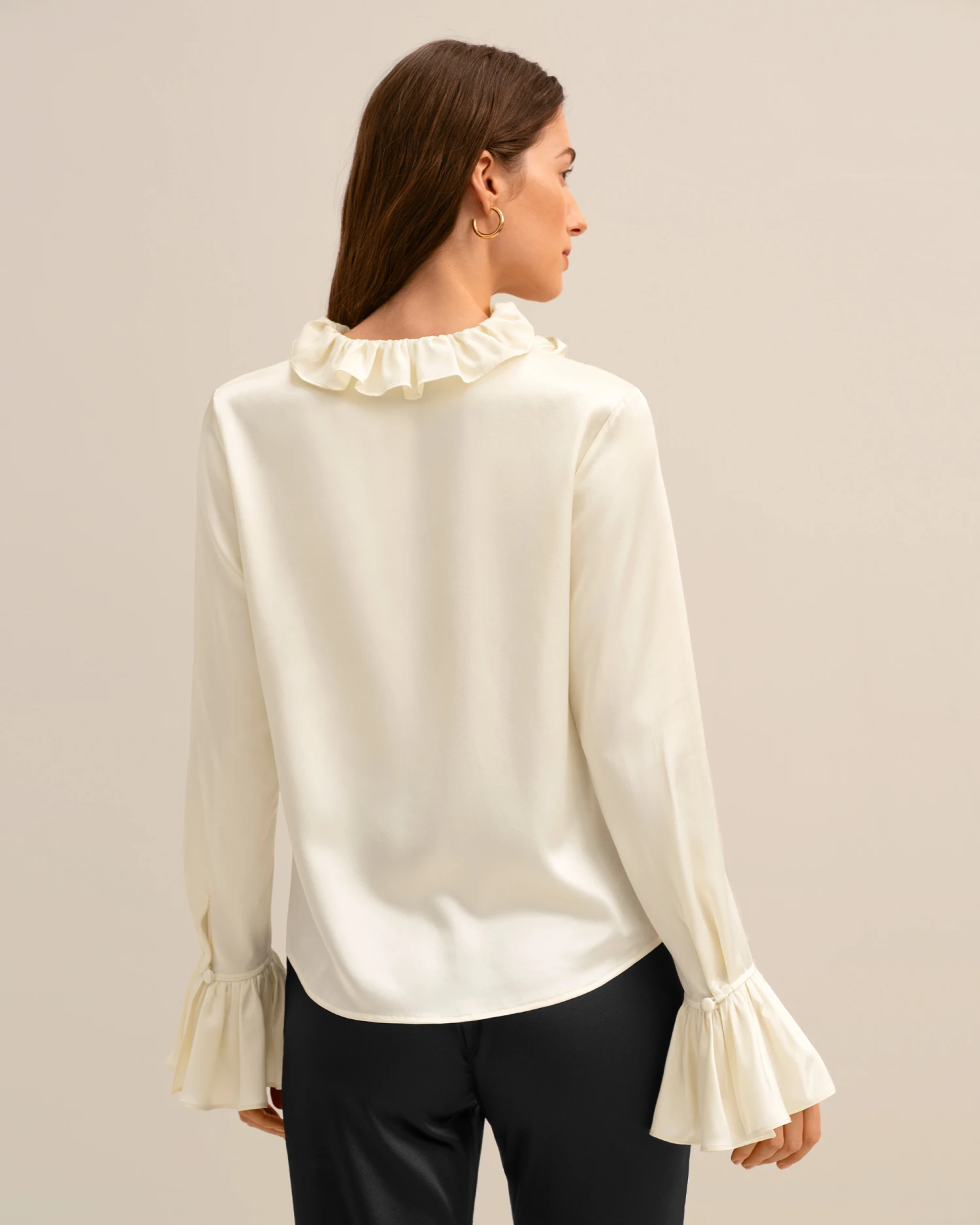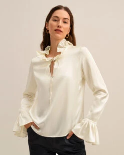 Let romance blossom in this dreamy pullover silk blouse featuring petal-like ruffles along the neckline and cuffs for a whimsical and vintage appeal. Crafted from 22 momme charmeuse silk for luxe softness and sheen, you’ll also adore the versatility of the tie collar which can be worn tied in a feminine bow at the neck or open for an effortlessly undone look.