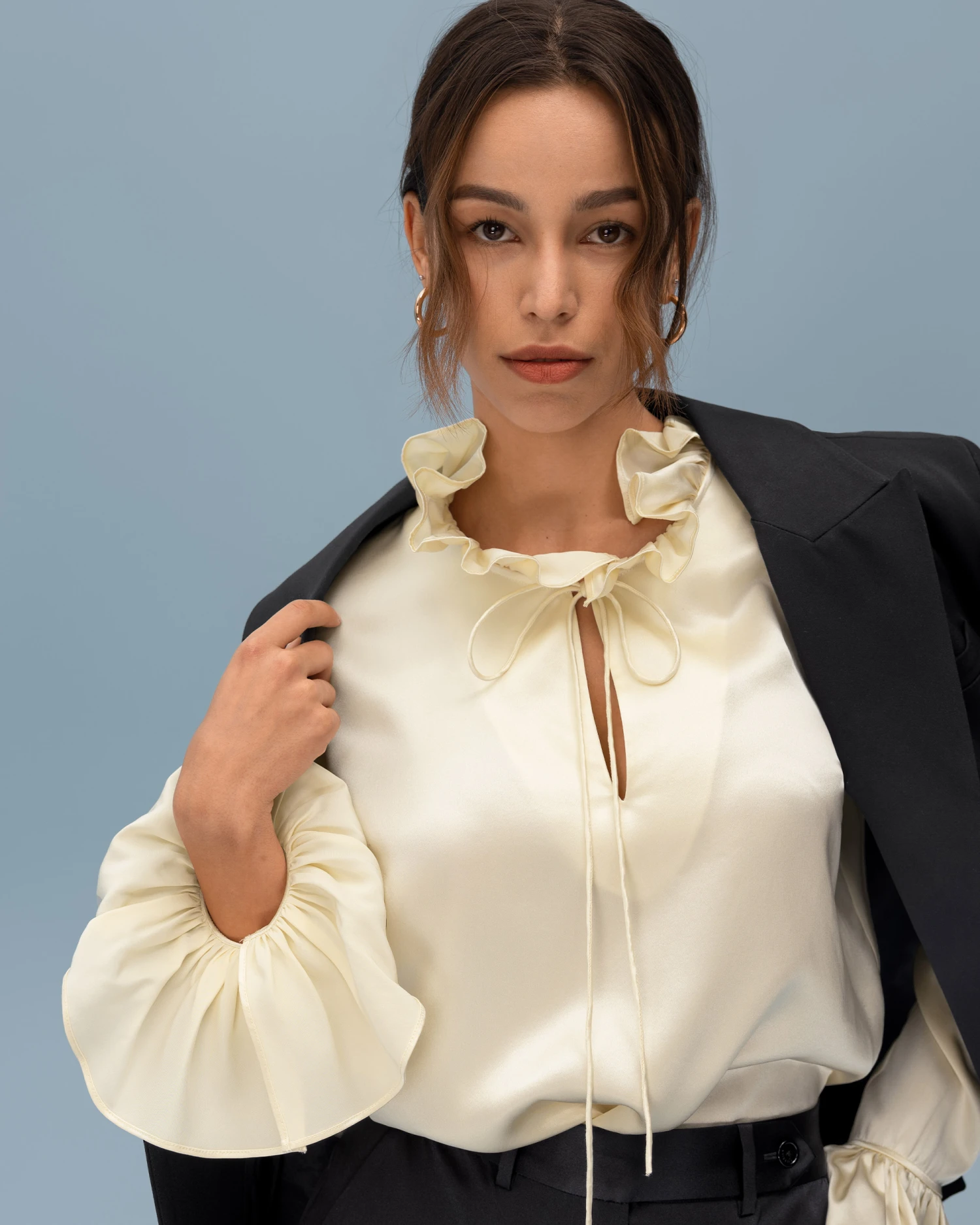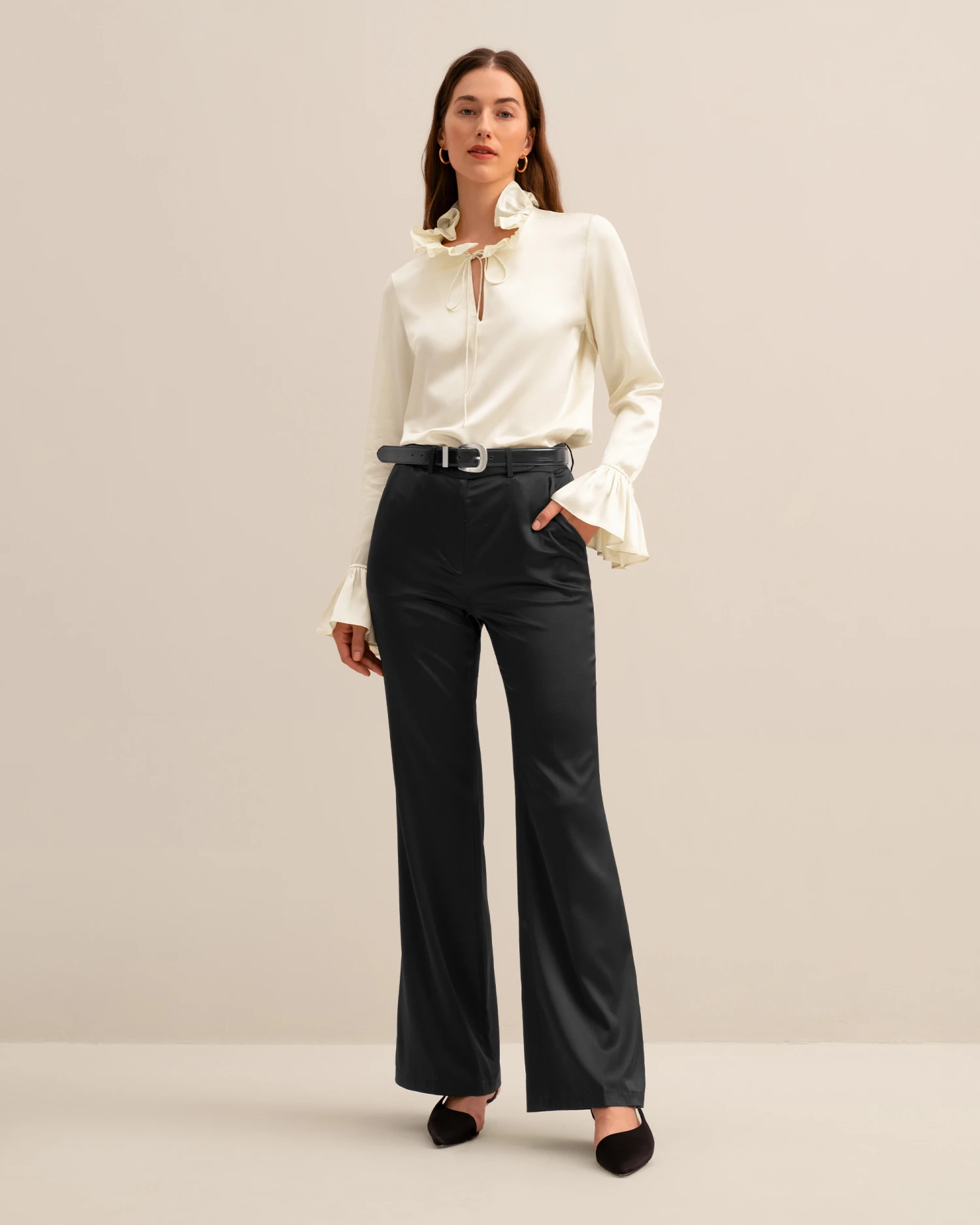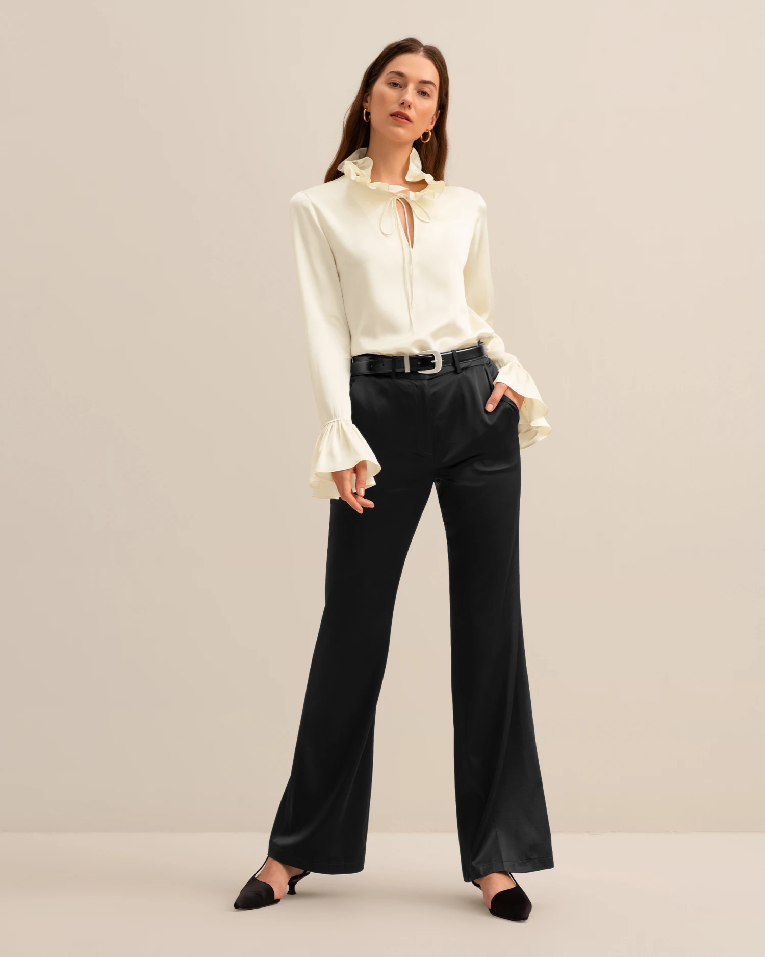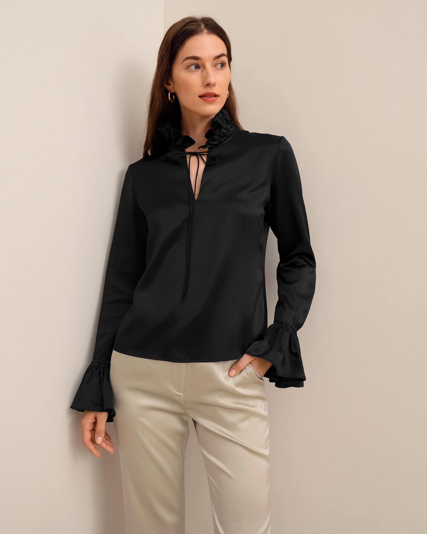 Let romance blossom in this dreamy pullover silk blouse featuring petal-like ruffles along the neckline and cuffs for a whimsical and vintage appeal. Crafted from 22 momme charmeuse silk for luxe softness and sheen, you’ll also adore the versatility of the tie collar which can be worn tied in a feminine bow at the neck or open for an effortlessly undone look.