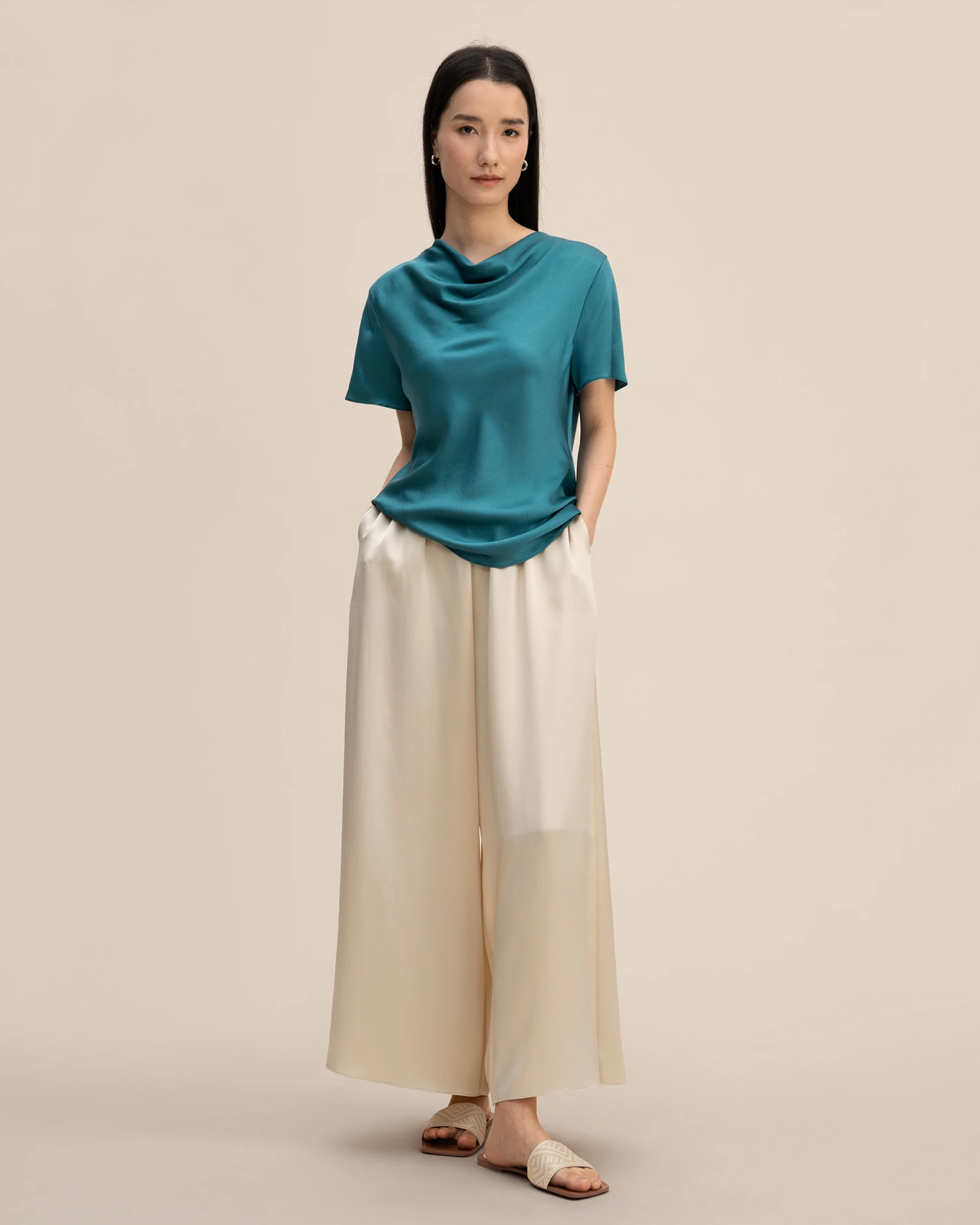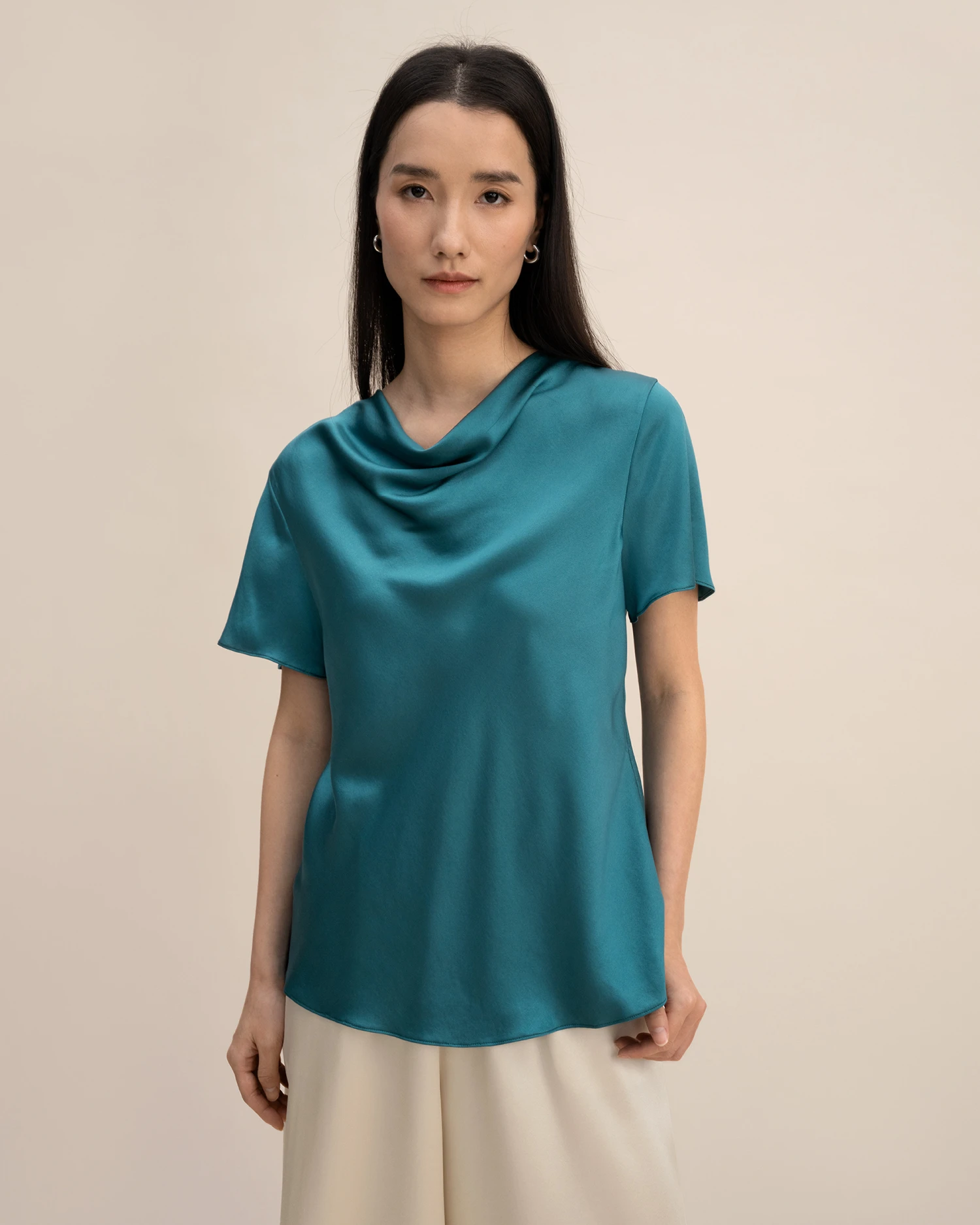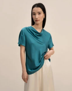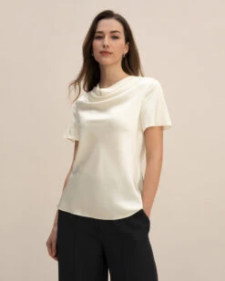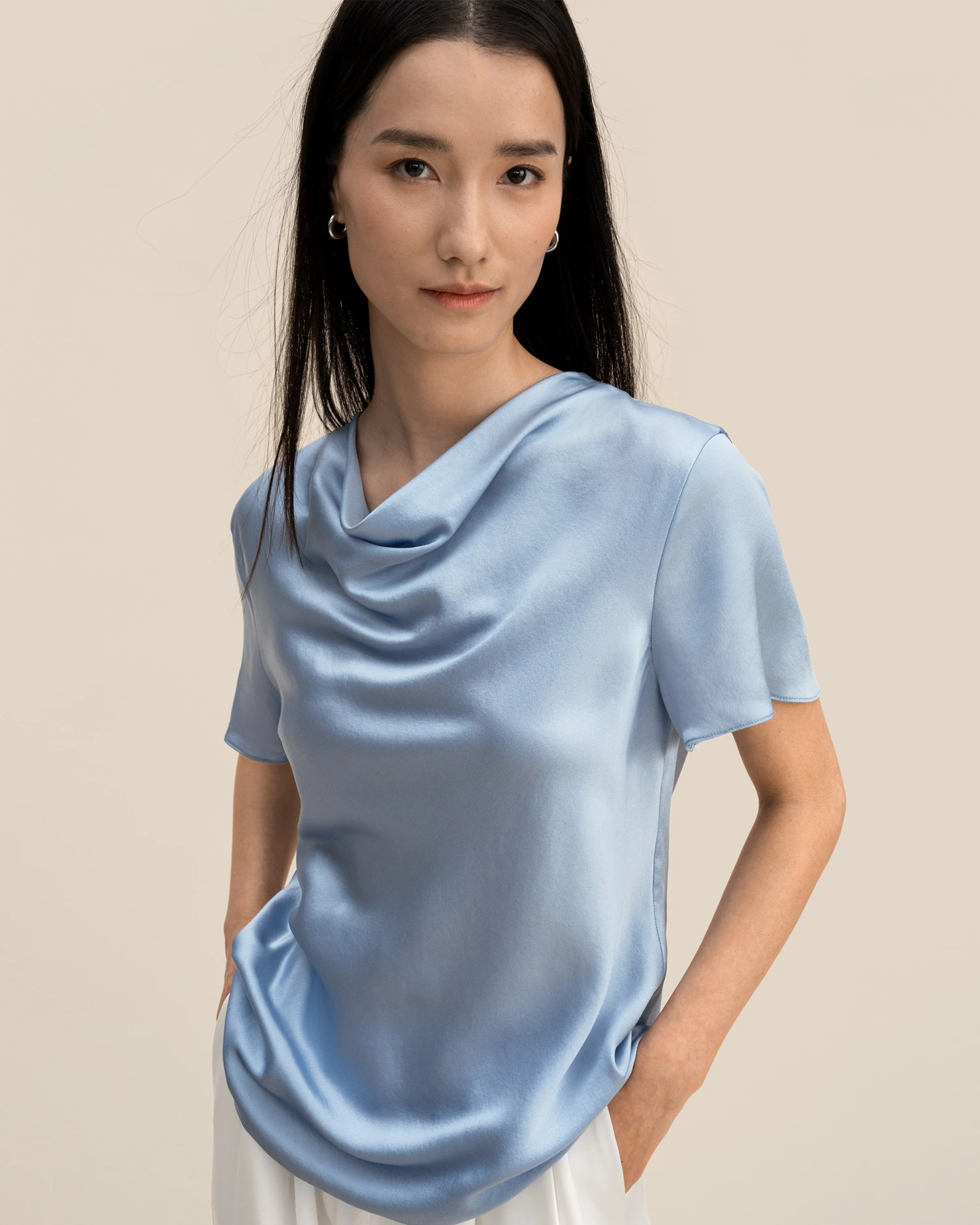 Achieve elegance with ease! Each fold of the cowl neck t-shirt emphasizes the luminousness and shine of the silk charmeuse, this top looks great paired with shorts or wide-leg pants for a casual look, or skirts for a more feminine and graceful outfit.