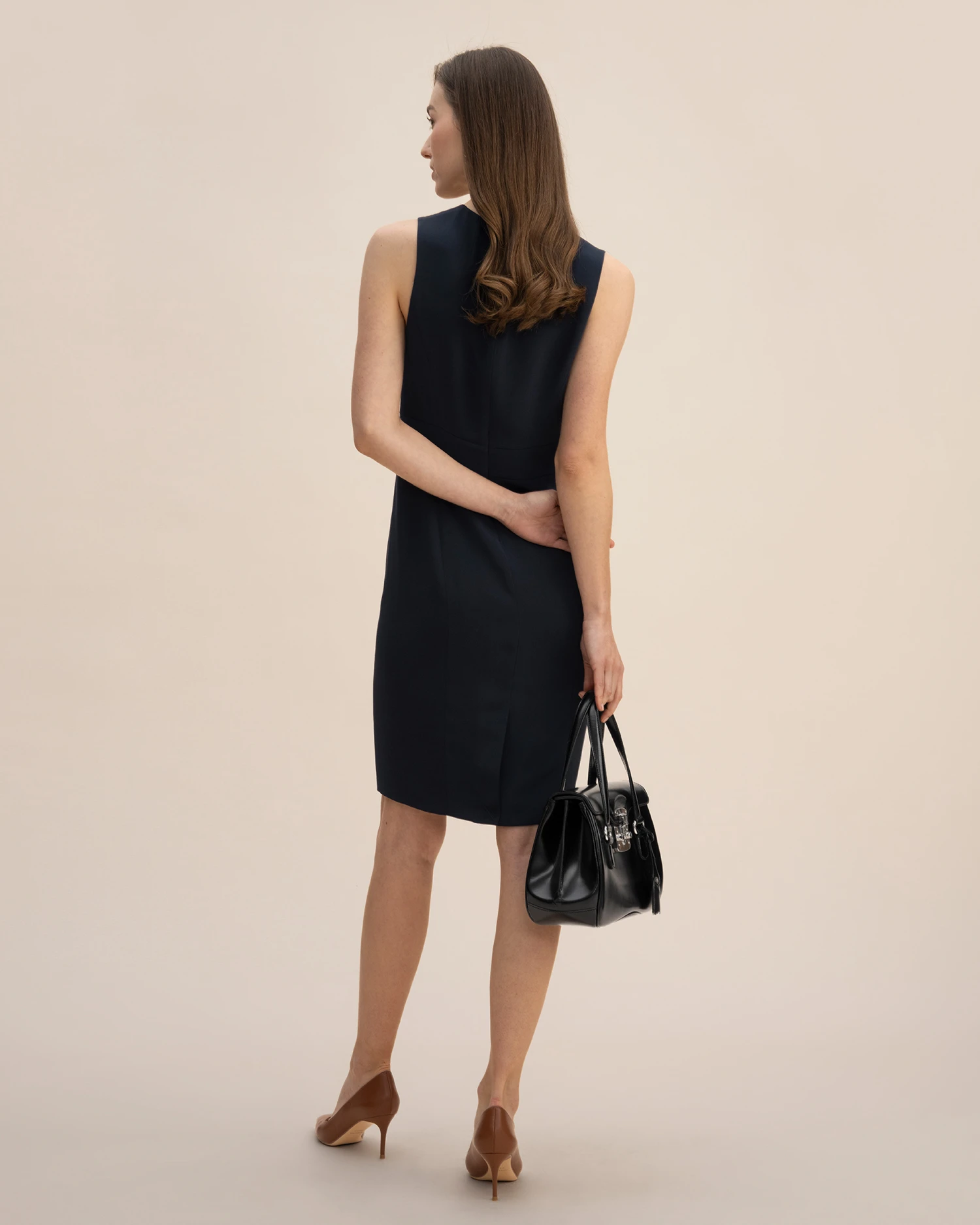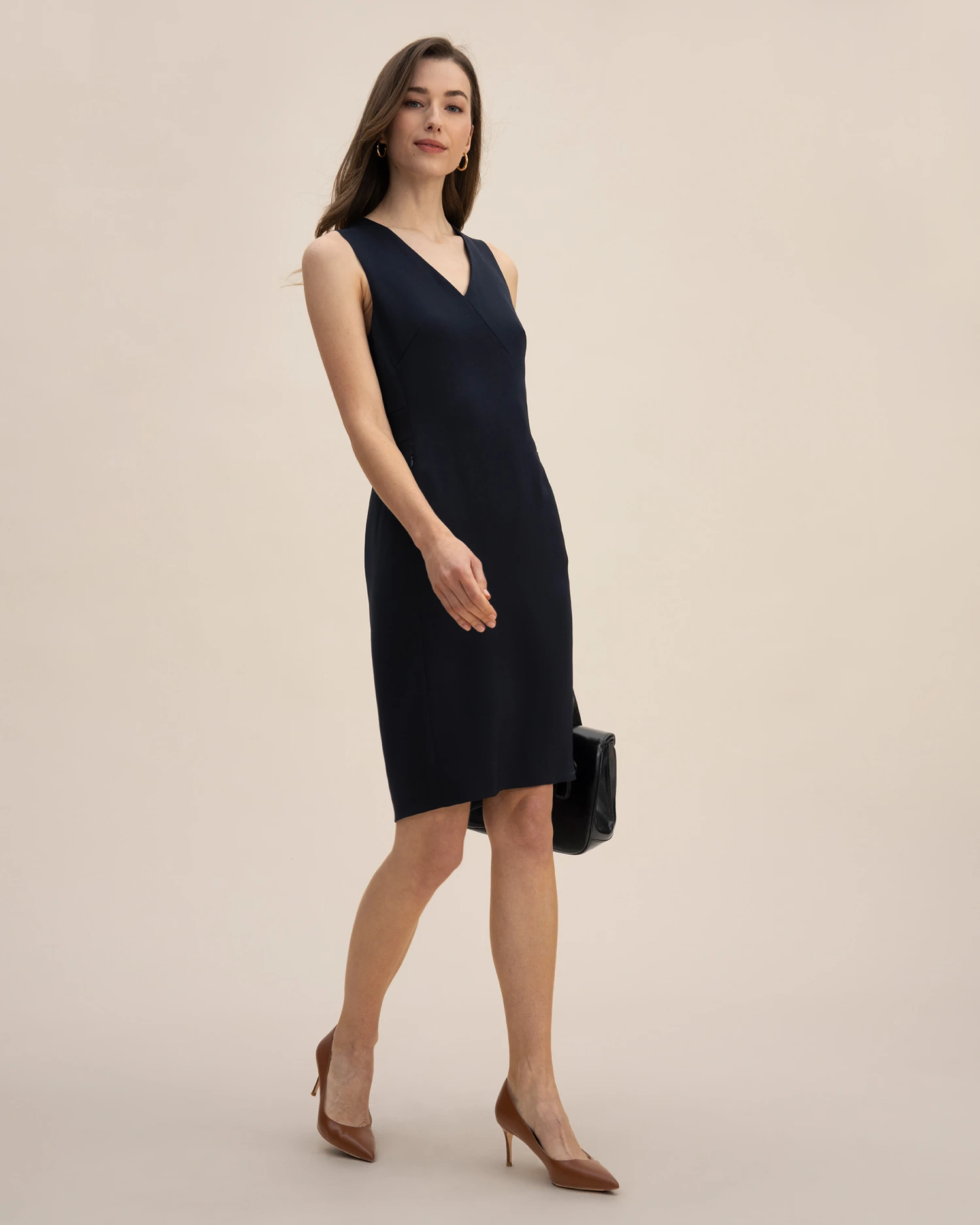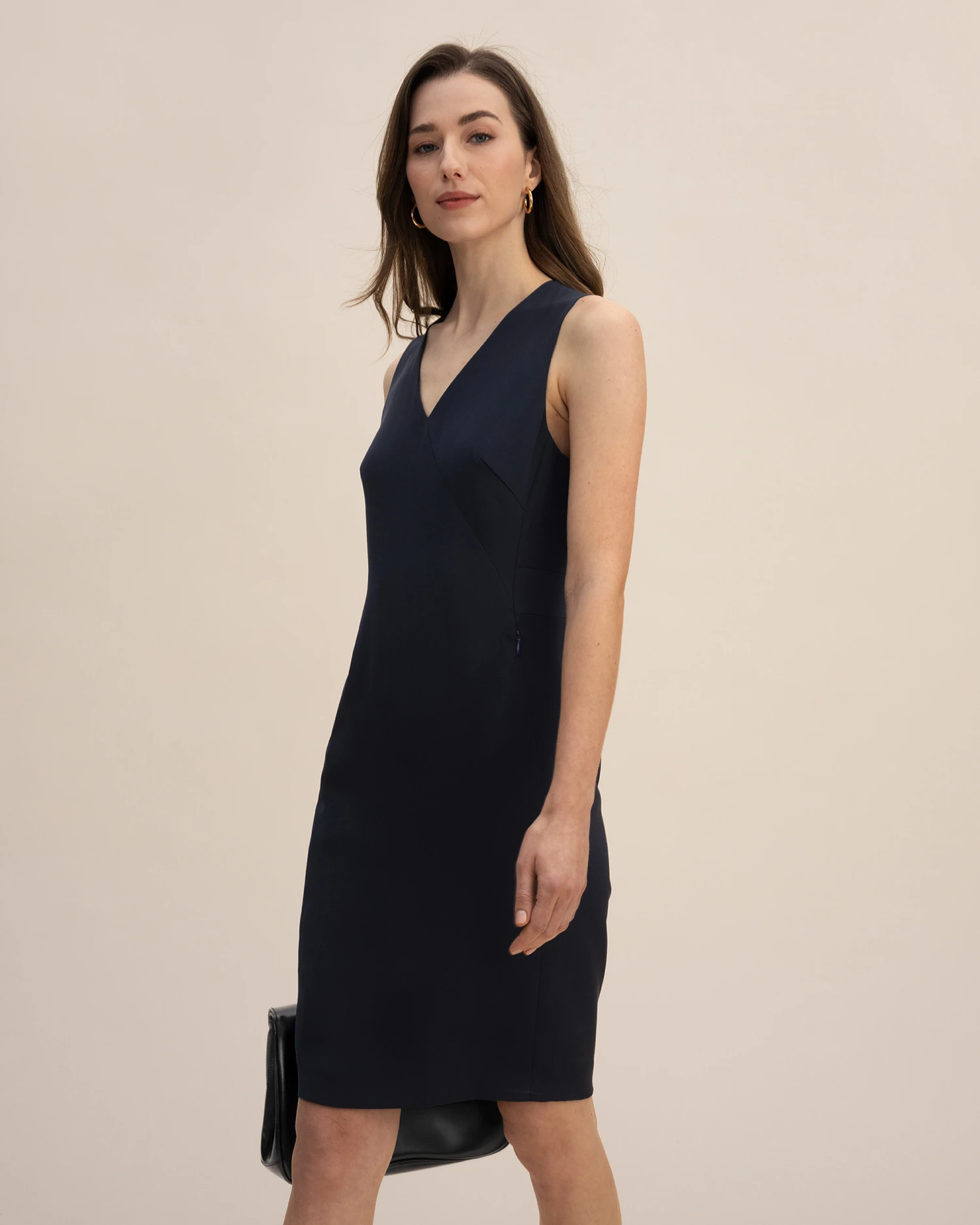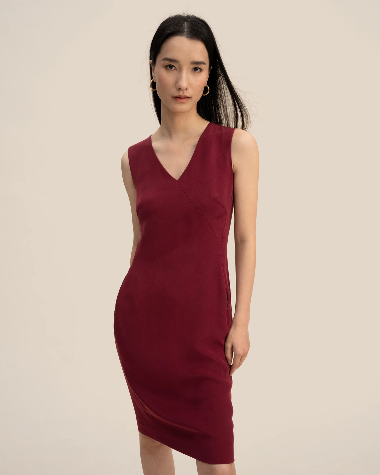 Classic basic V-neck straight skirt, heavy crepe silk fabric, wider and more wrinkle-resistant than conventional silk fabrics, exquisite and comfortable, showing taste, side zipper, pockets, fit neatly, suitable for workplace wear.