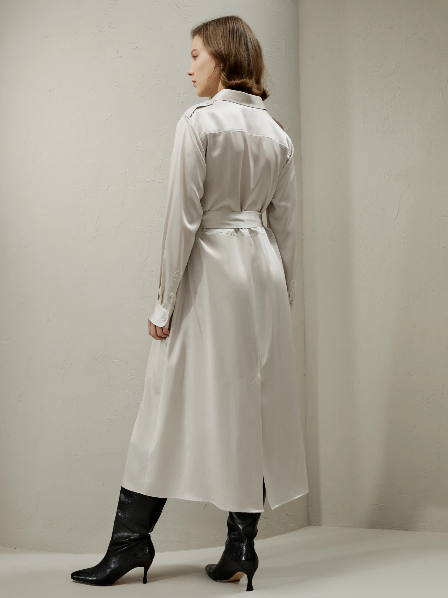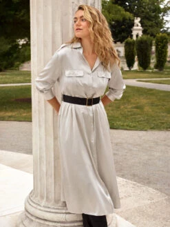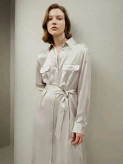 This dress draws inspiration from both trench coats and safari styles, resulting in a versatile and elegant piece. Designed with flap chest pockets, a V-neck, and a pointed collar, it can be easily customized with different belts for a perfect fit.