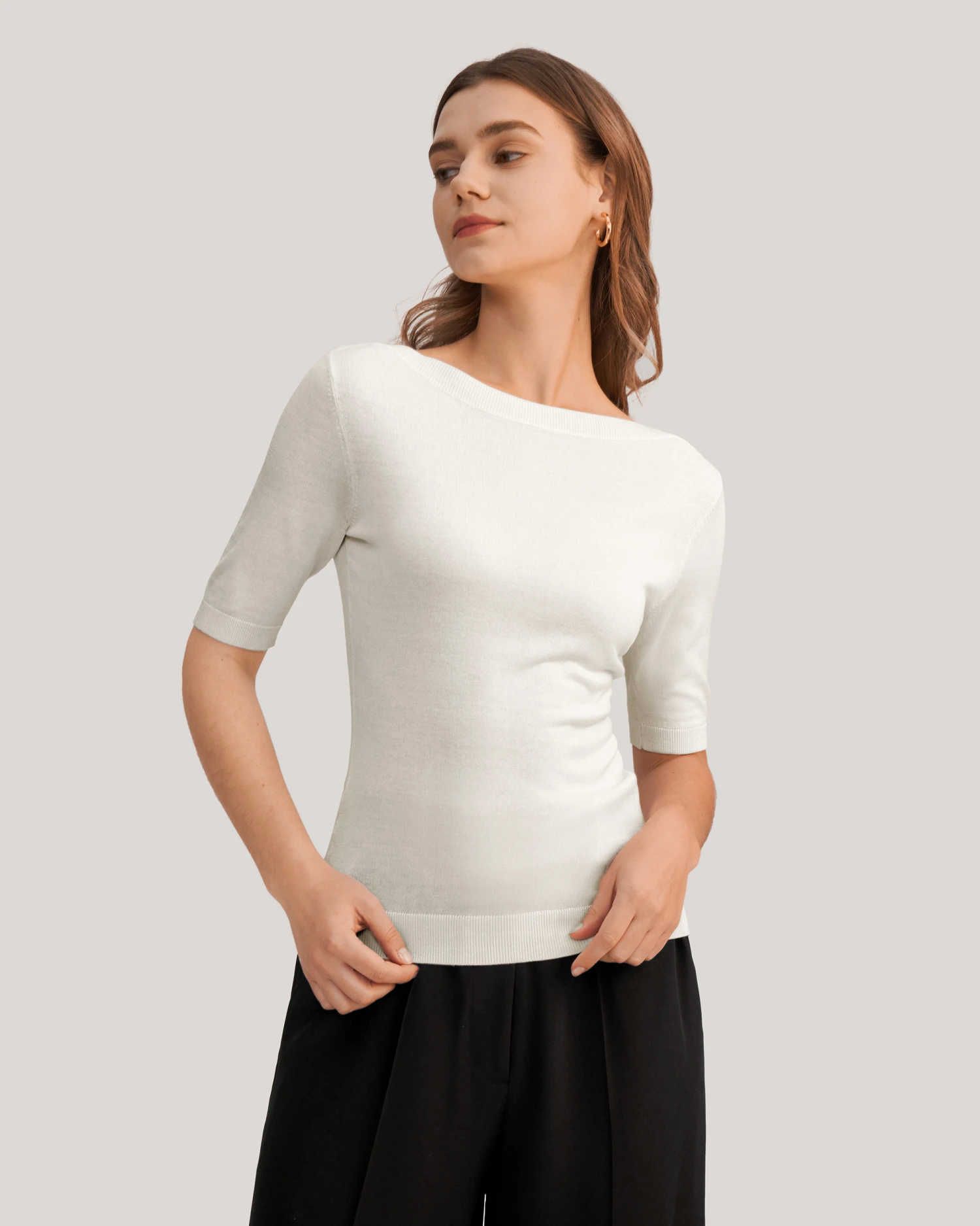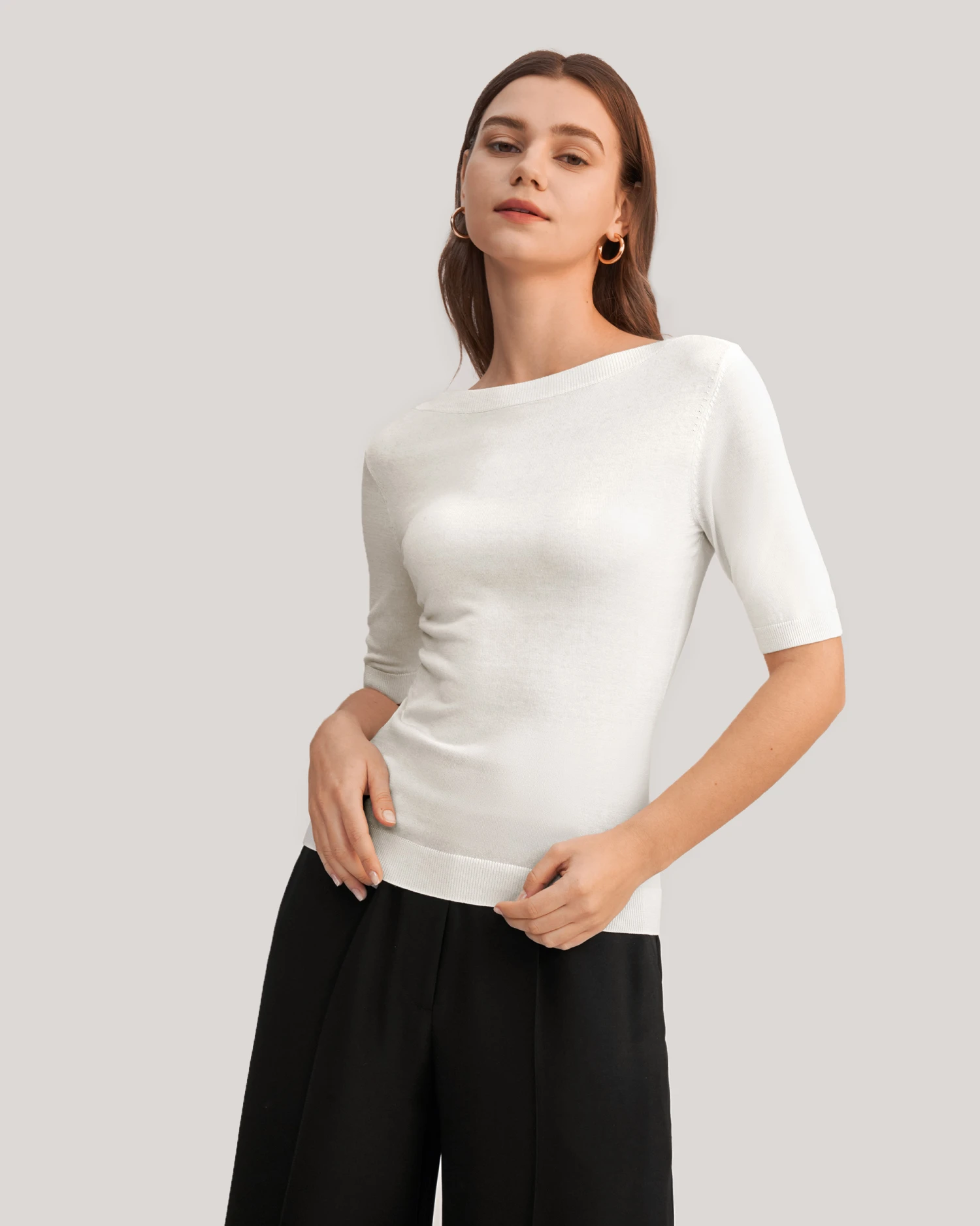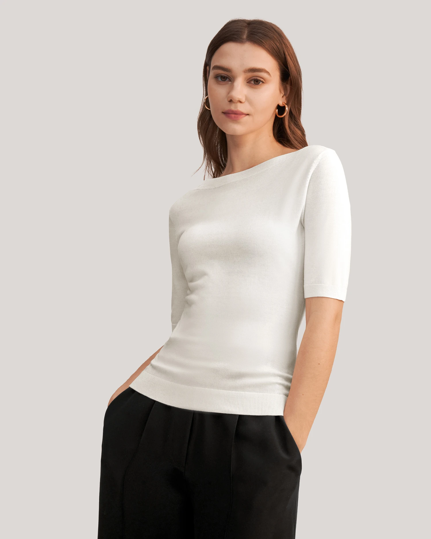 A knit for all seasons, the Boat Neck Silk Knit Top will comfort and care for your skin throughout the year. Fitted with a ribbed neckline and ¾ length sleeves, this will hug you in all of the correct places without feeling uncomfortable. This top will move with you as you glide through everyday activities, a must-have for now and forever.