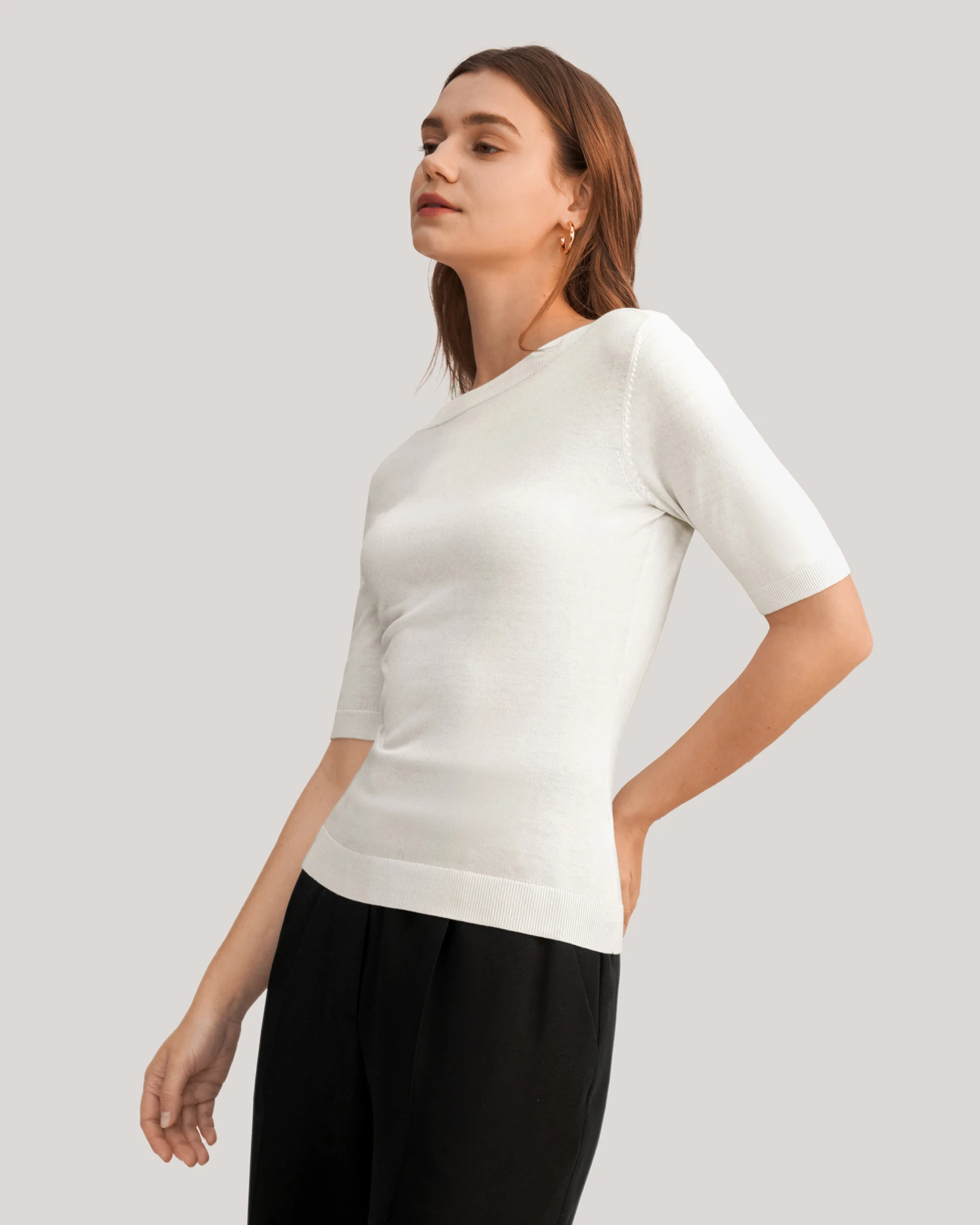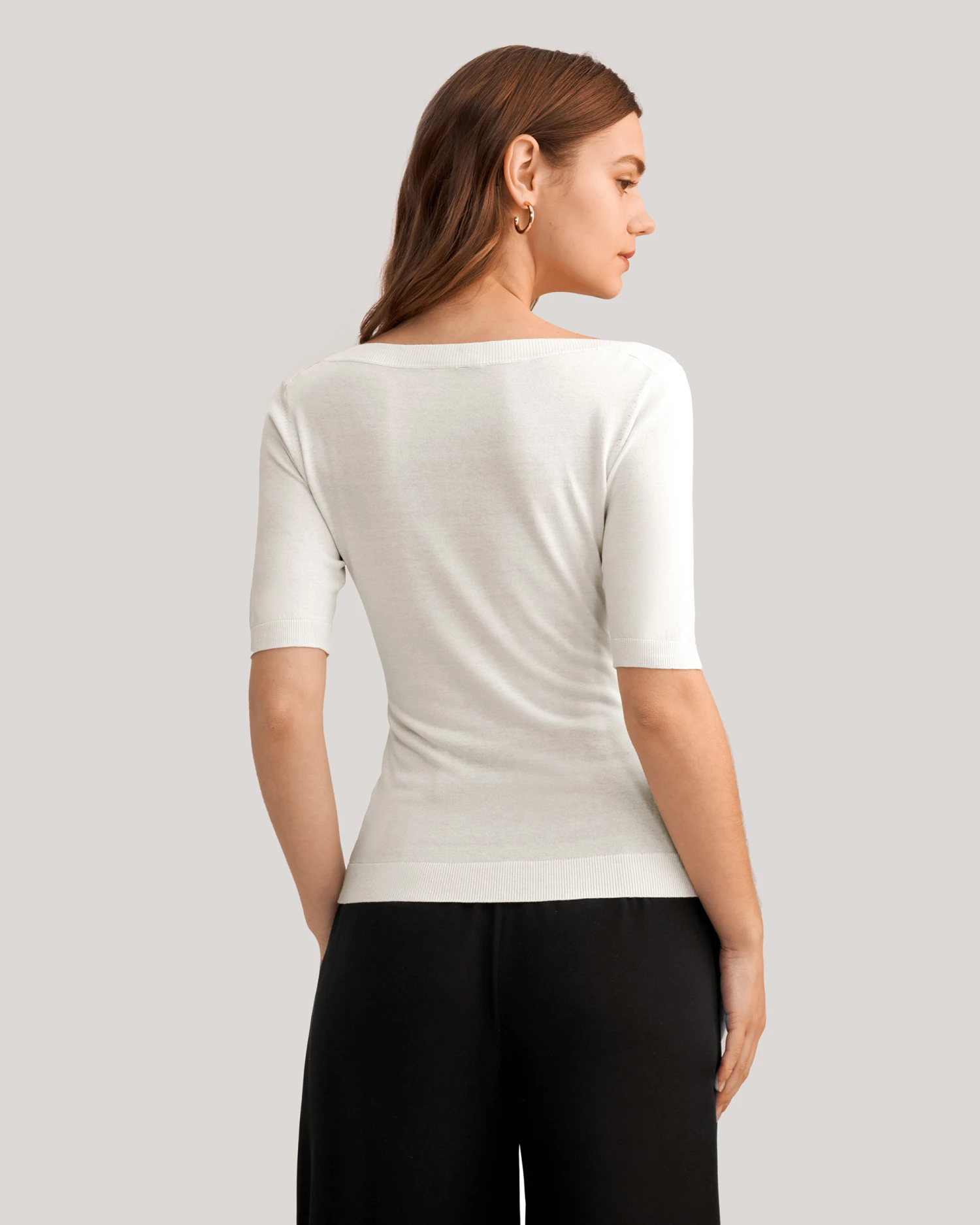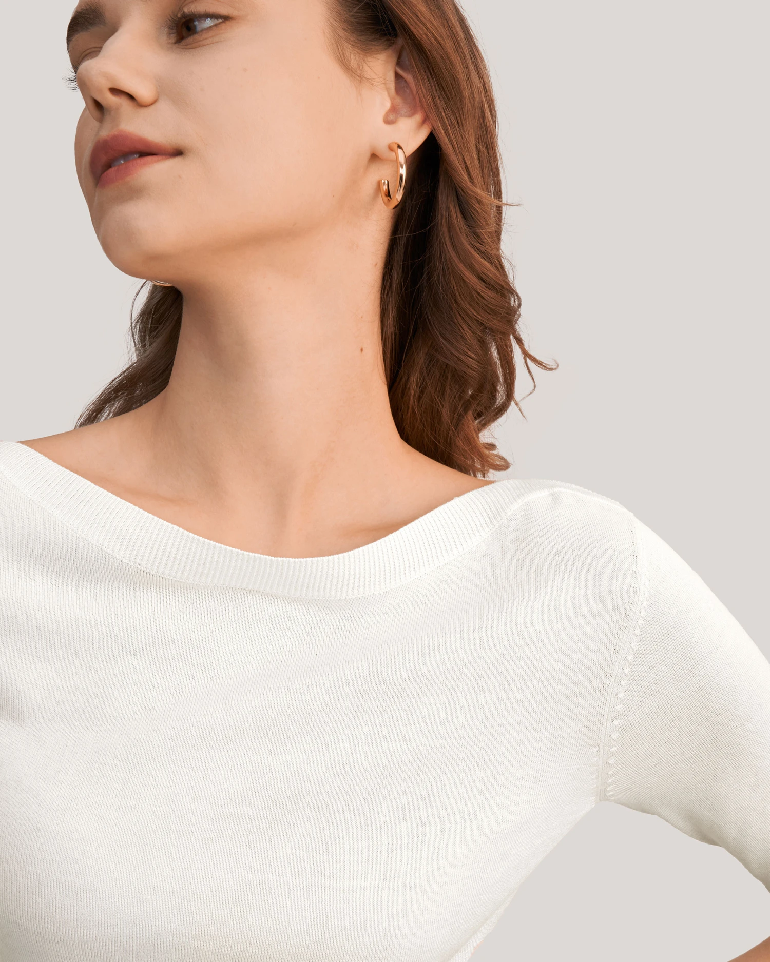A knit for all seasons, the Boat Neck Silk Knit Top will comfort and care for your skin throughout the year. Fitted with a ribbed neckline and ¾ length sleeves, this will hug you in all of the correct places without feeling uncomfortable. This top will move with you as you glide through everyday activities, a must-have for now and forever.
