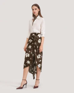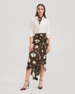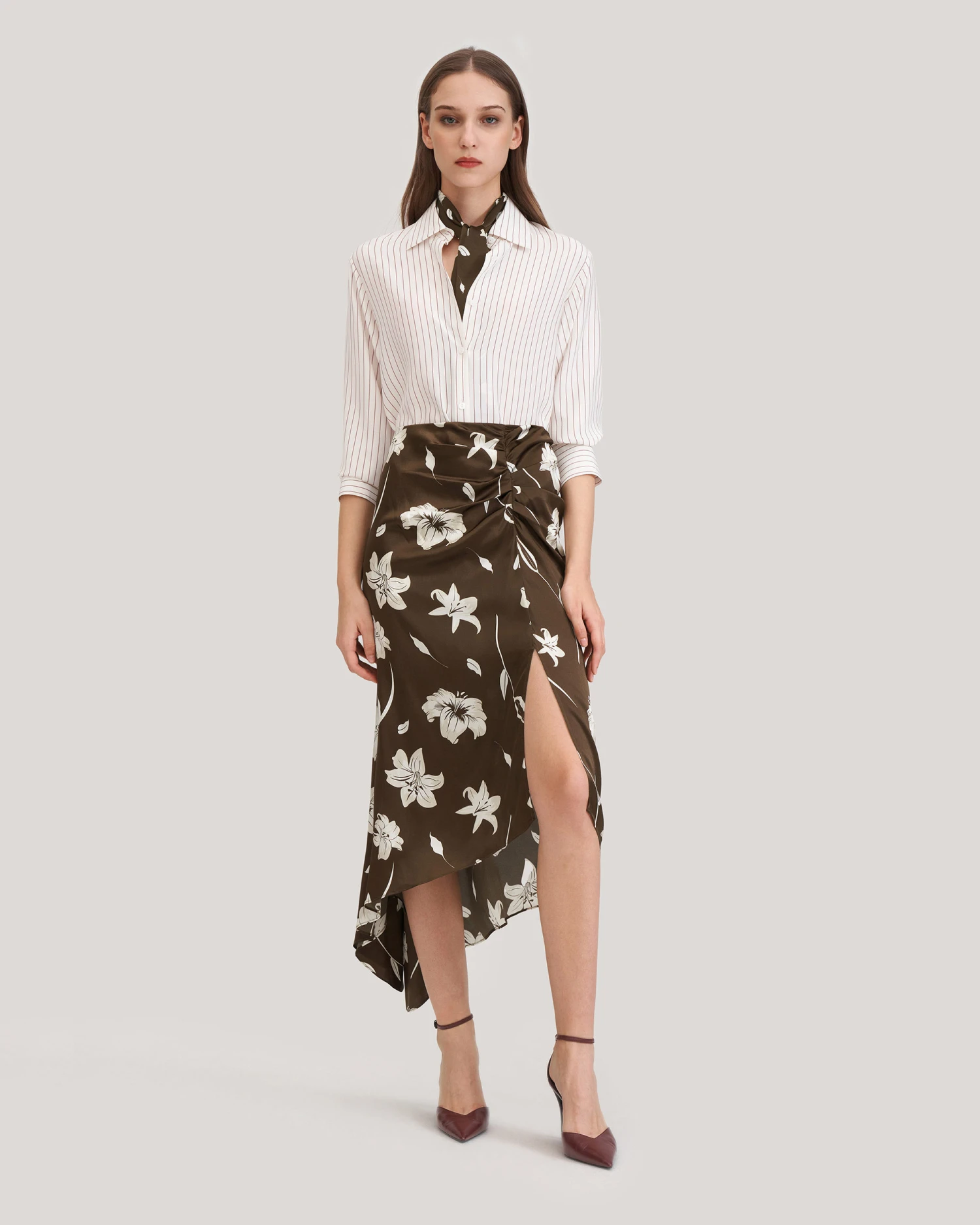 Step confidently into spring in this whimsical stretch silk midi skirt adorned with a bold vintage lily print. More to love about it? Cinching at the waist, an asymmetric hem, shirring detail, and a front slit feel fresh and flattering in featherlight silk. Style for any special spring occasion with our Violet top.