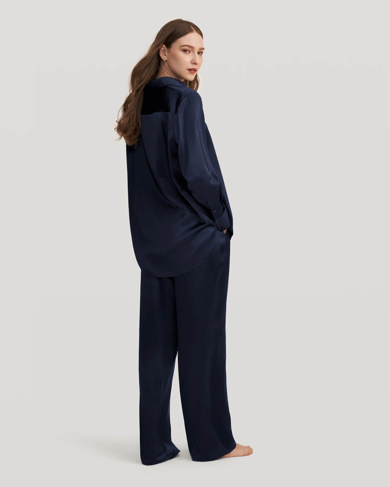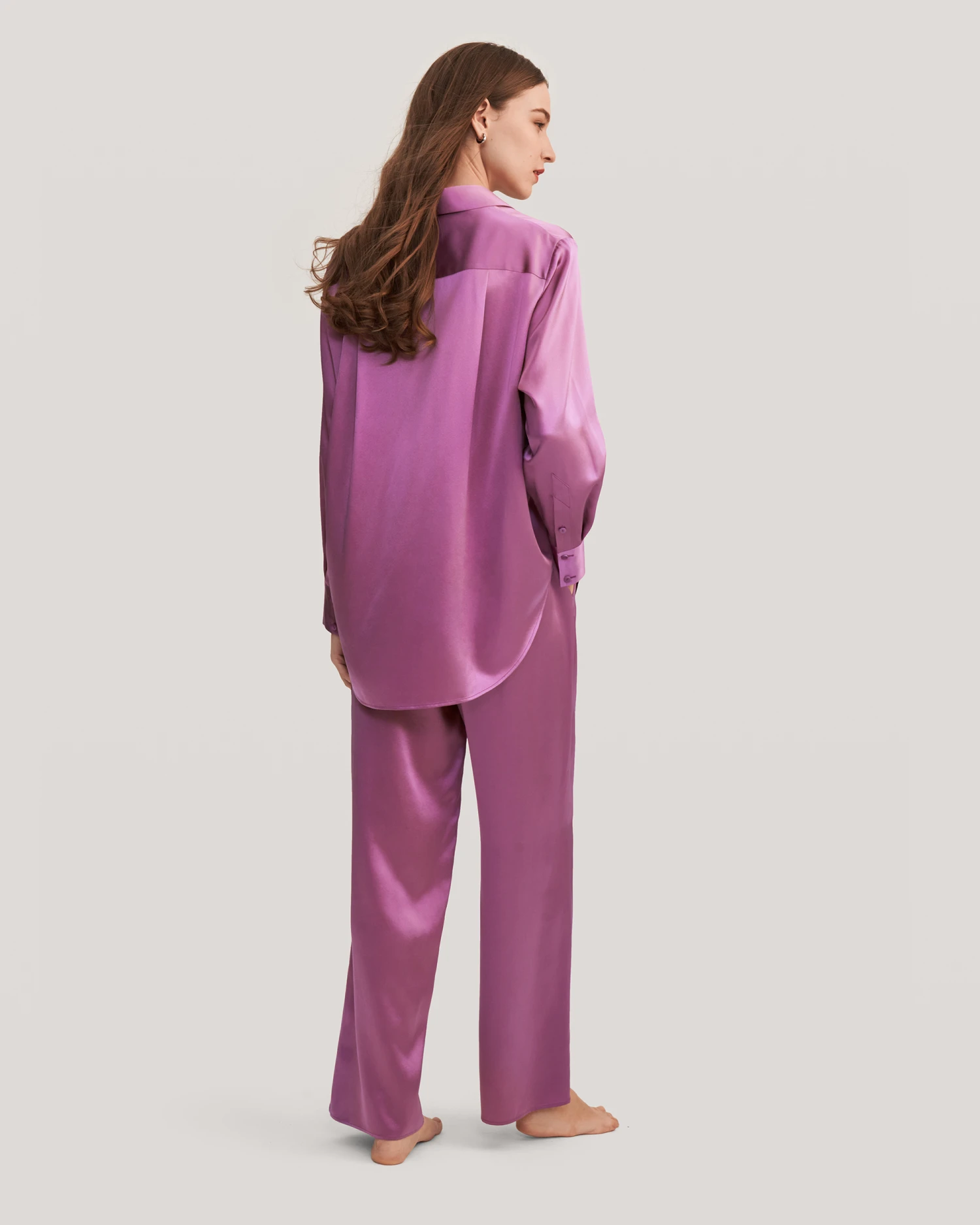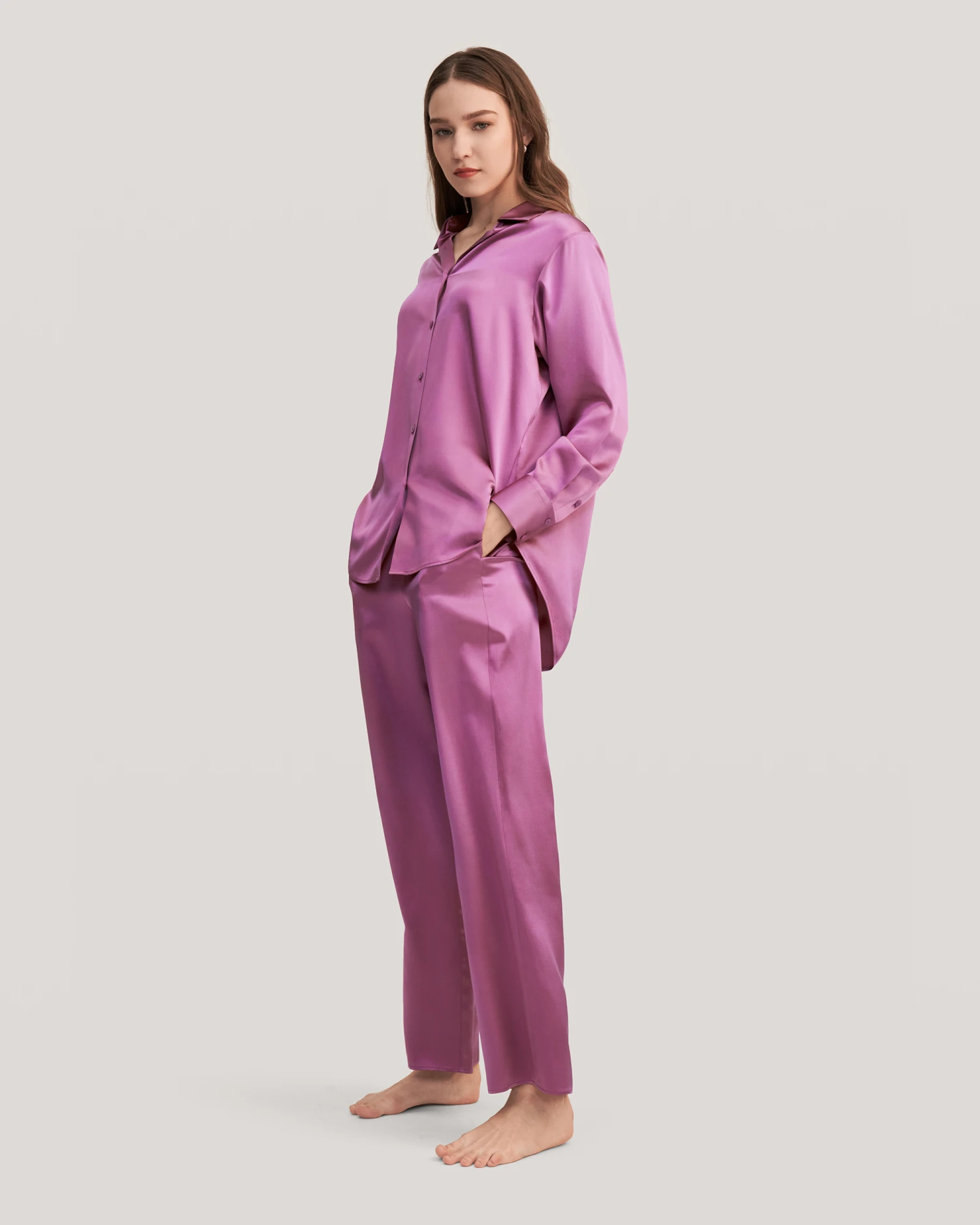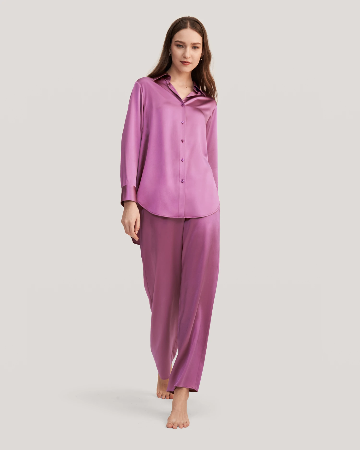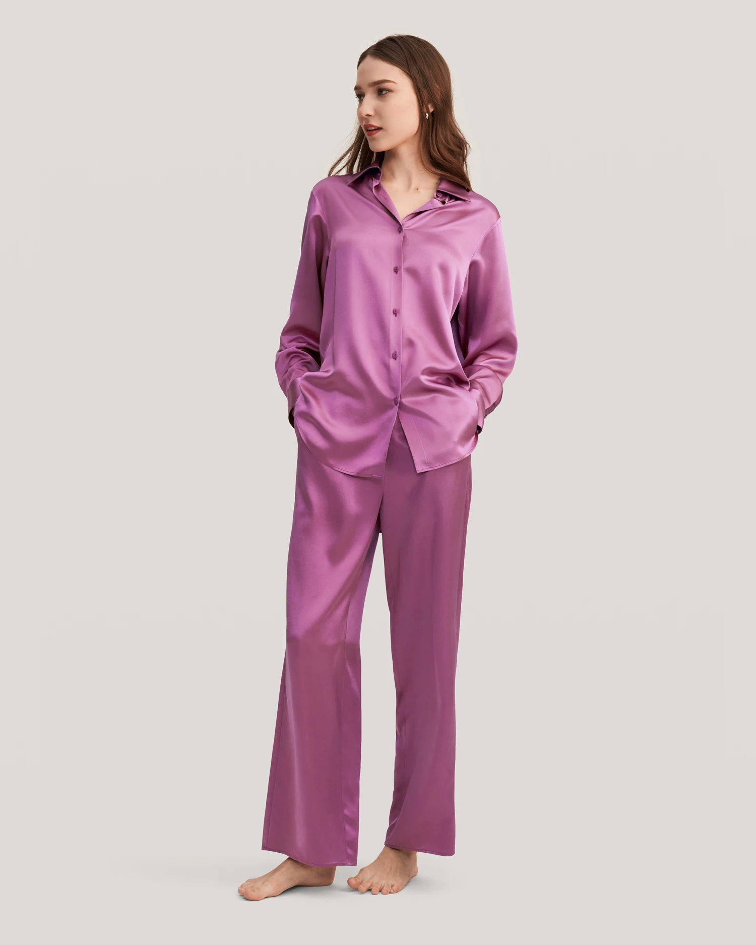 Relax into pillow-soft silk in our Viola oversized silk pajama set. A classic simple-yet-chic pajama set, say hello to sweet dreams (and sweet comfort) in a lounge-worthy button down shirt inspired by our popular SOS (silk oversized shirt) and coordinating drawstring pants.