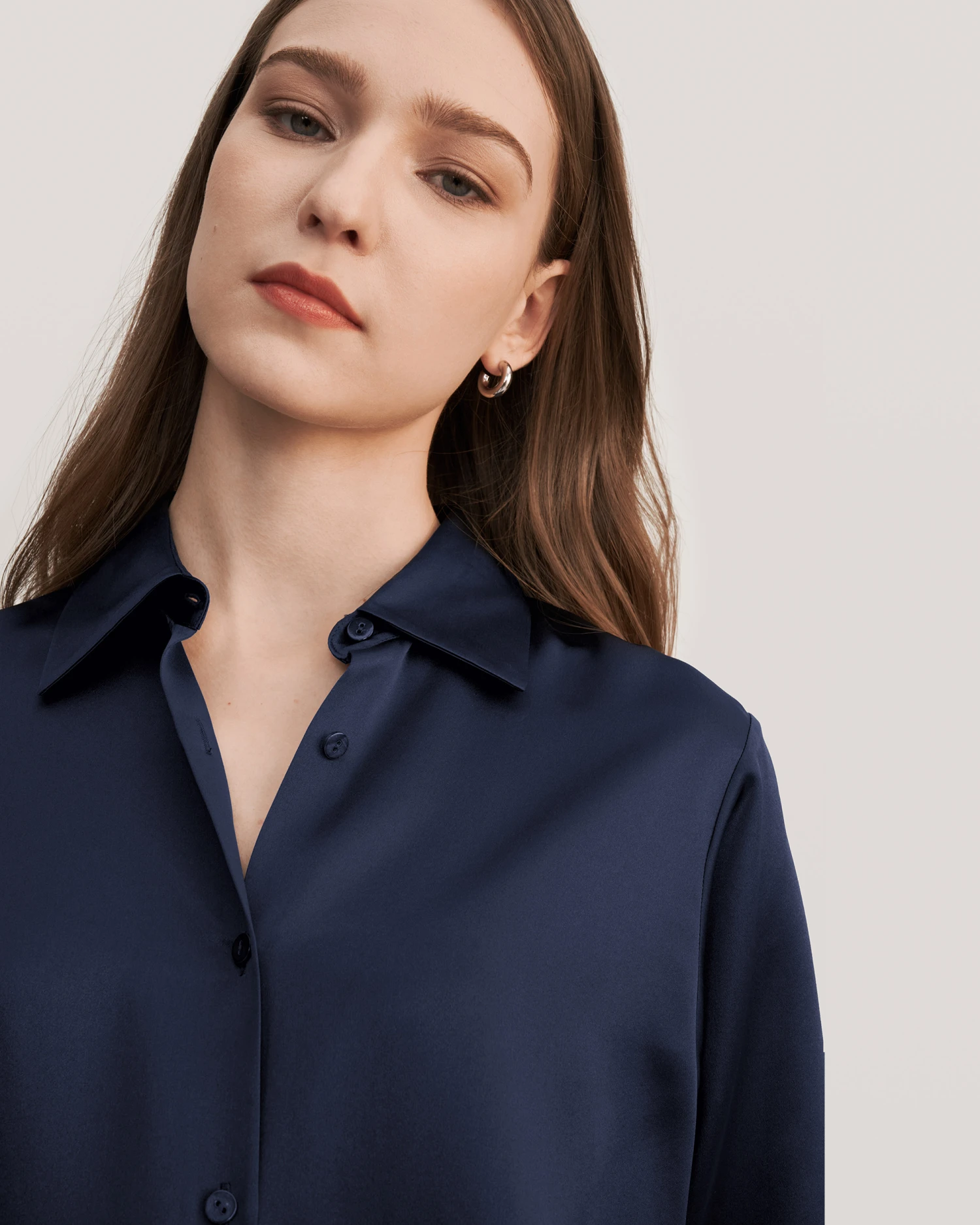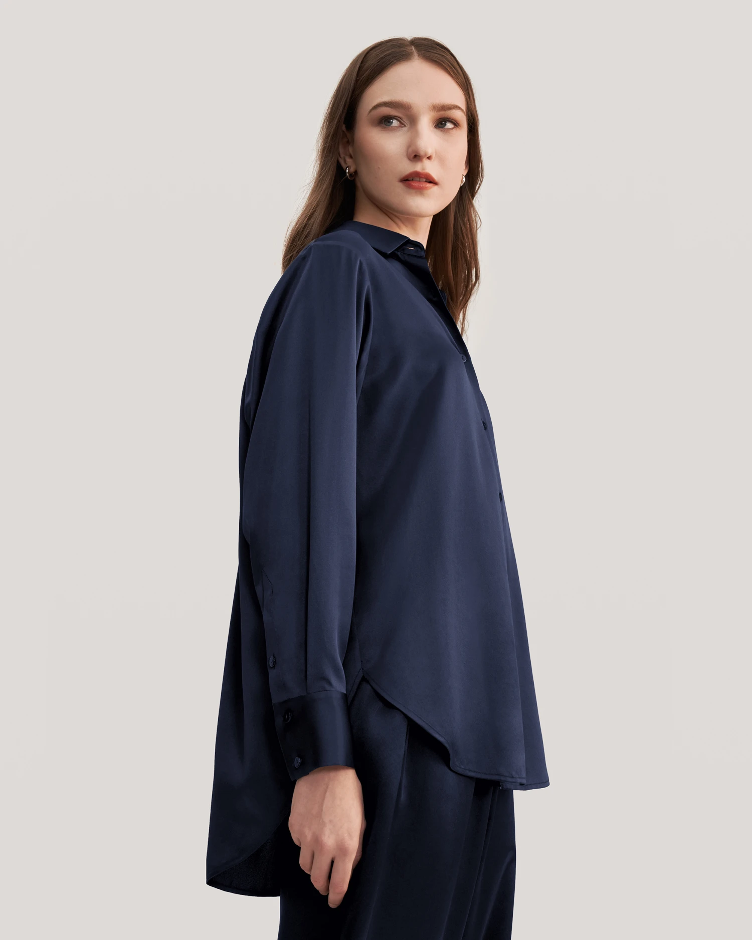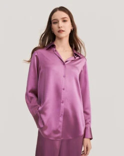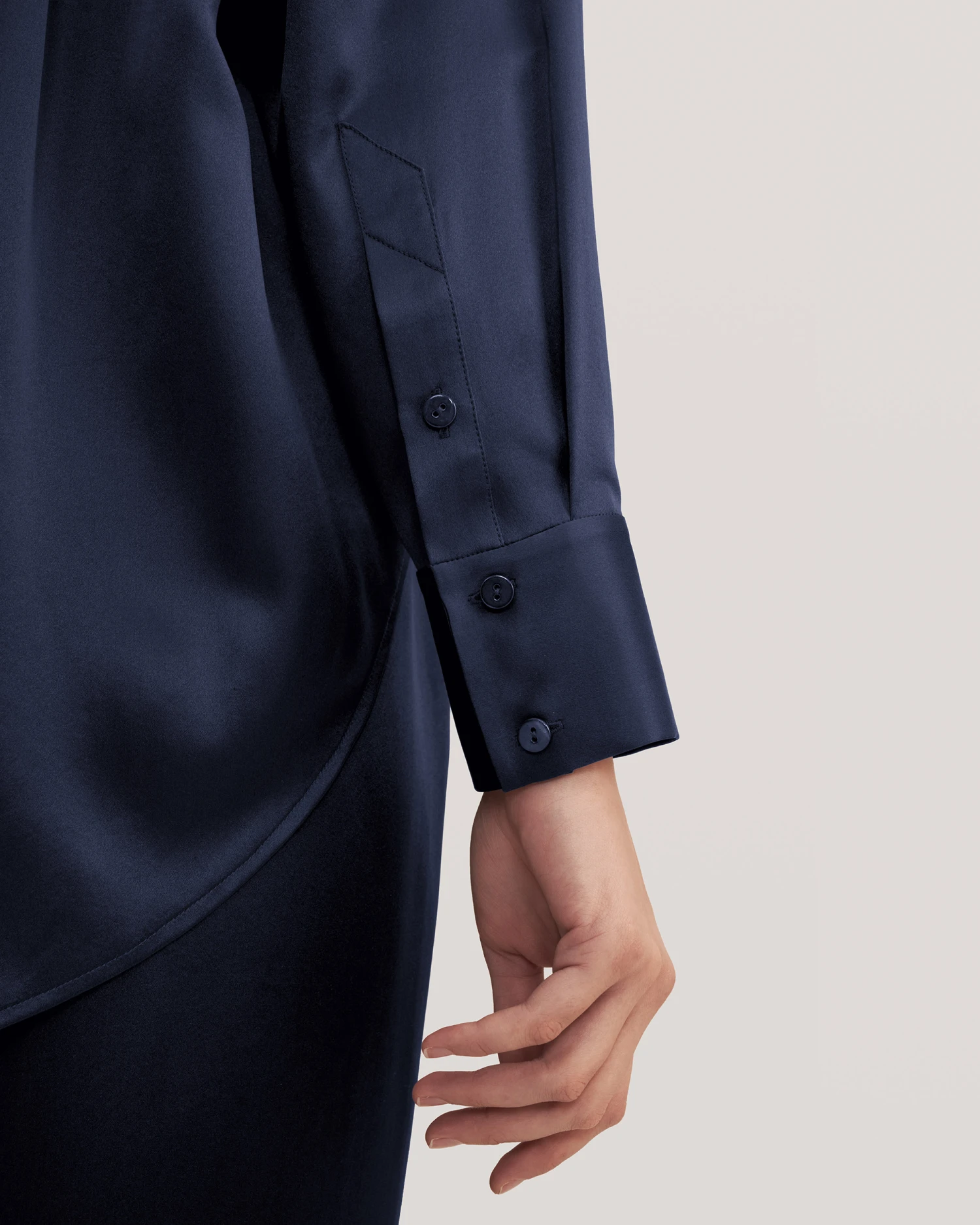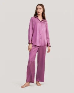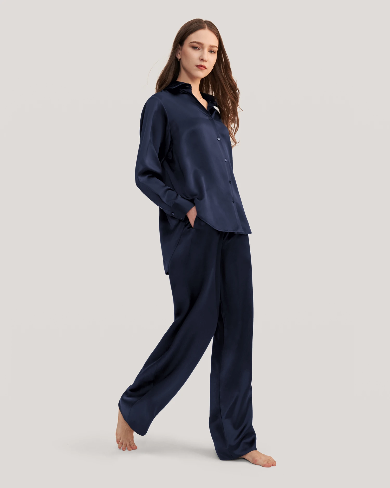 Relax into pillow-soft silk in our Viola oversized silk pajama set. A classic simple-yet-chic pajama set, say hello to sweet dreams (and sweet comfort) in a lounge-worthy button down shirt inspired by our popular SOS (silk oversized shirt) and coordinating drawstring pants.