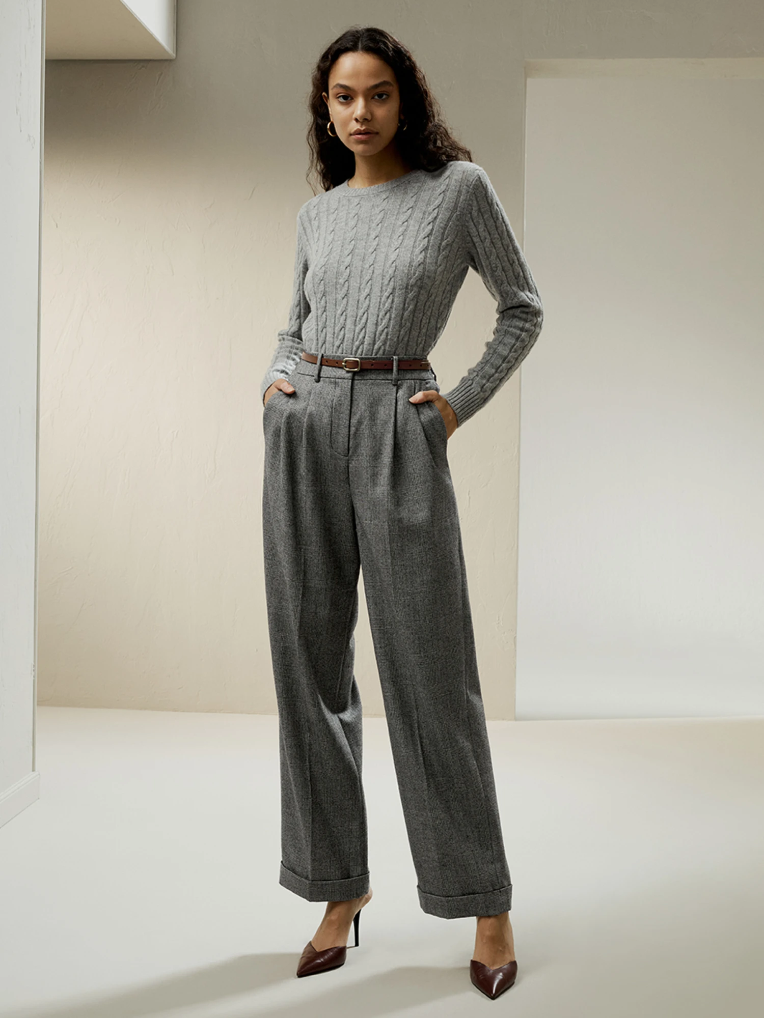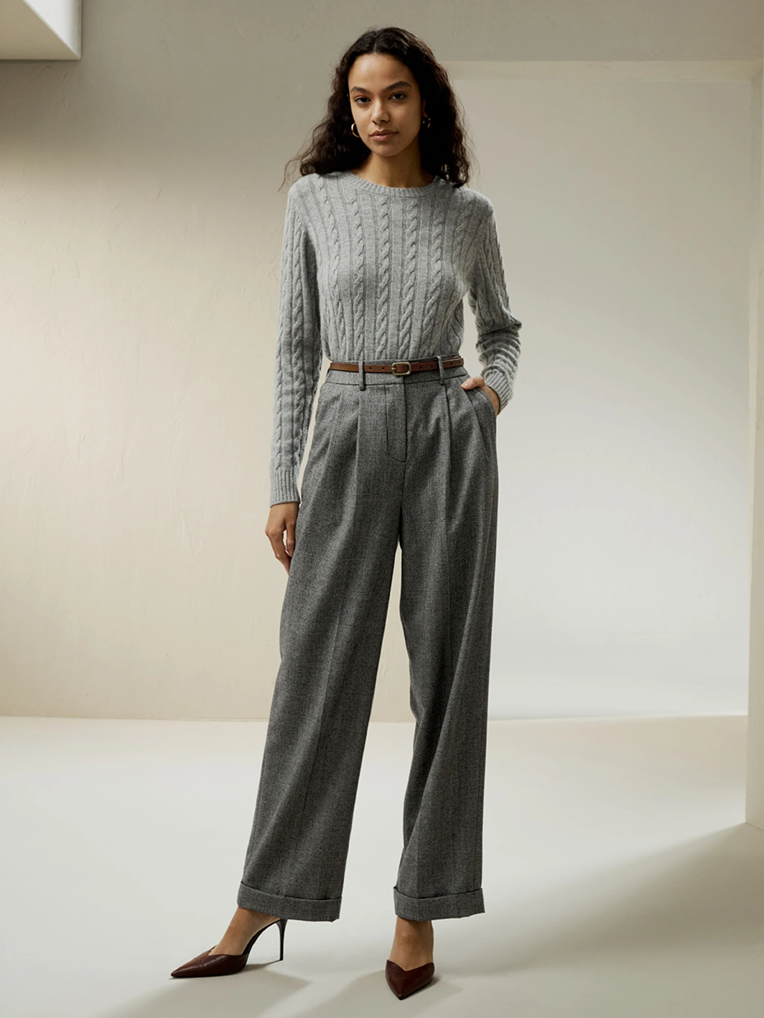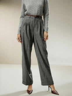 Wide-leg wool-flannel suit trousers are made of 100% wool and are covered in fluff, affording a rustic look and a soft hand. Flannel has good elasticity and stores heat and insulates against the cold, which is lightweight, durable, and glossy, good to drape. The trousers are less prone to pilling or deformation. It is perfect for work environments that require business attire, such as offices and professional settings.