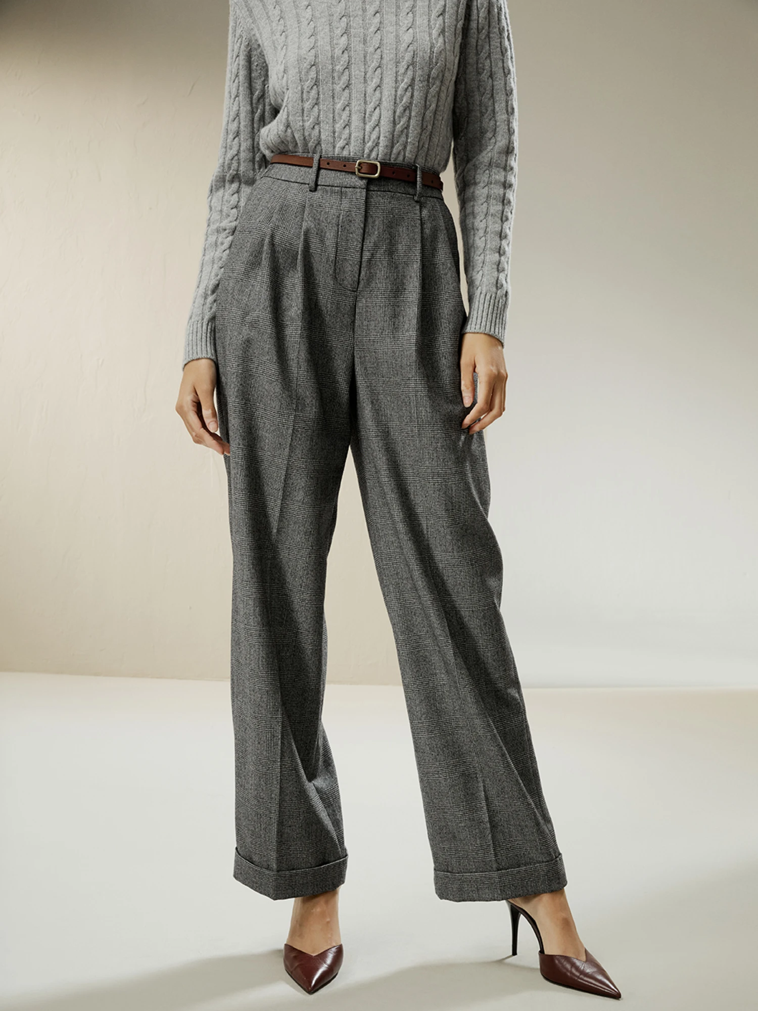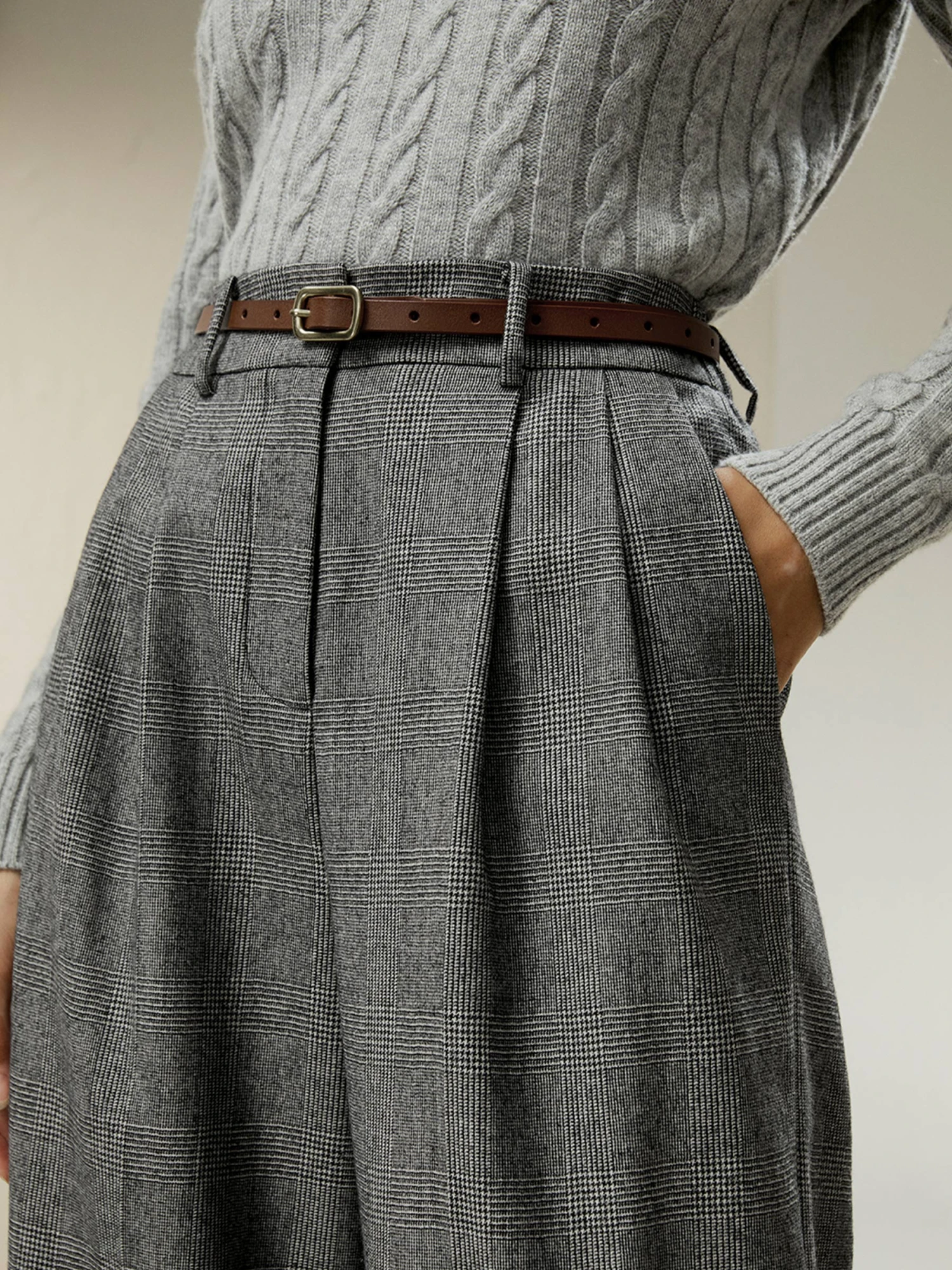 - Wide hem and glen plaid