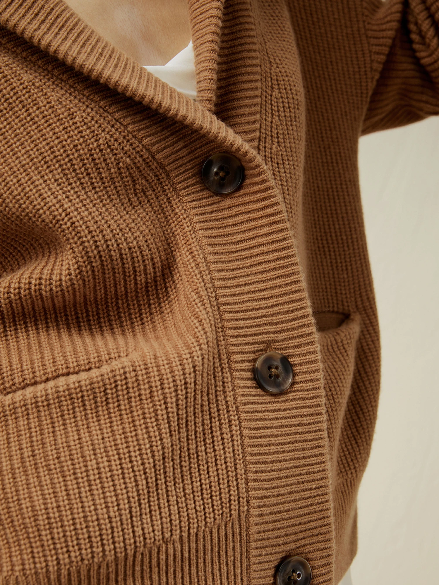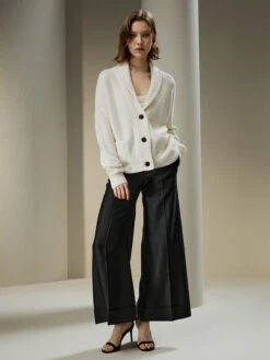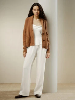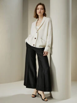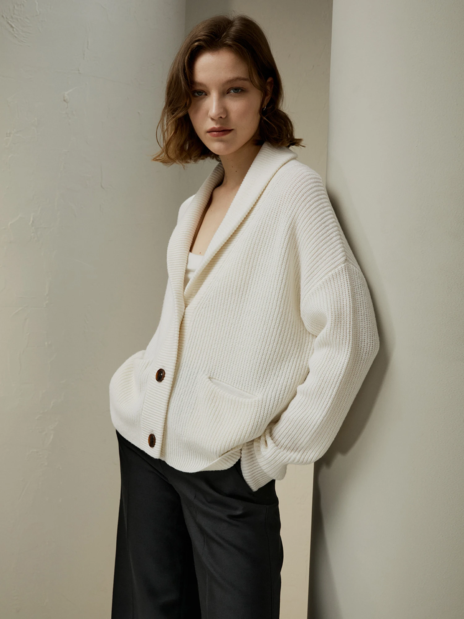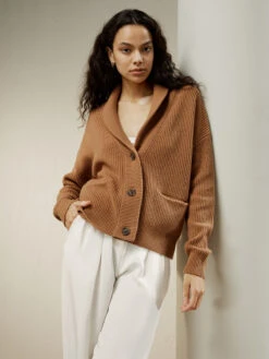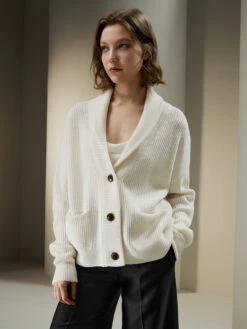 This slouchy cardigan is blended with soft and warm wool and cashmere. The gently cropped silhouette is framed by a shawl collar and dropped shoulder seams, with generously big pockets, making for the coziest sweater.